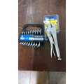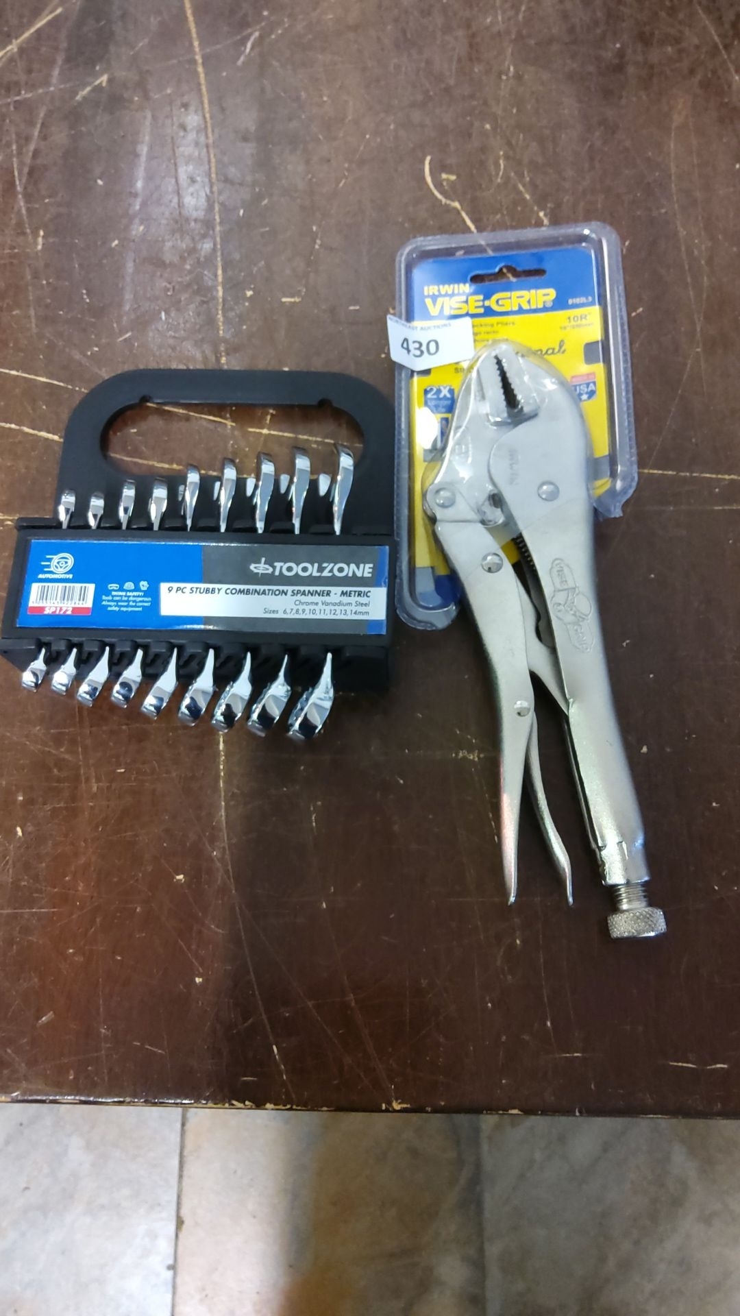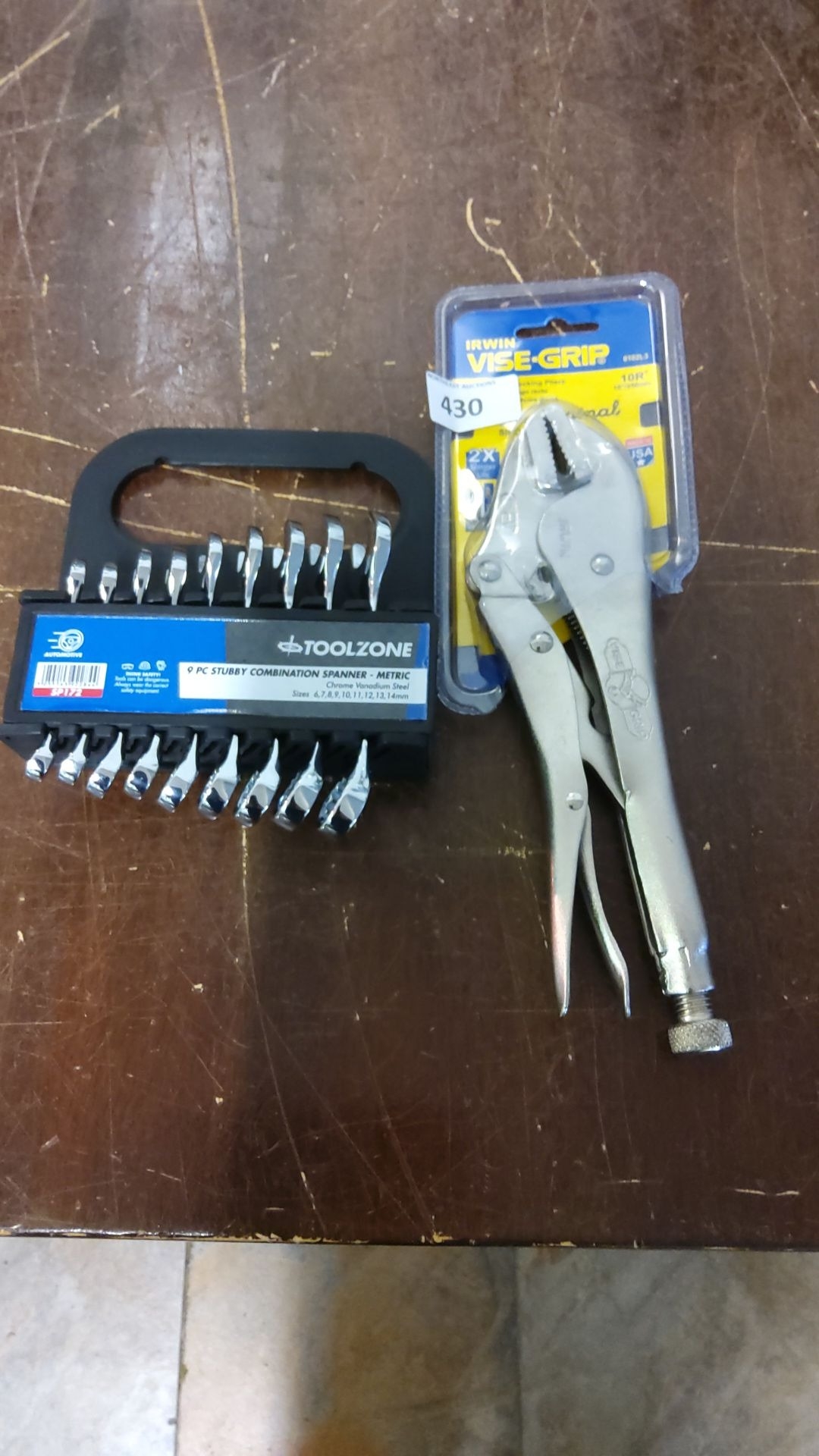 Toolzone 9-piece Stubby Combination Spanner Set includes sizes 6-14mm, made of chrome vanadium steel. Irwin Vise-Grip 10-inch locking pliers.