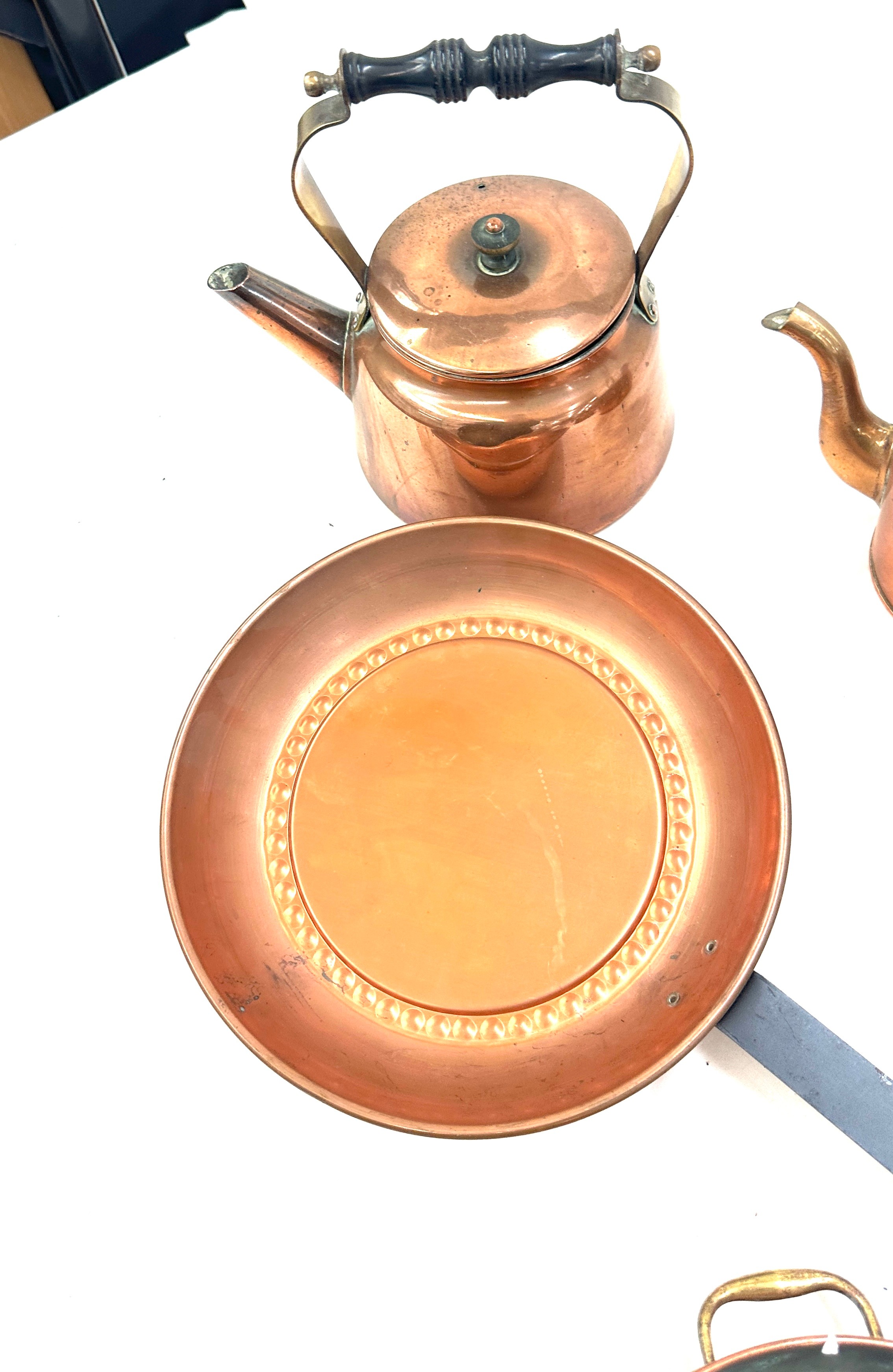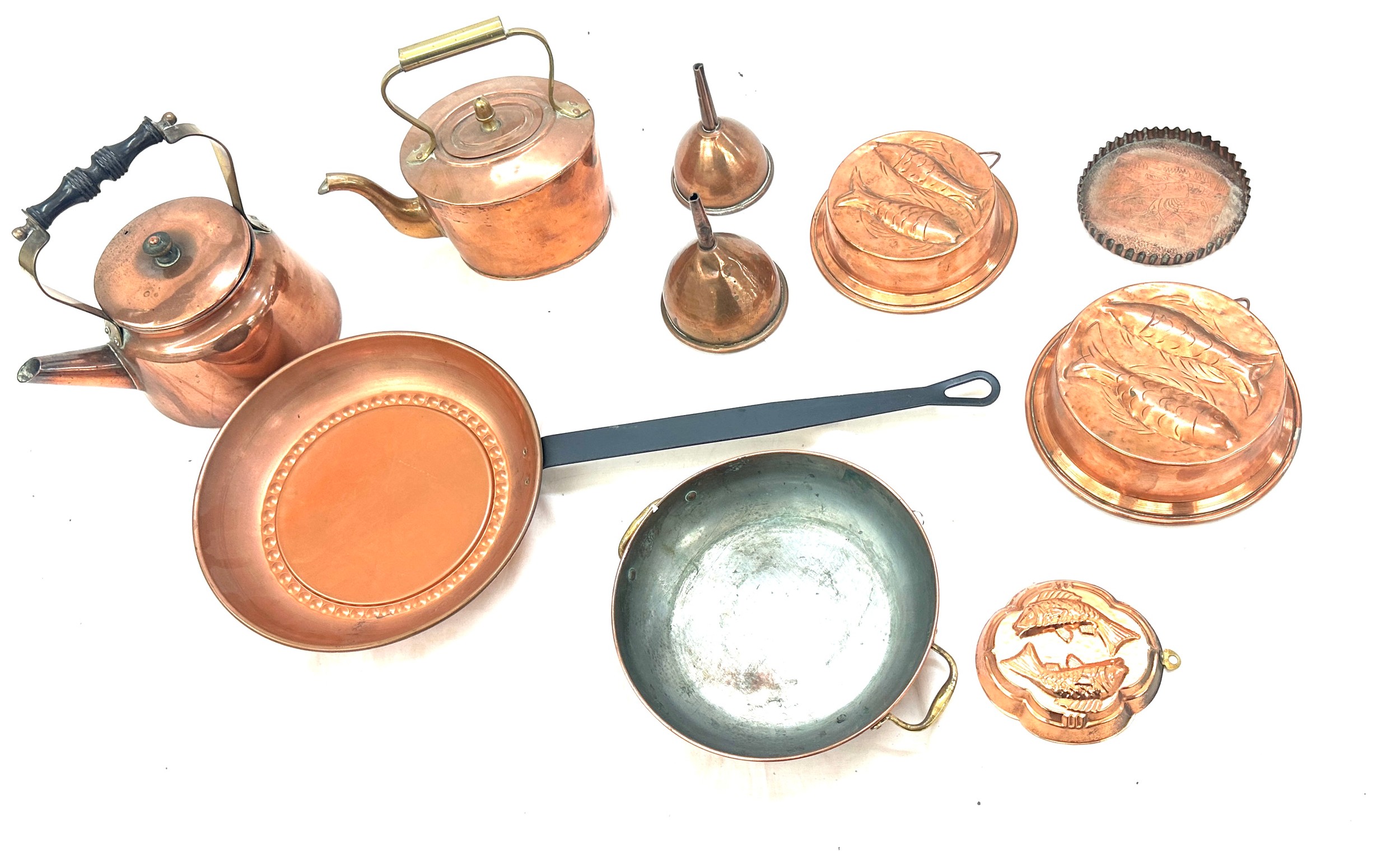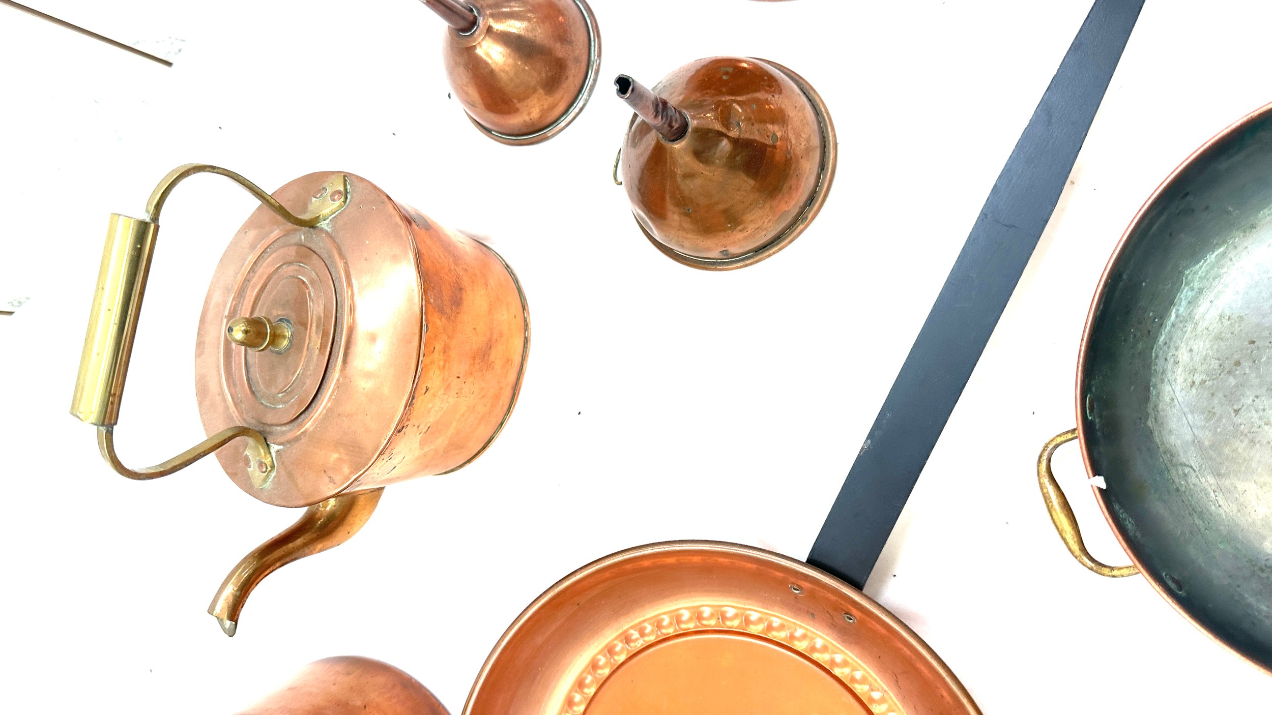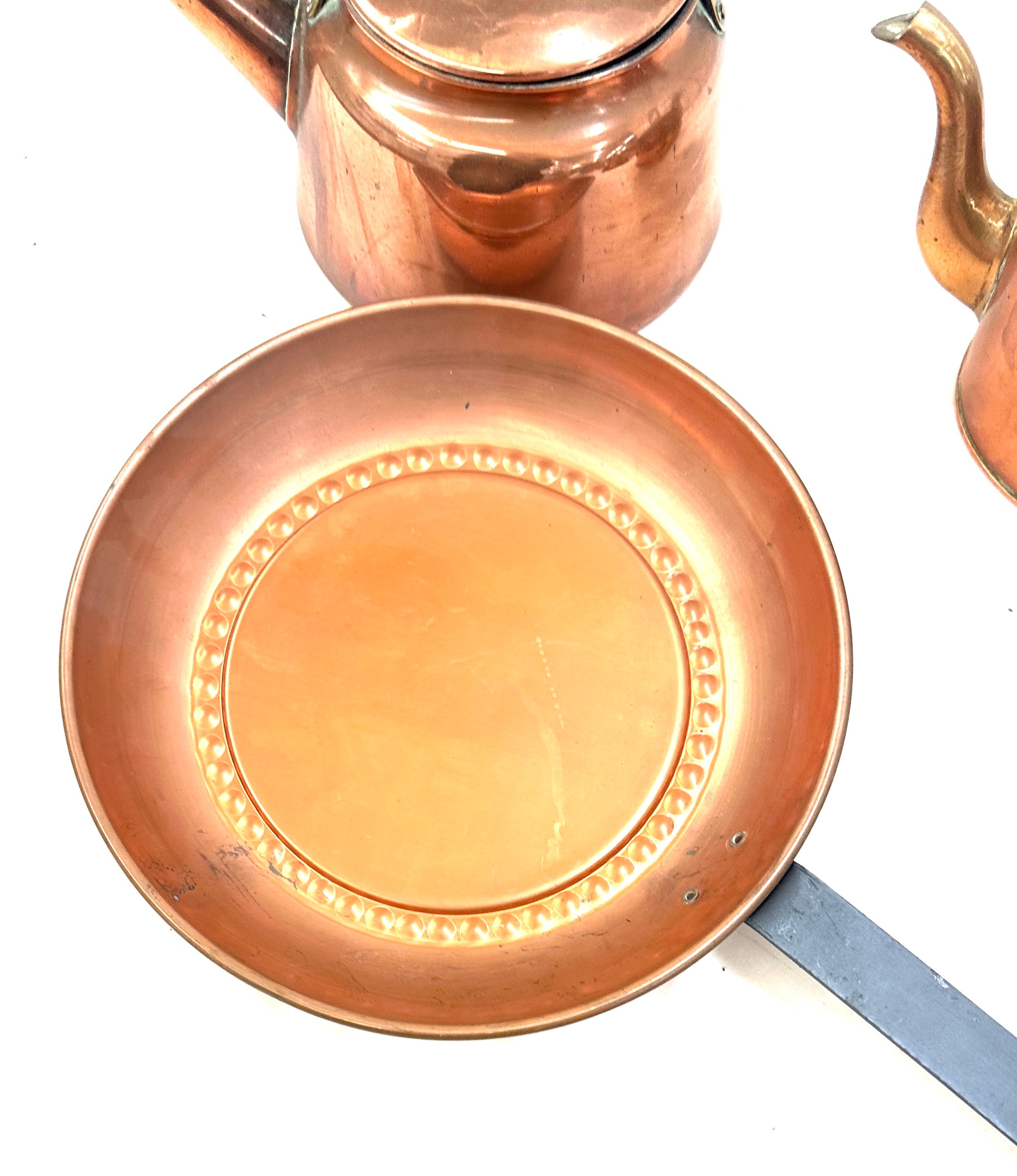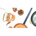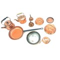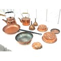 Selection of copper metal ware to include kettles, pans, etc