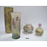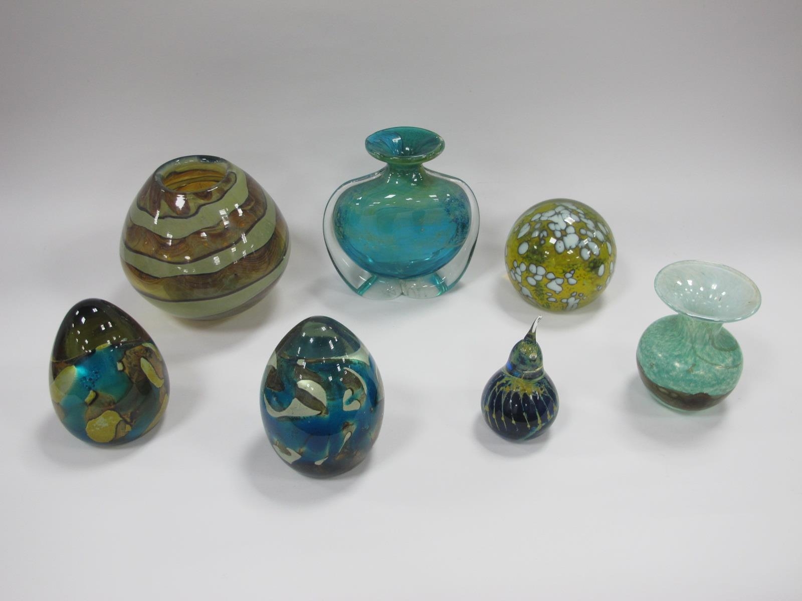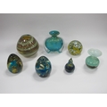 Mdina Glass, including wavy banded wide ovoid vase, green and turquoise mottled vases, four paperweights, each signed 'Mdina' (7).
