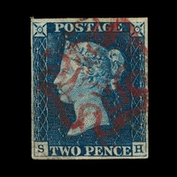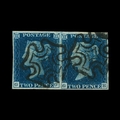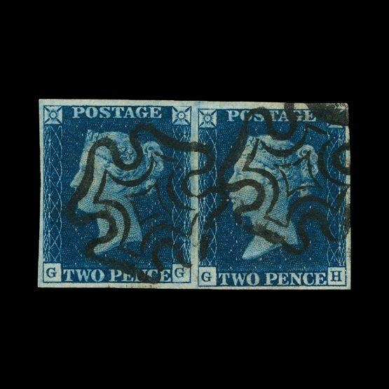 Great Britain - QV (line engraved) : (SG 4) 1840 2d deep blue, plate 2, horizontal pair, GG-GH, good margins all around, crisp black MC cancels, very fresh, v.f.u. Cat. pro rata £3250. (image available) [US1]
