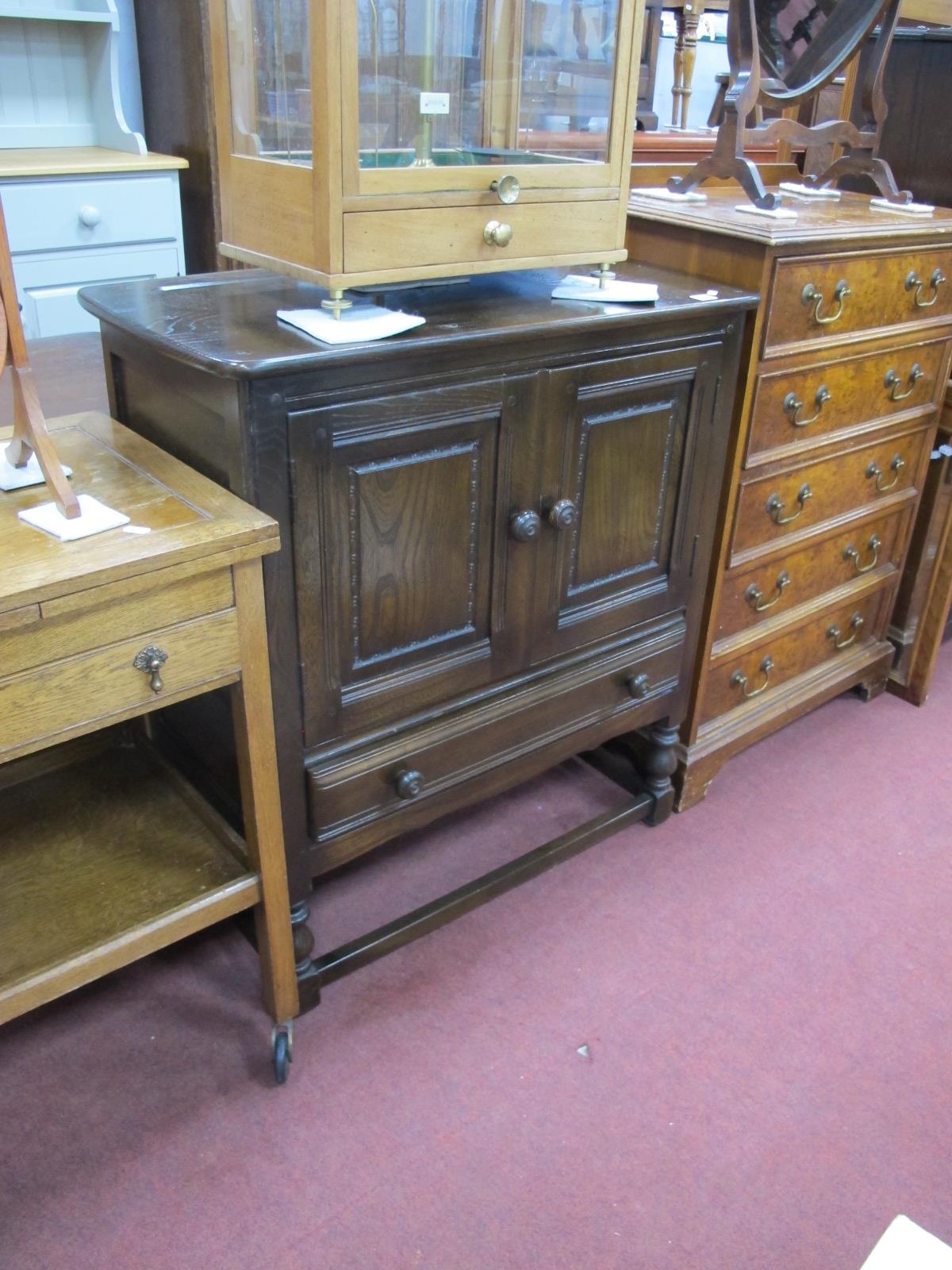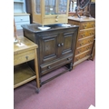 Ercol Dark Wood Small Cabinet, with twin doors over single drawer, on turned and block supports, 78.5cm wide.