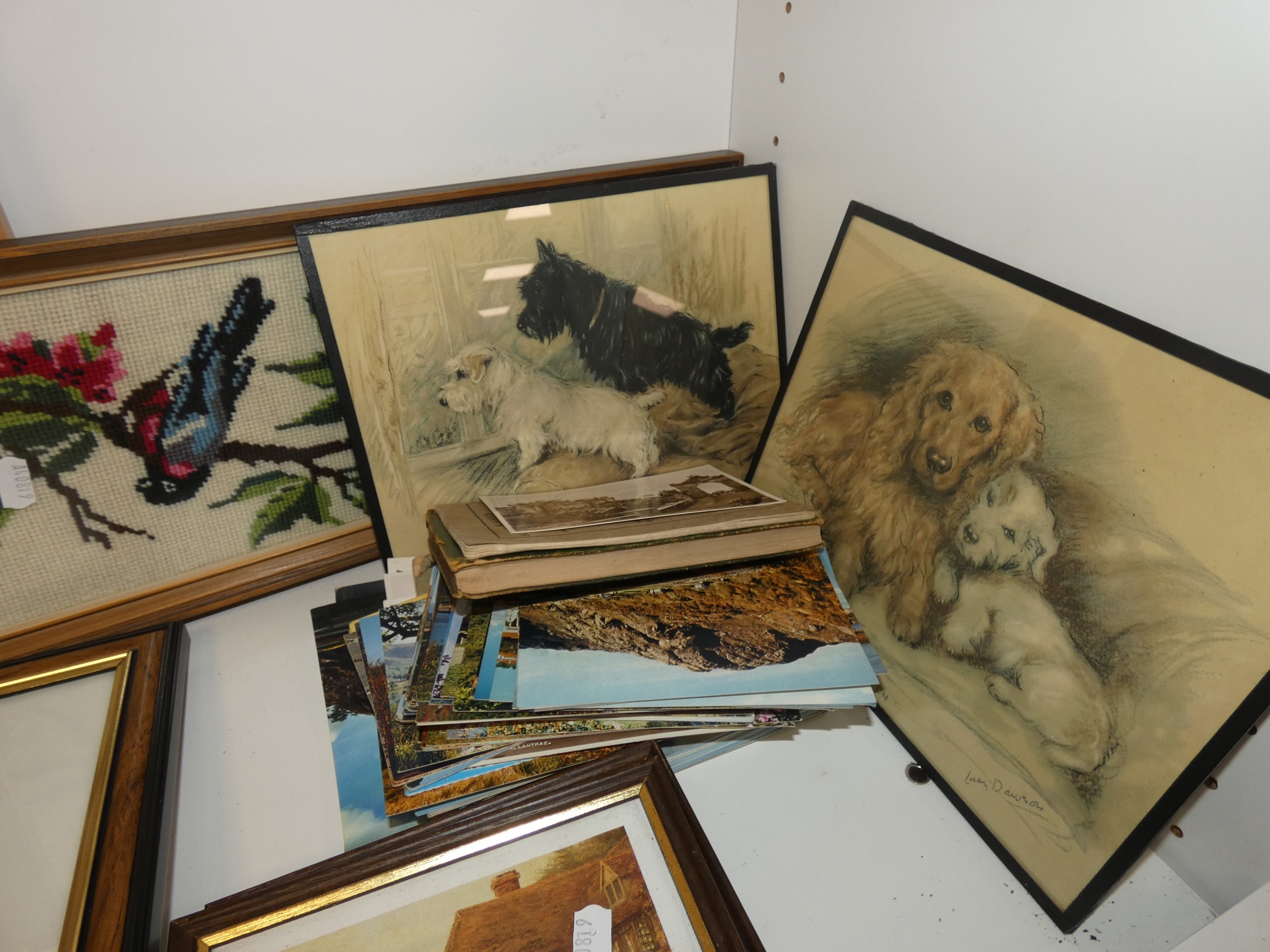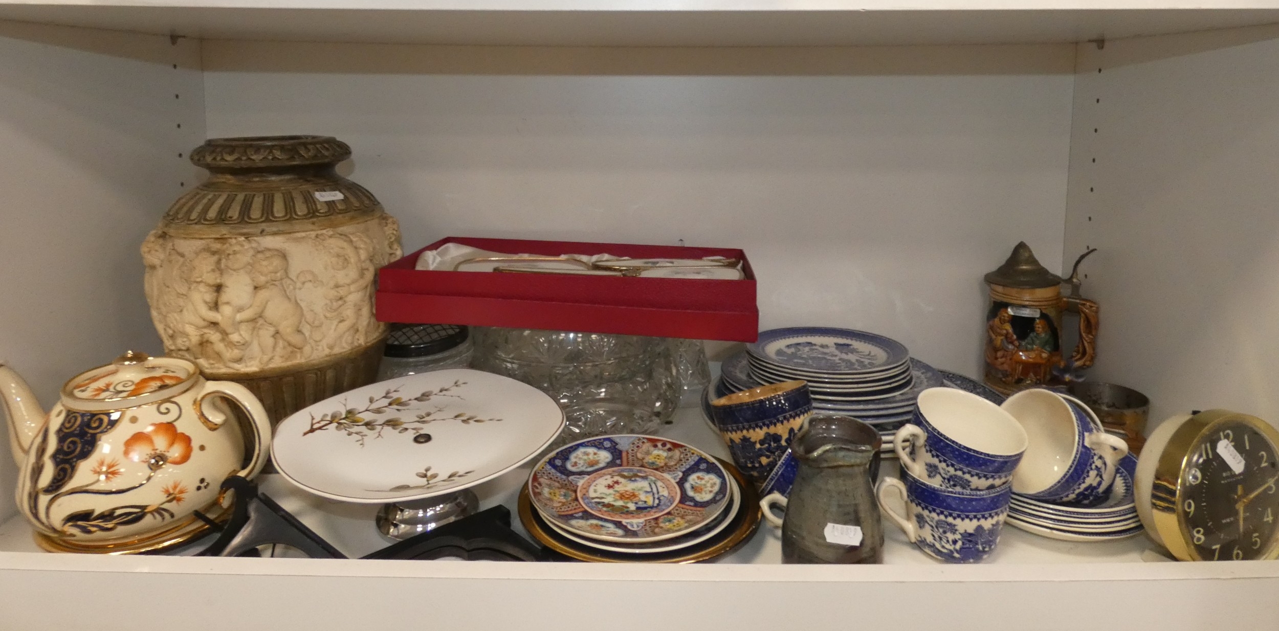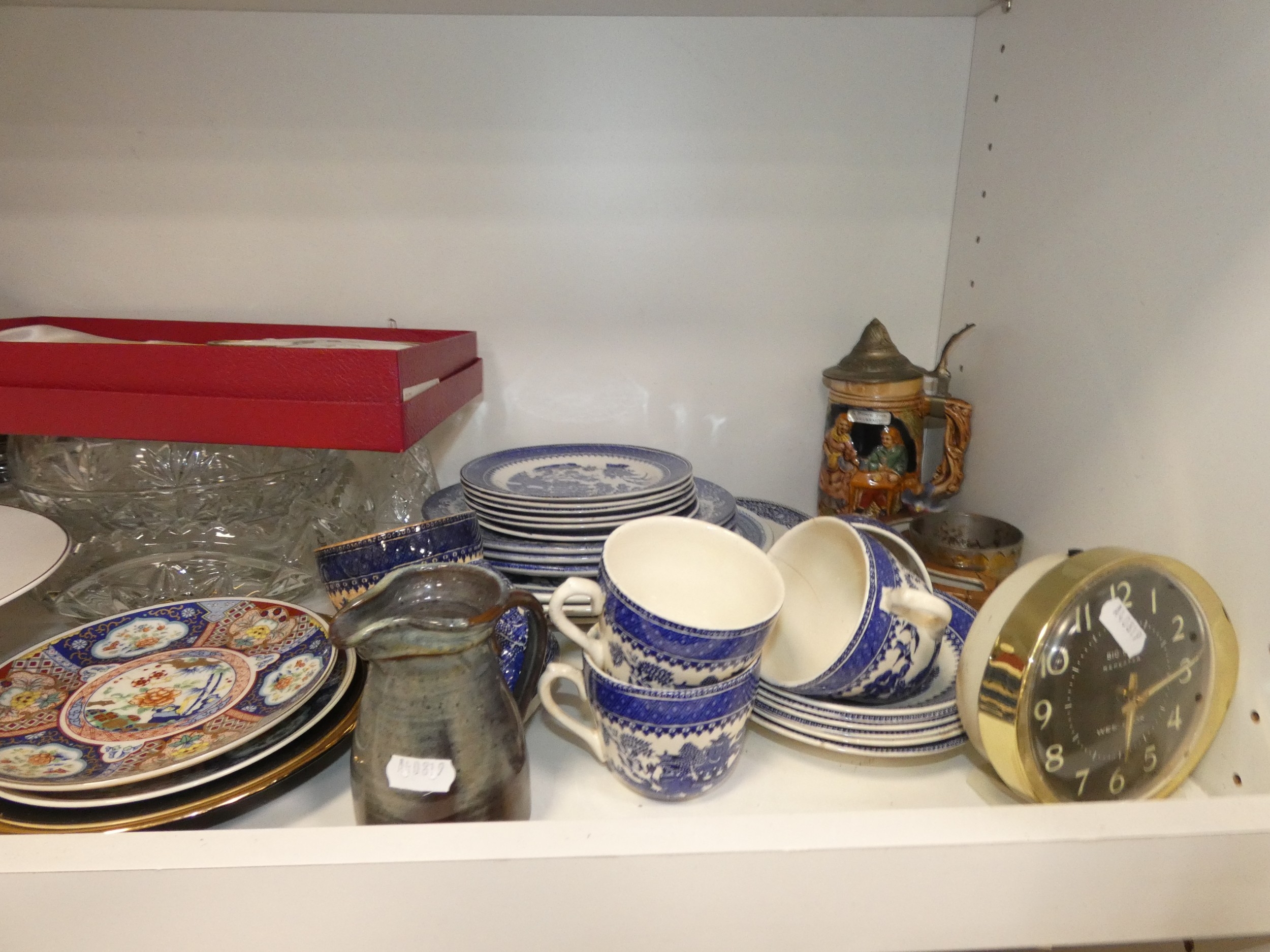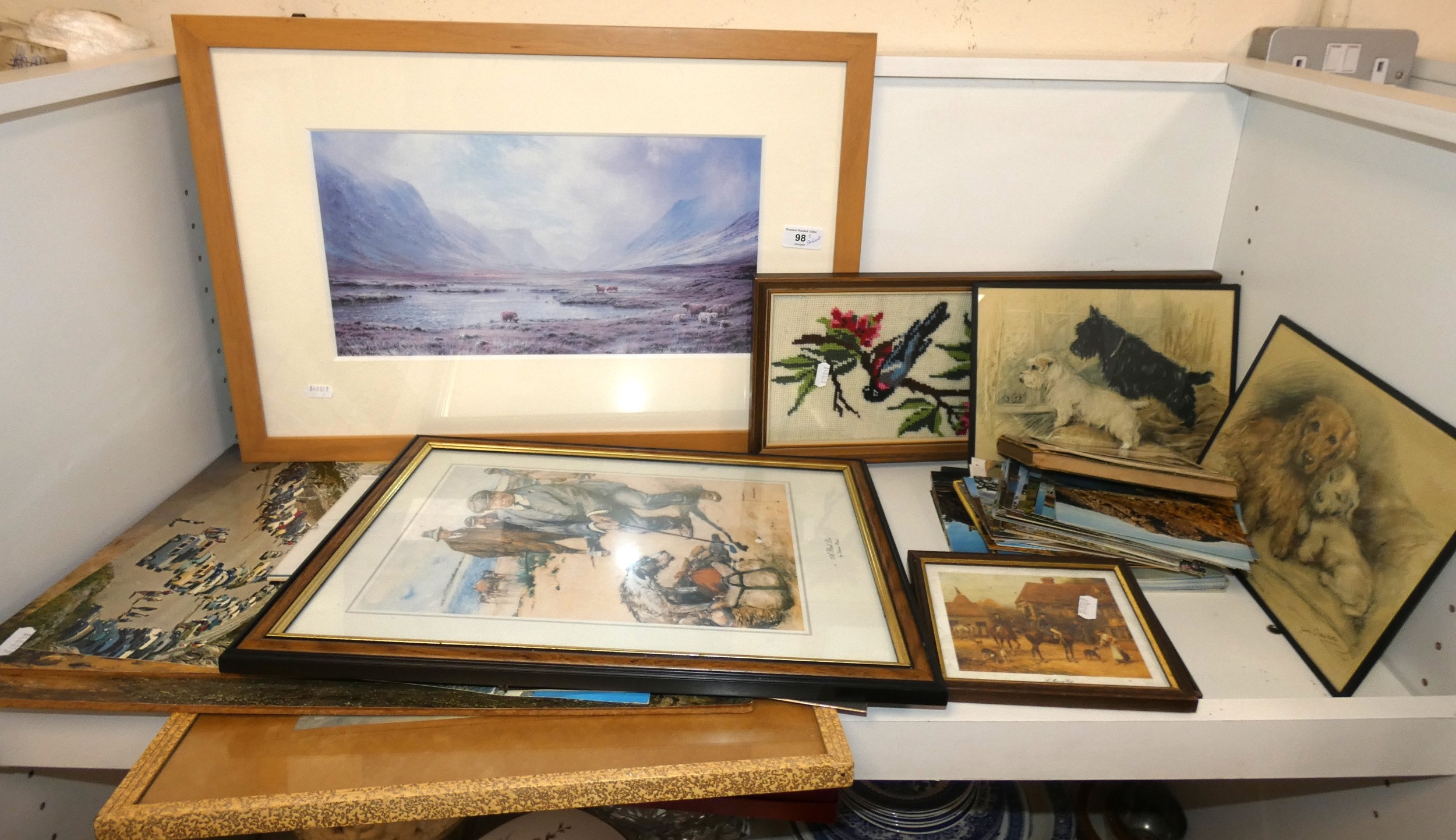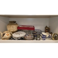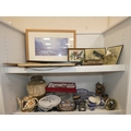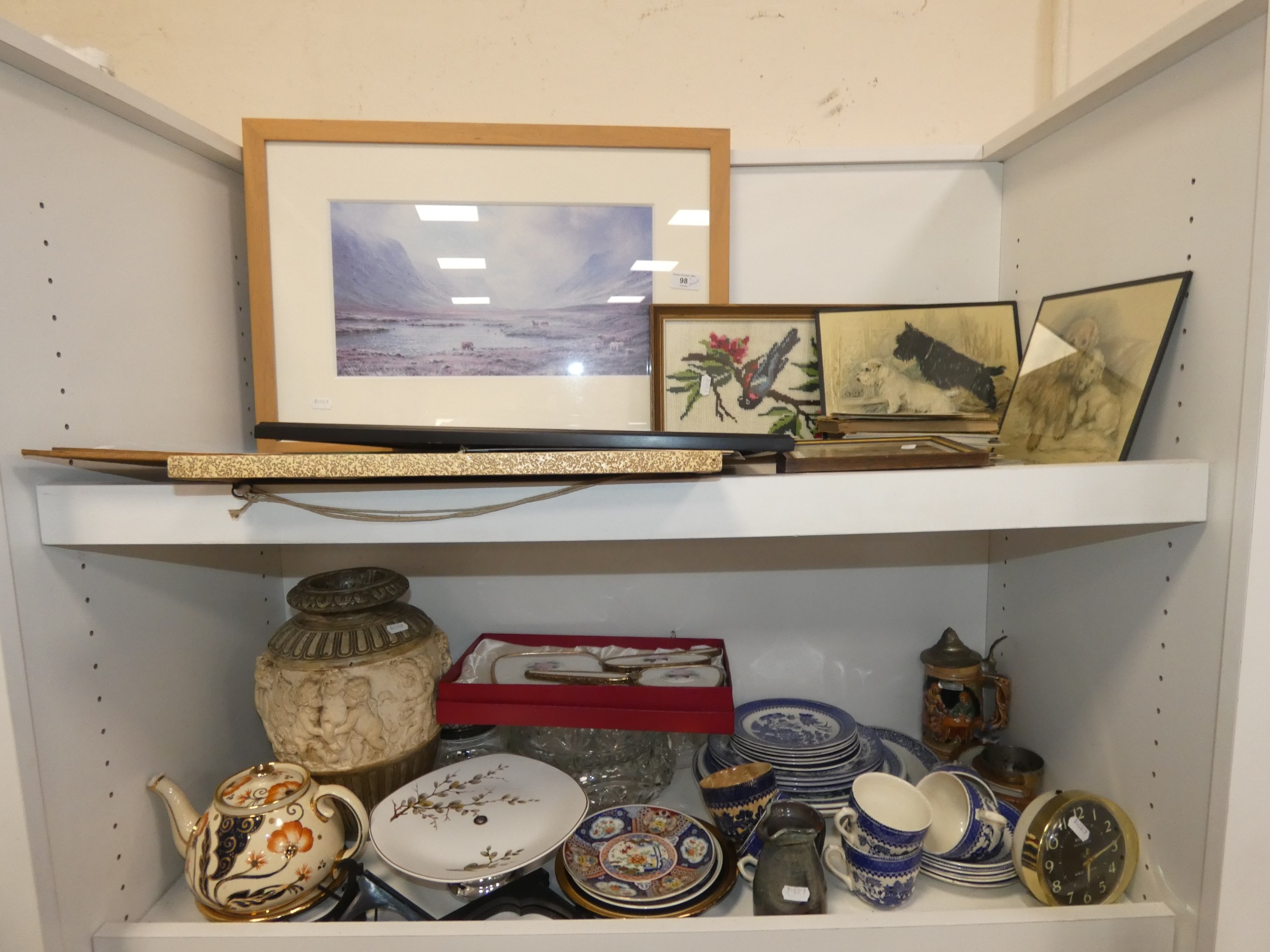 Two shelves of sundries to include prints, postcards, ceramics, Westclox clock, crystal etc.