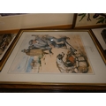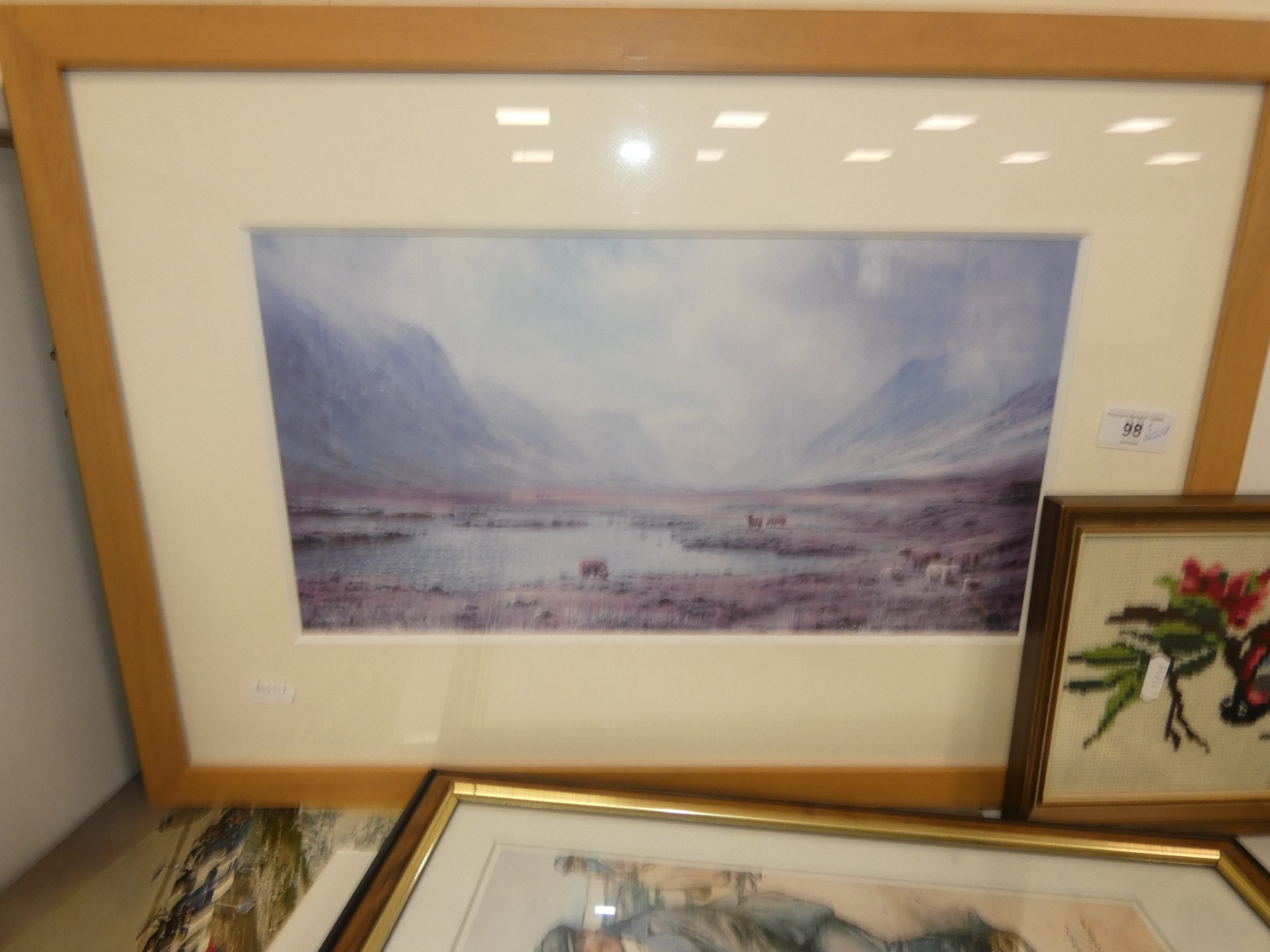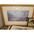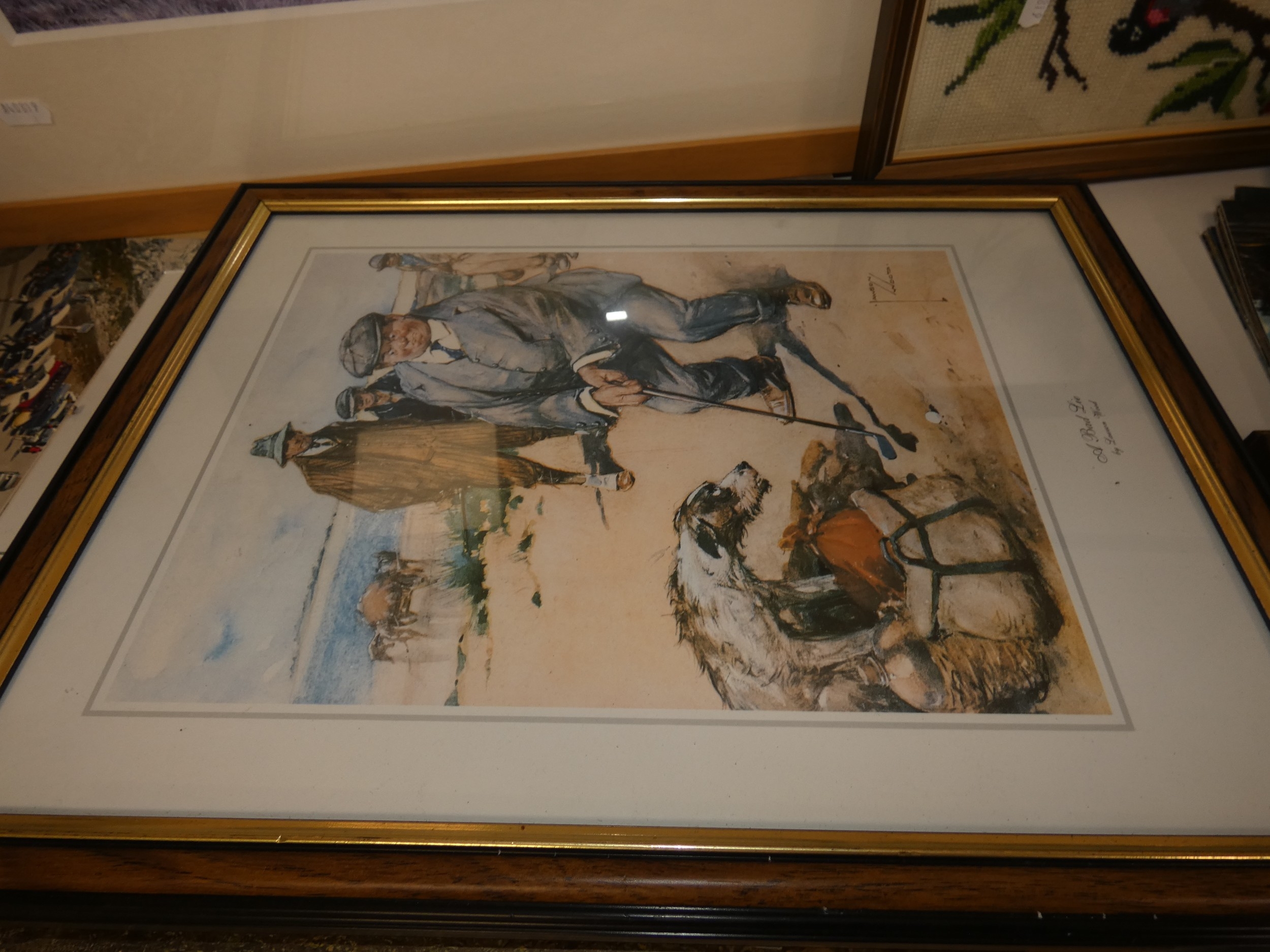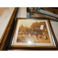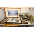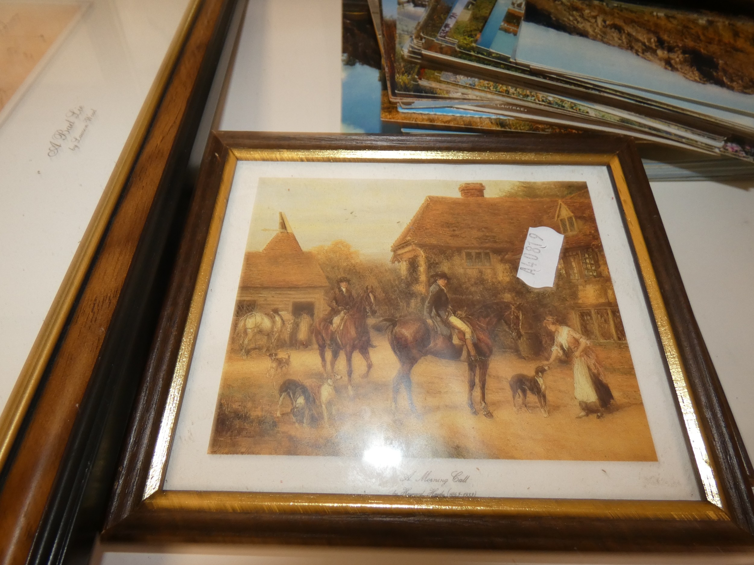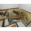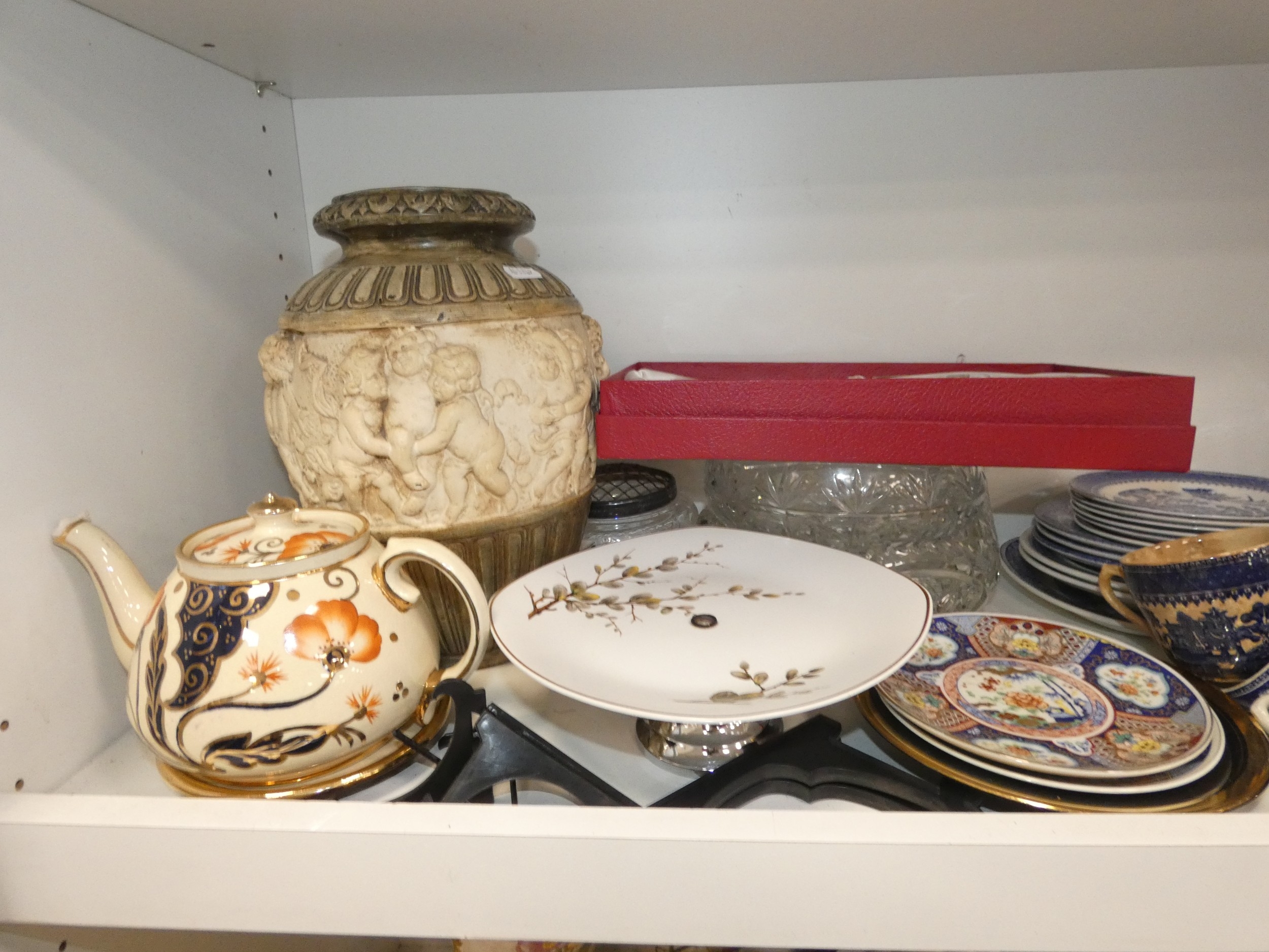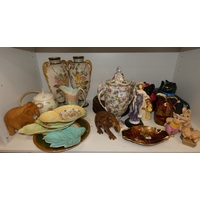 Two shelves of sundries to include prints, postcards, ceramics, Westclox clock, crystal etc.