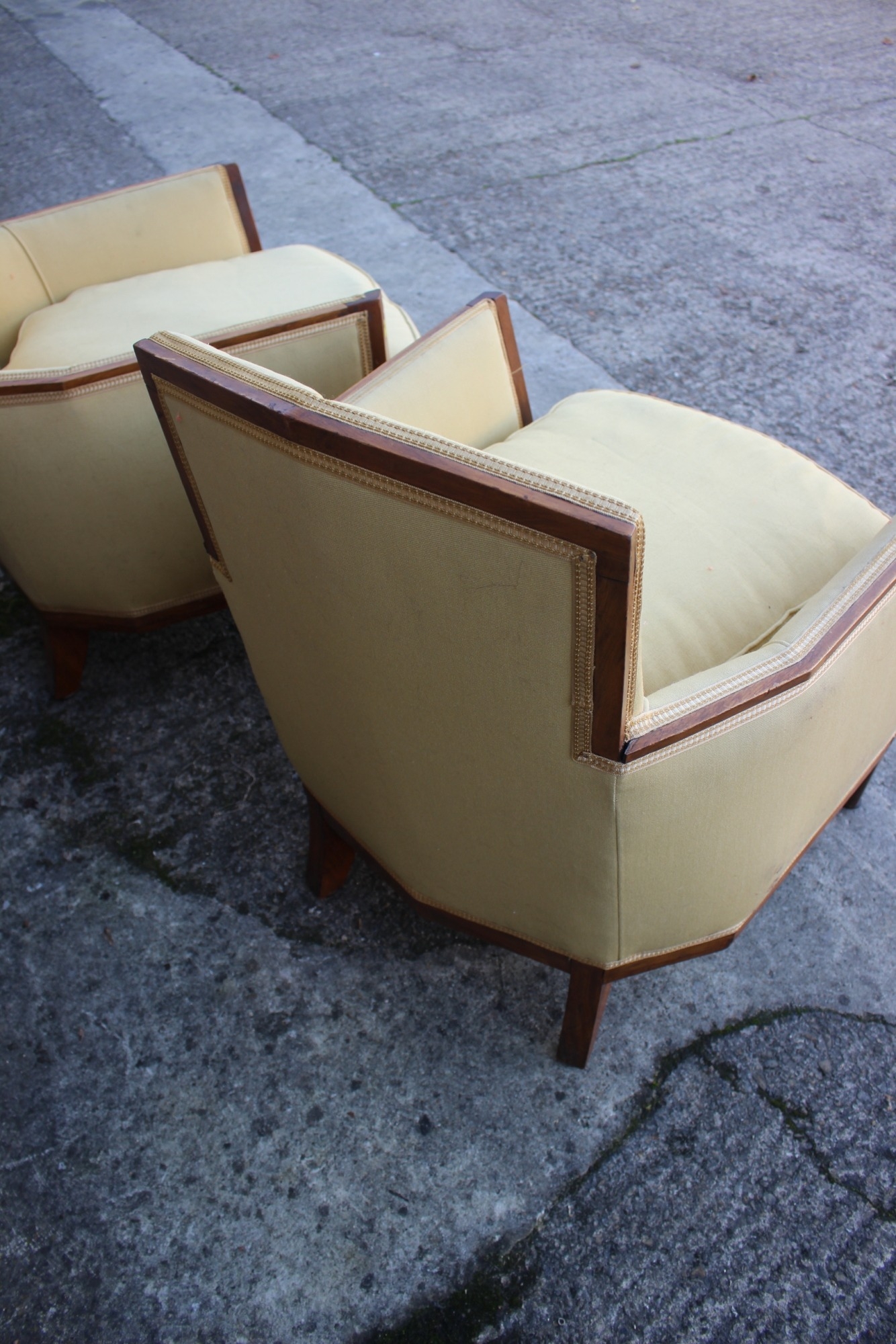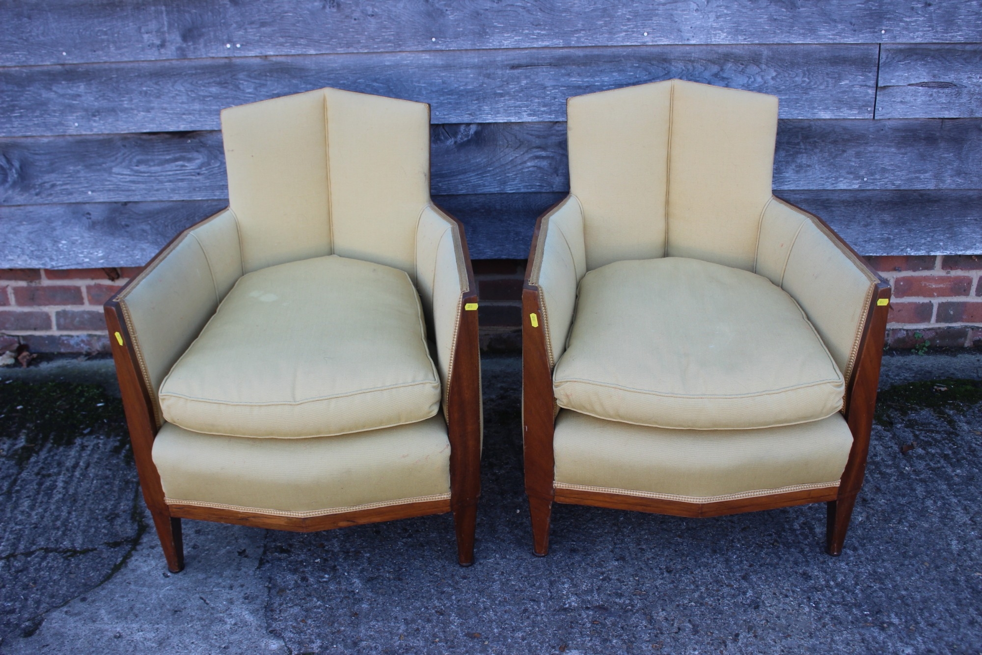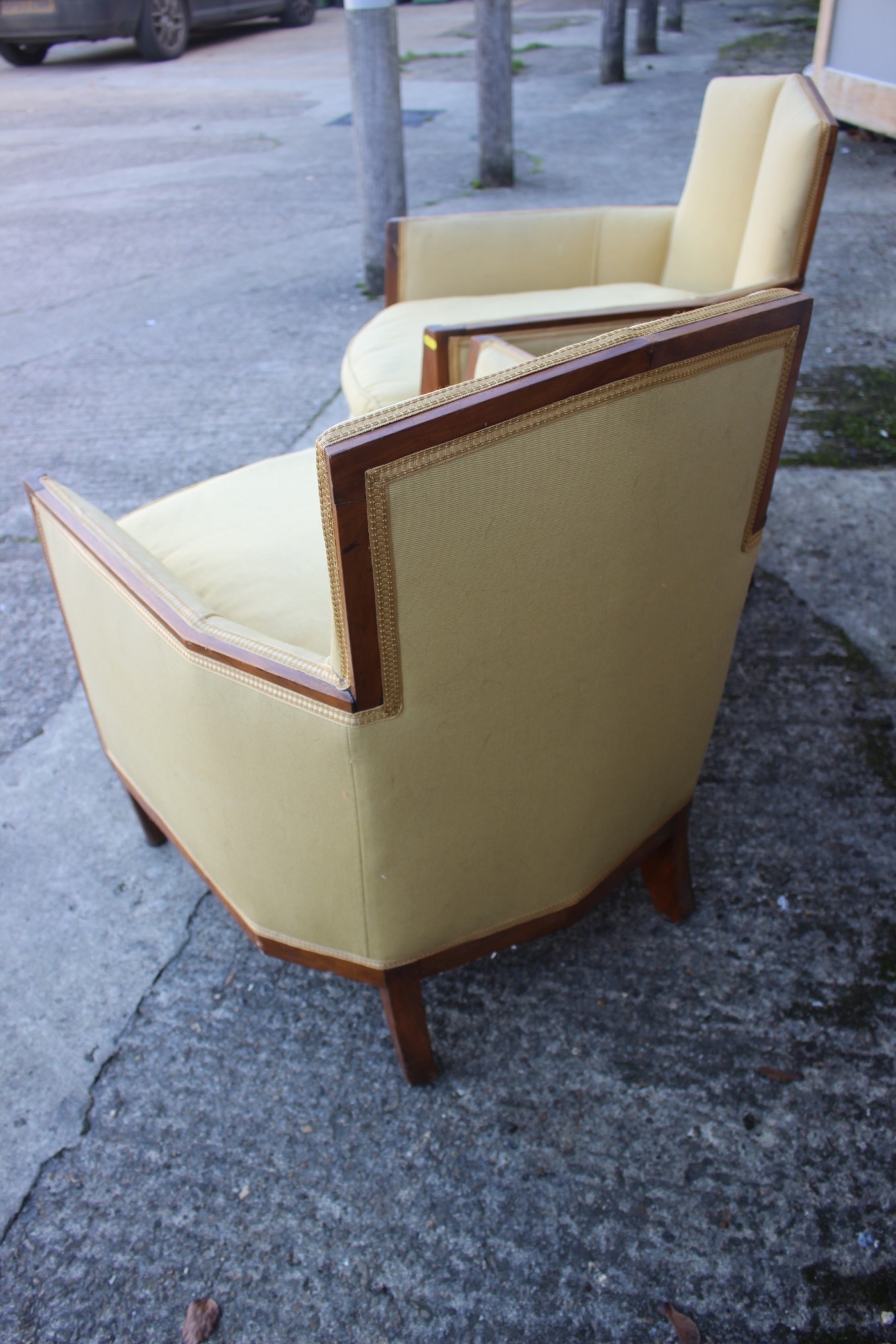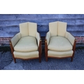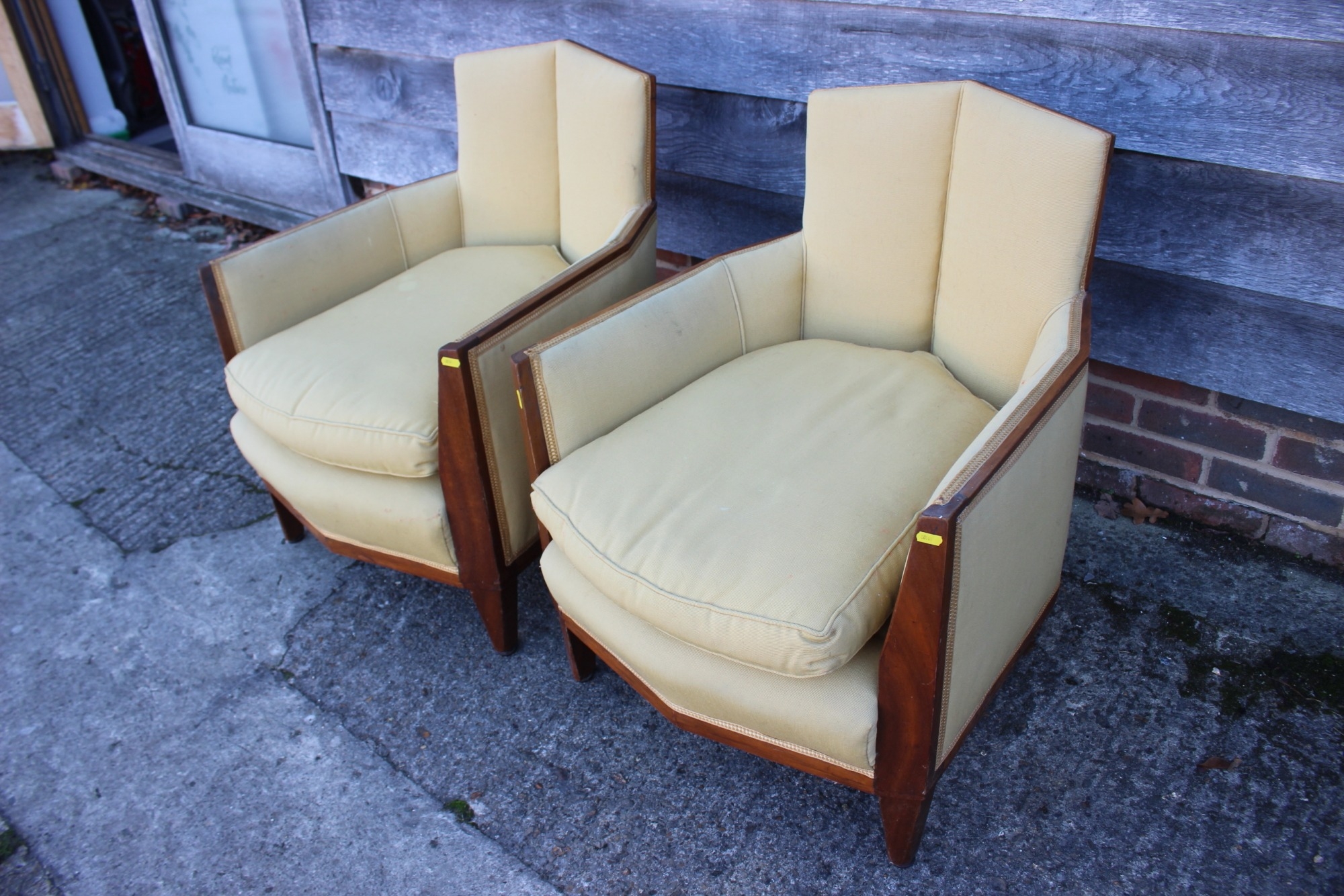 Manner of Emile Jacques Ruhlmann, a pair of Art Deco walnut framed tub armchairs, upholstered in gold material