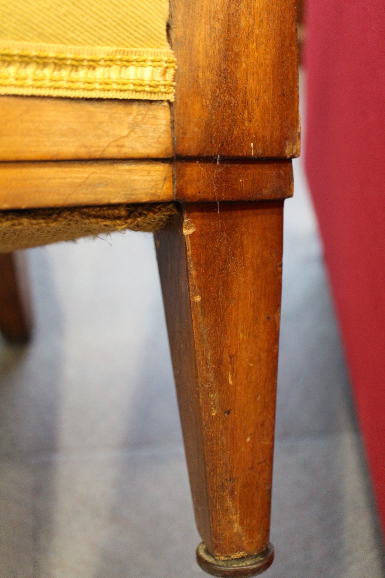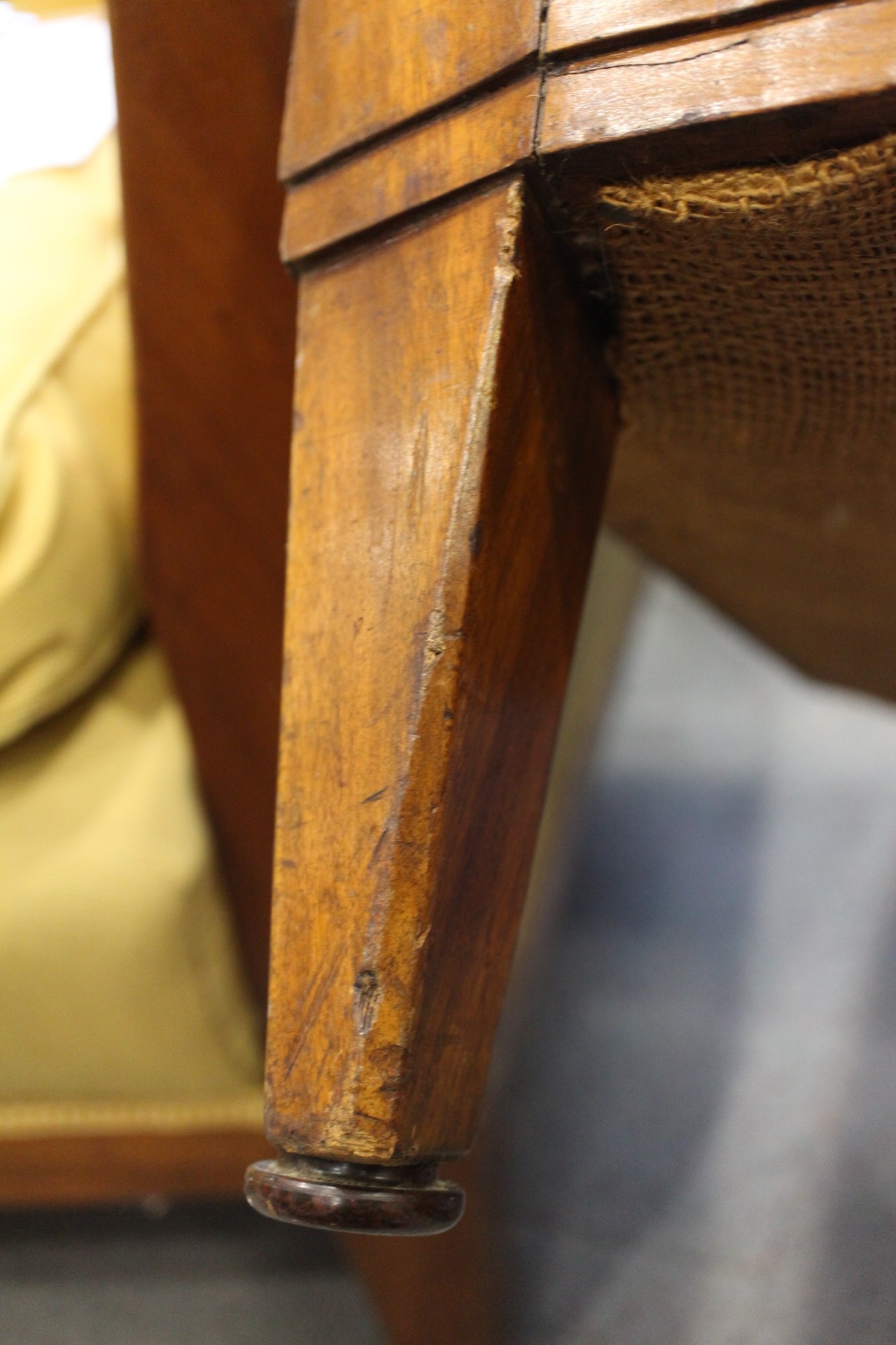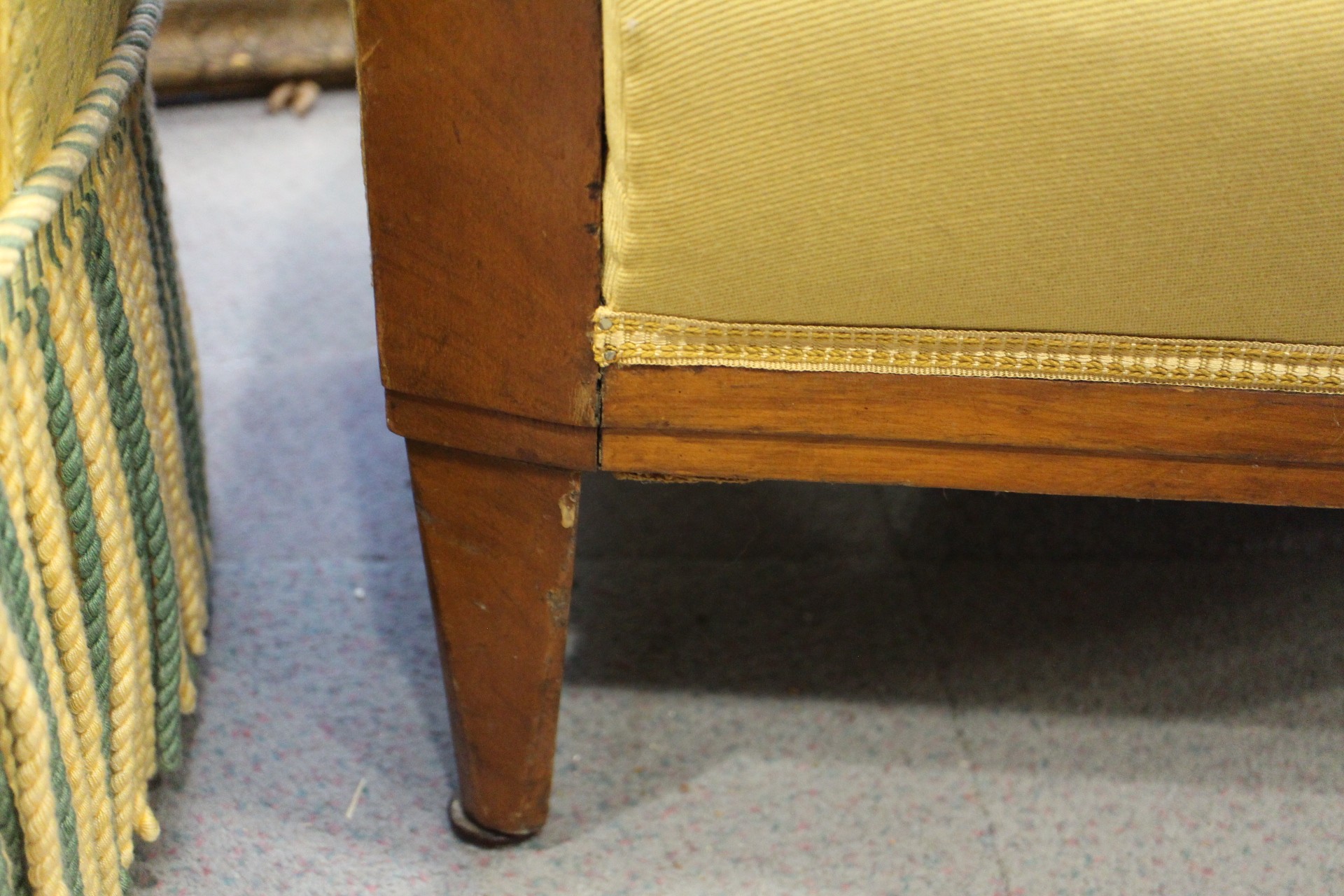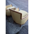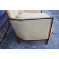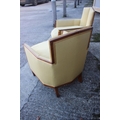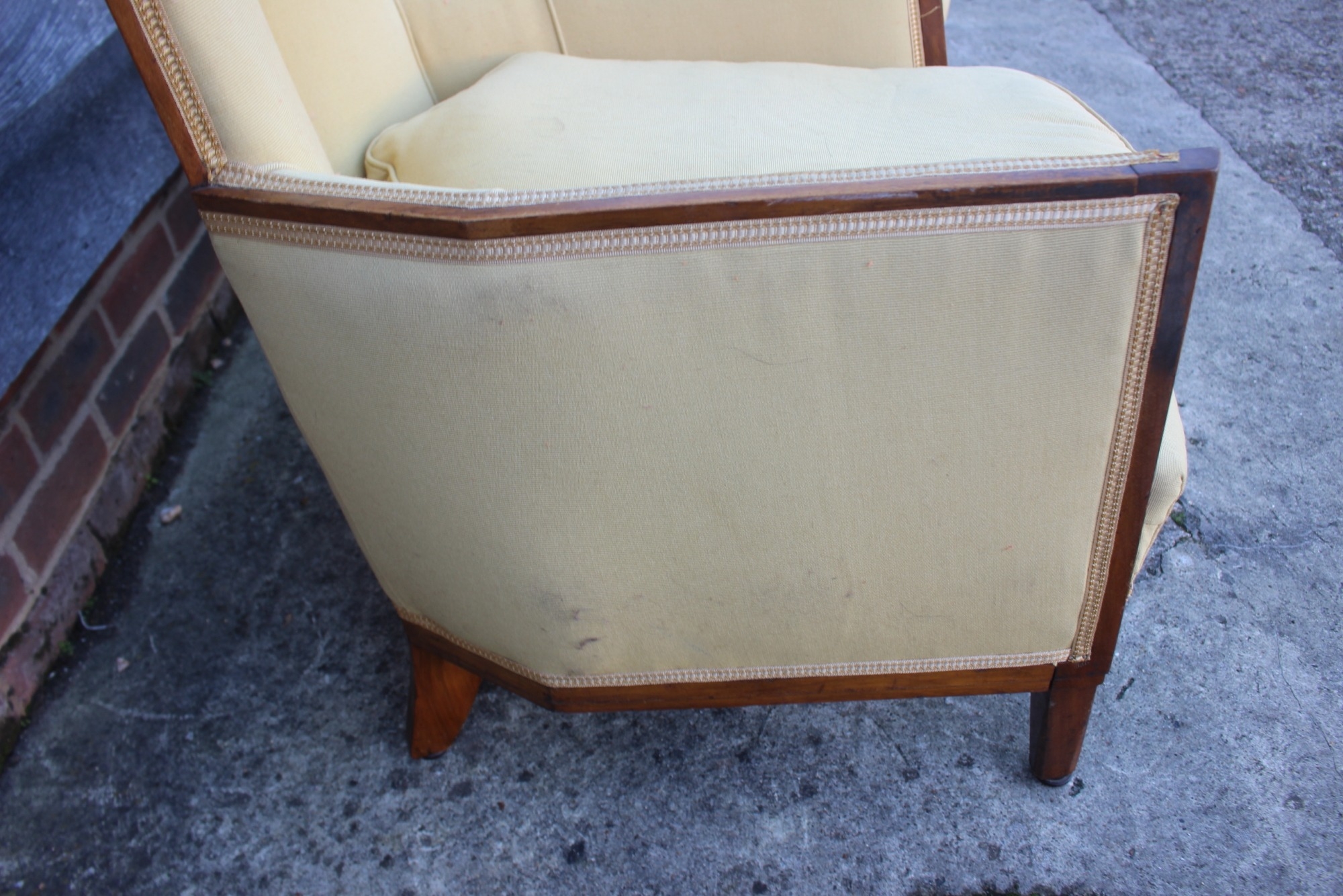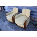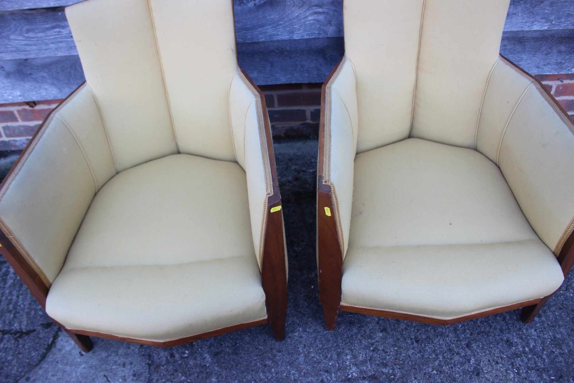 Manner of Emile Jacques Ruhlmann, a pair of Art Deco walnut framed tub armchairs, upholstered in gold material