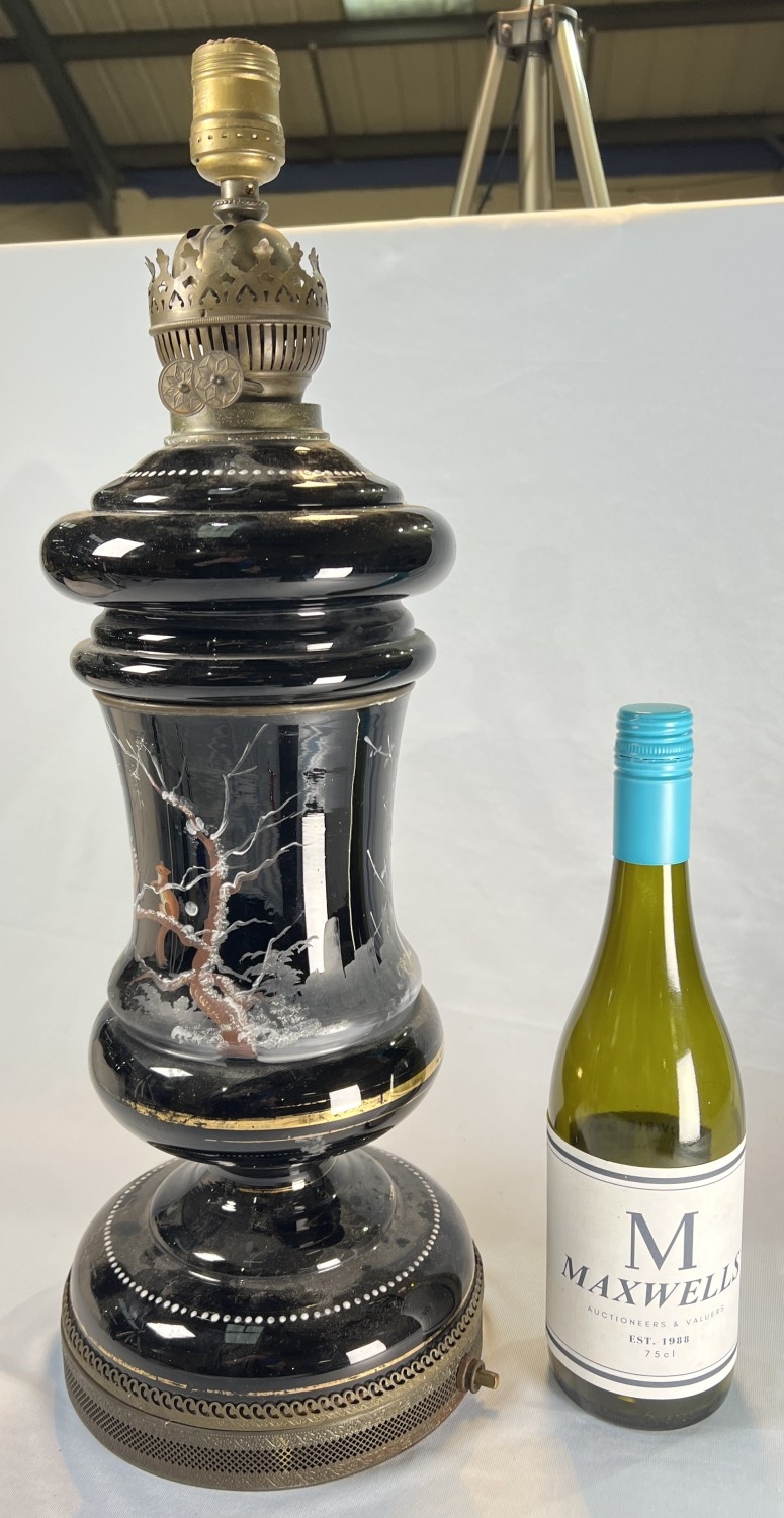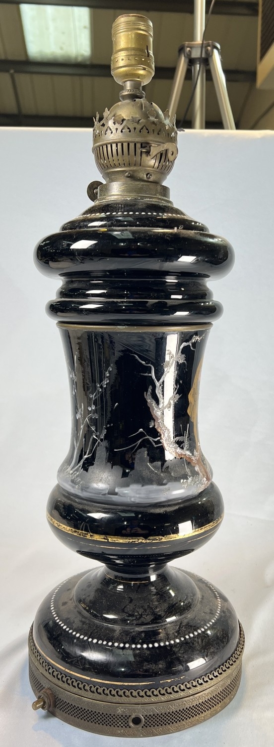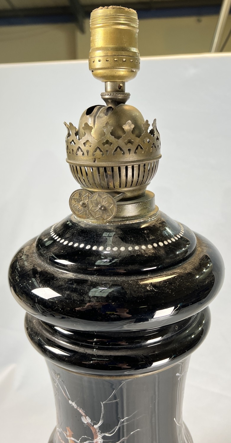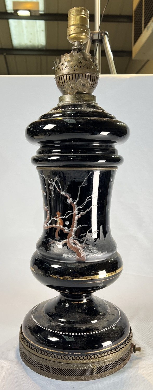 Opaque glass and brass antique table lamp converted from an oil lamp.