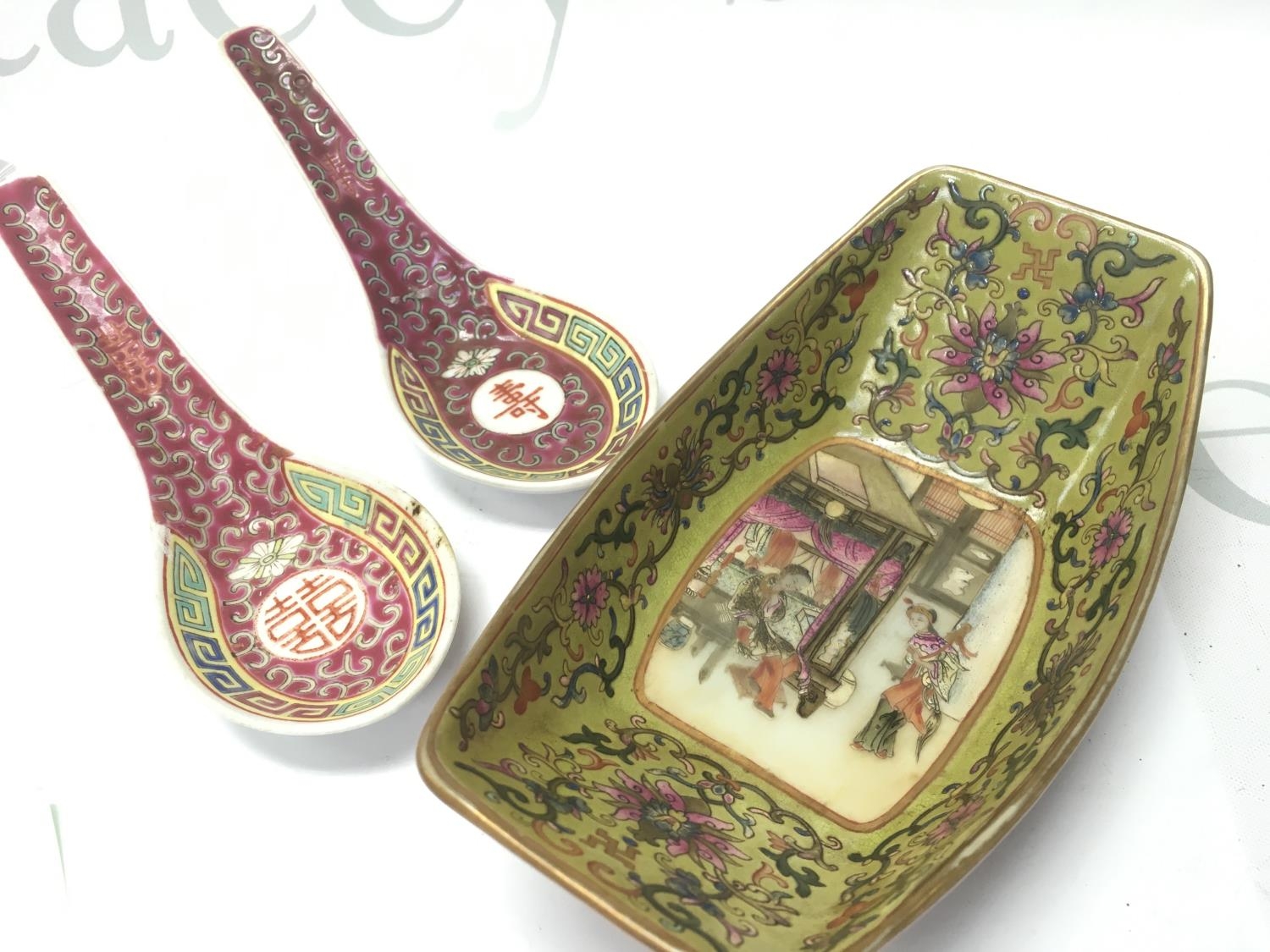 A Chinese ceramic soup bowl with gilt design, floral decoration, hand painted scene with figures and soup spoons . This lot cannot be posted
