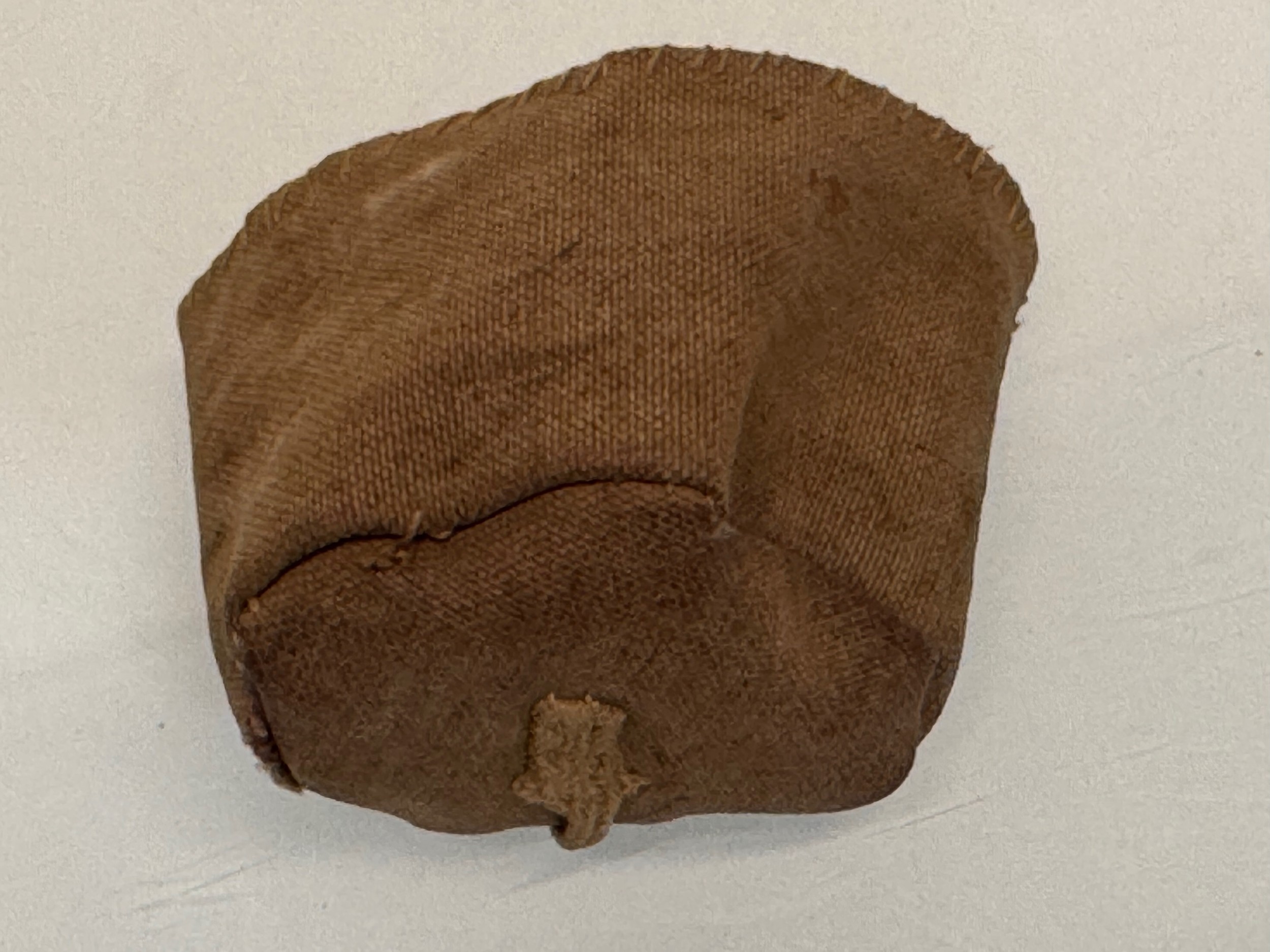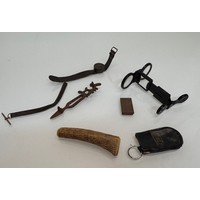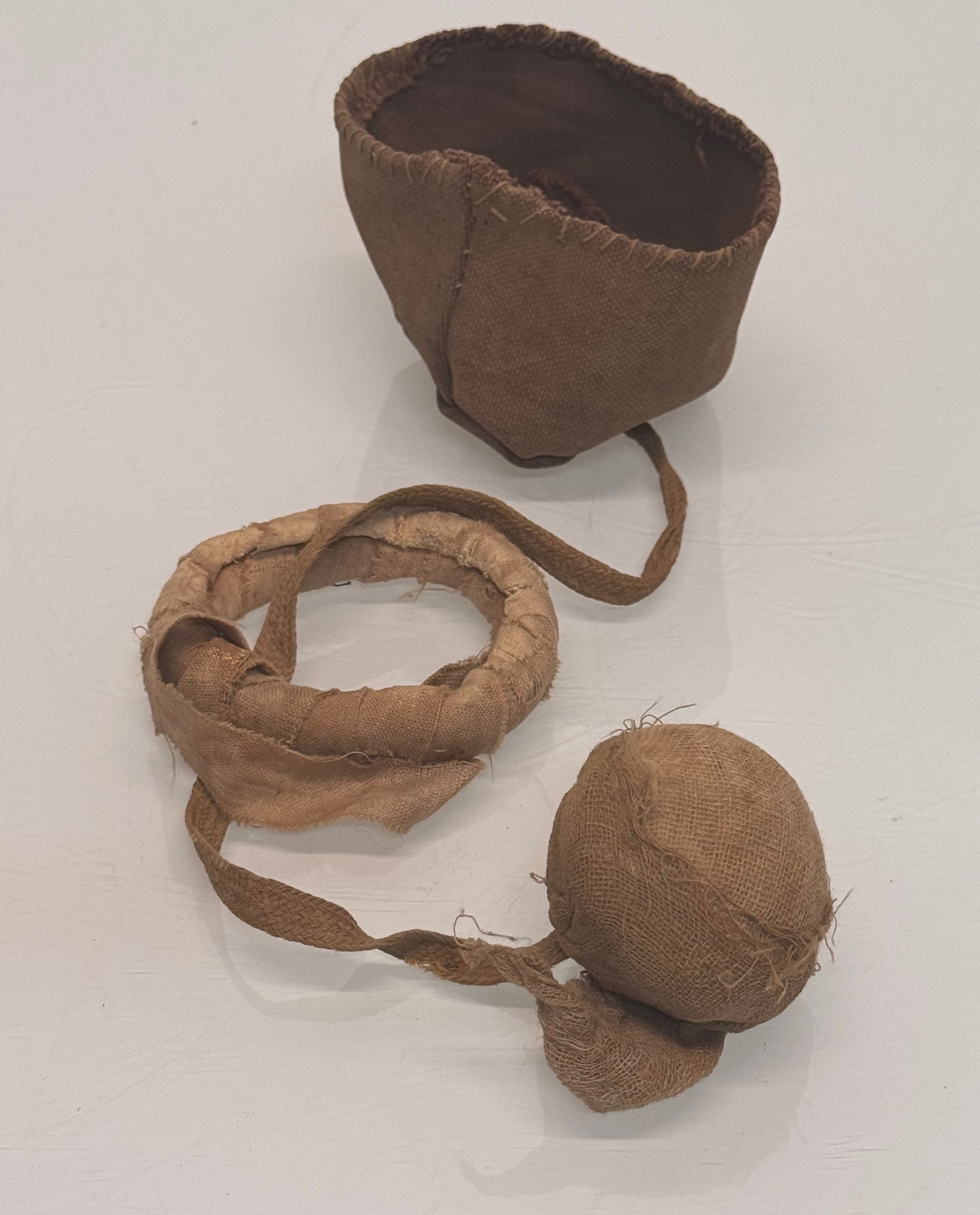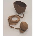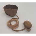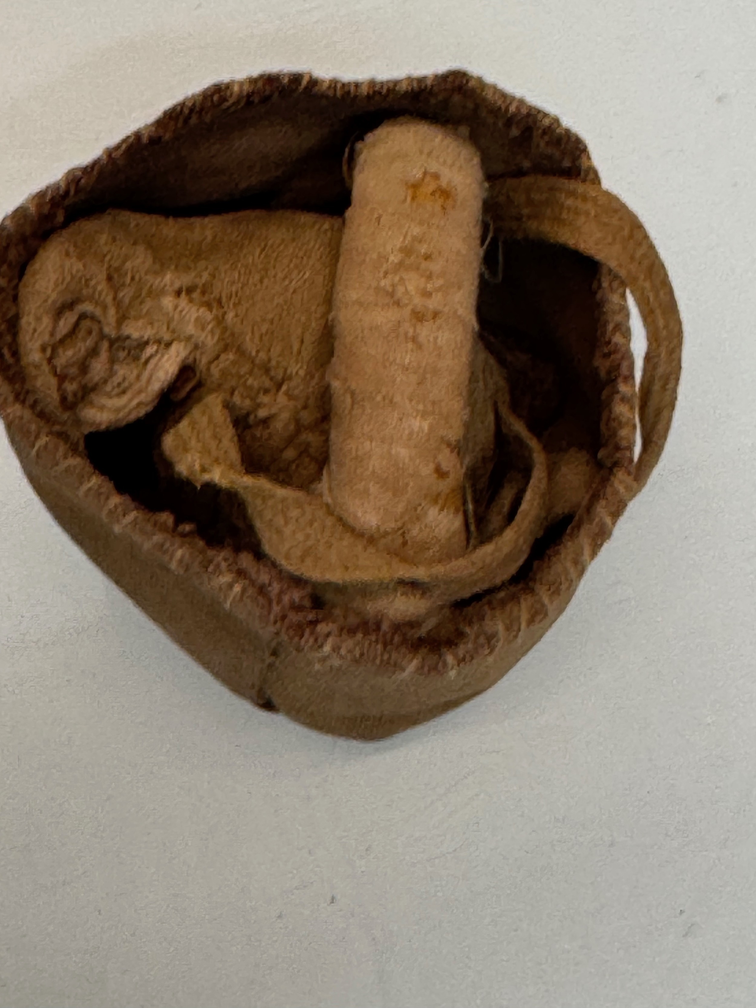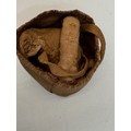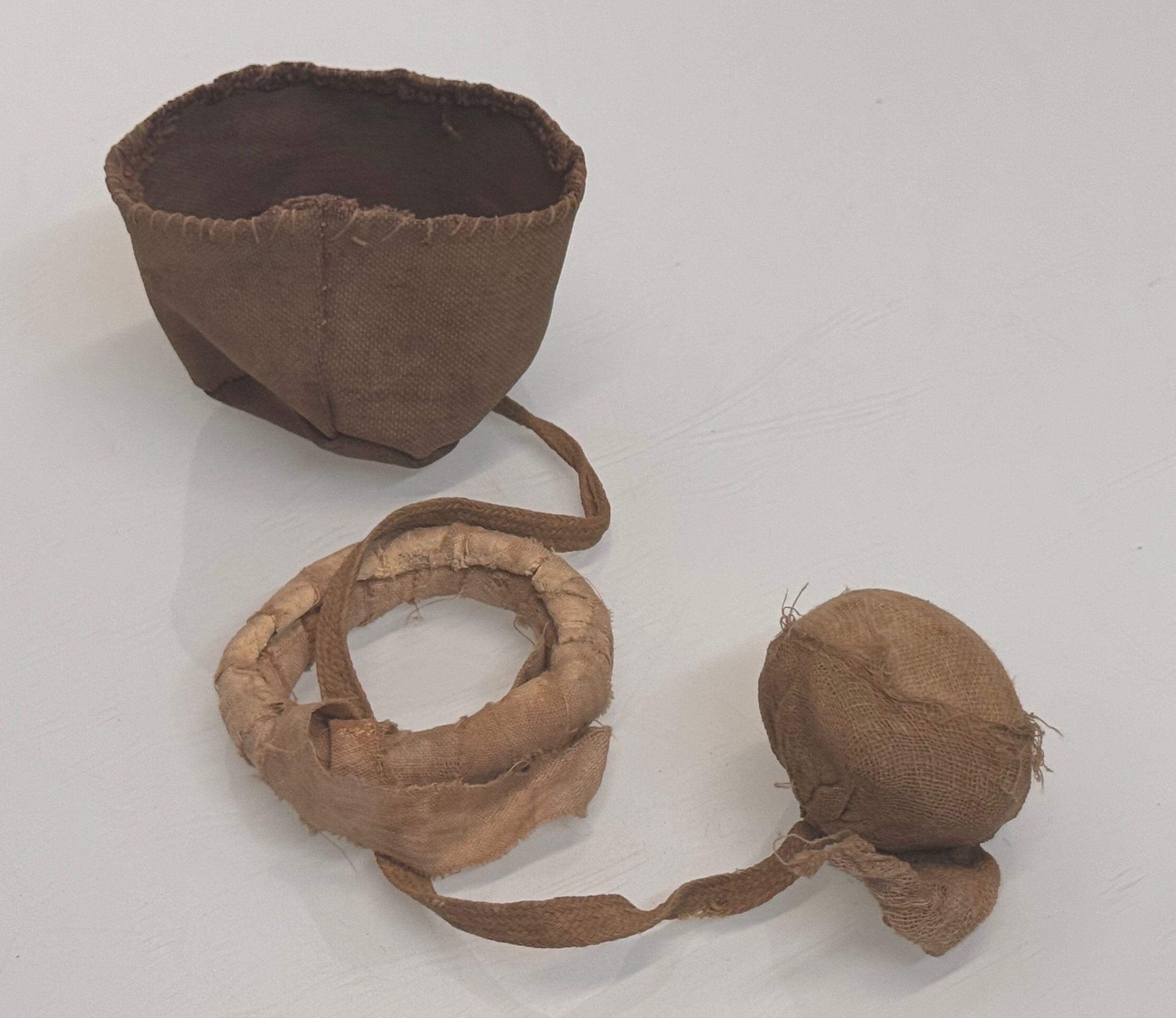 Ethic art, toys and games, an Inuit made ball and hoop game in a small fabric bag.