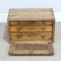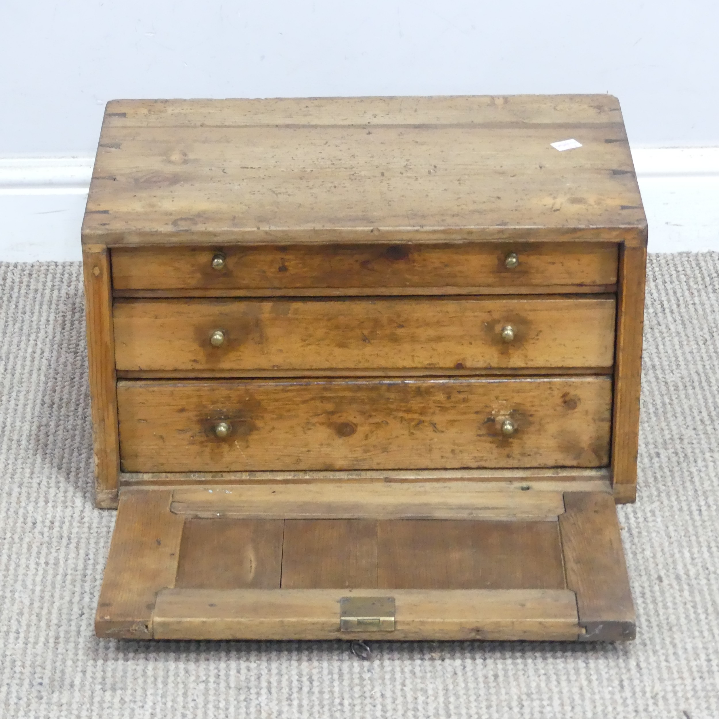A rustic pine desk top tool Chest, the fall front revealing three graduating drawers, W 46 cm x H 26 cm x D 28.5 cm.