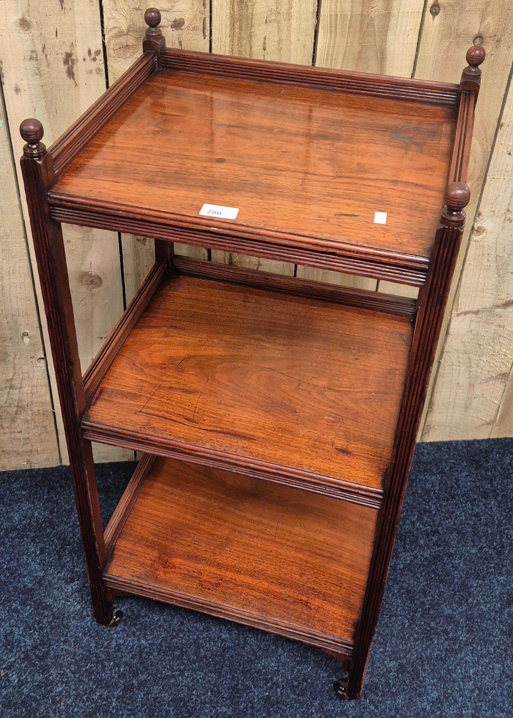 19th Century Three Tier Mahogany Whatnot Stand on ceramic rollers. 97x45x45cm.