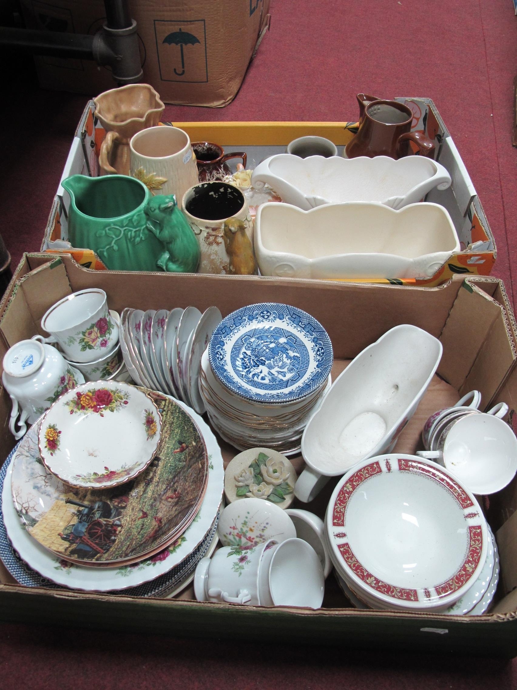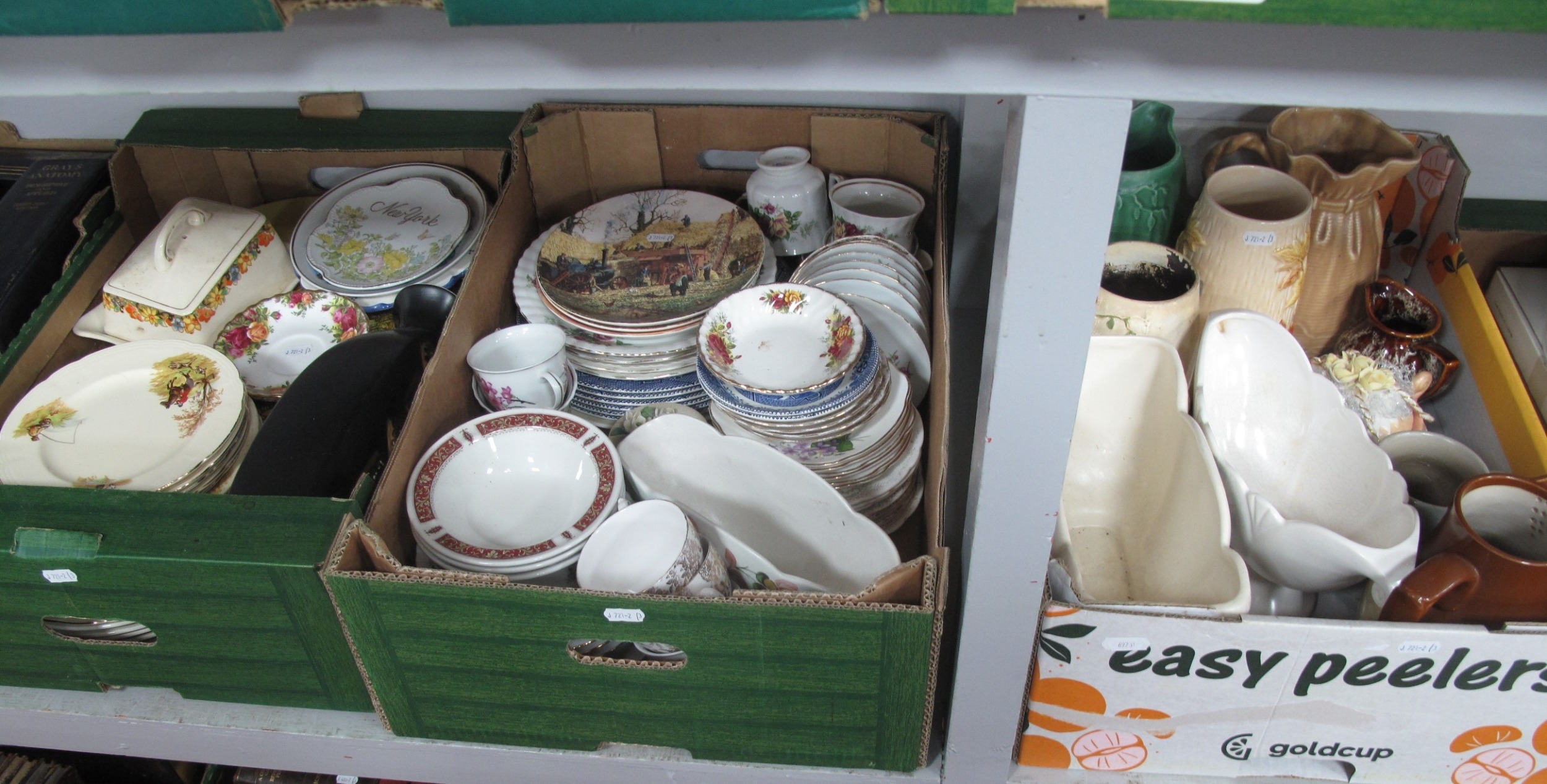 Large quantity of ceramics, including Sylvac pottery jugs, pottery flower pots,3D chalkware plaques, Alfred Meakin dinnerware, Brentleigh Ware vase, assorted vintage plates and tea service, Wedgwood collectors plates and Royal Albert "Old Country Roses" saucers etc. Three boxes.
