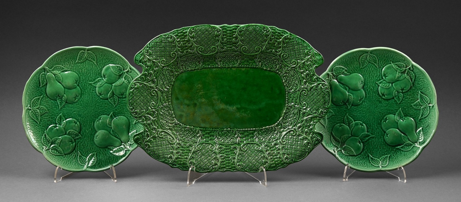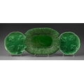 A Brameld green glazed dish, c1830, with ozier moulded rim, 31.5cm w, impressed mark and a pair of contemporary green glazed plates, moulded with pears, 20.5cm diam, impressed 12 (3)