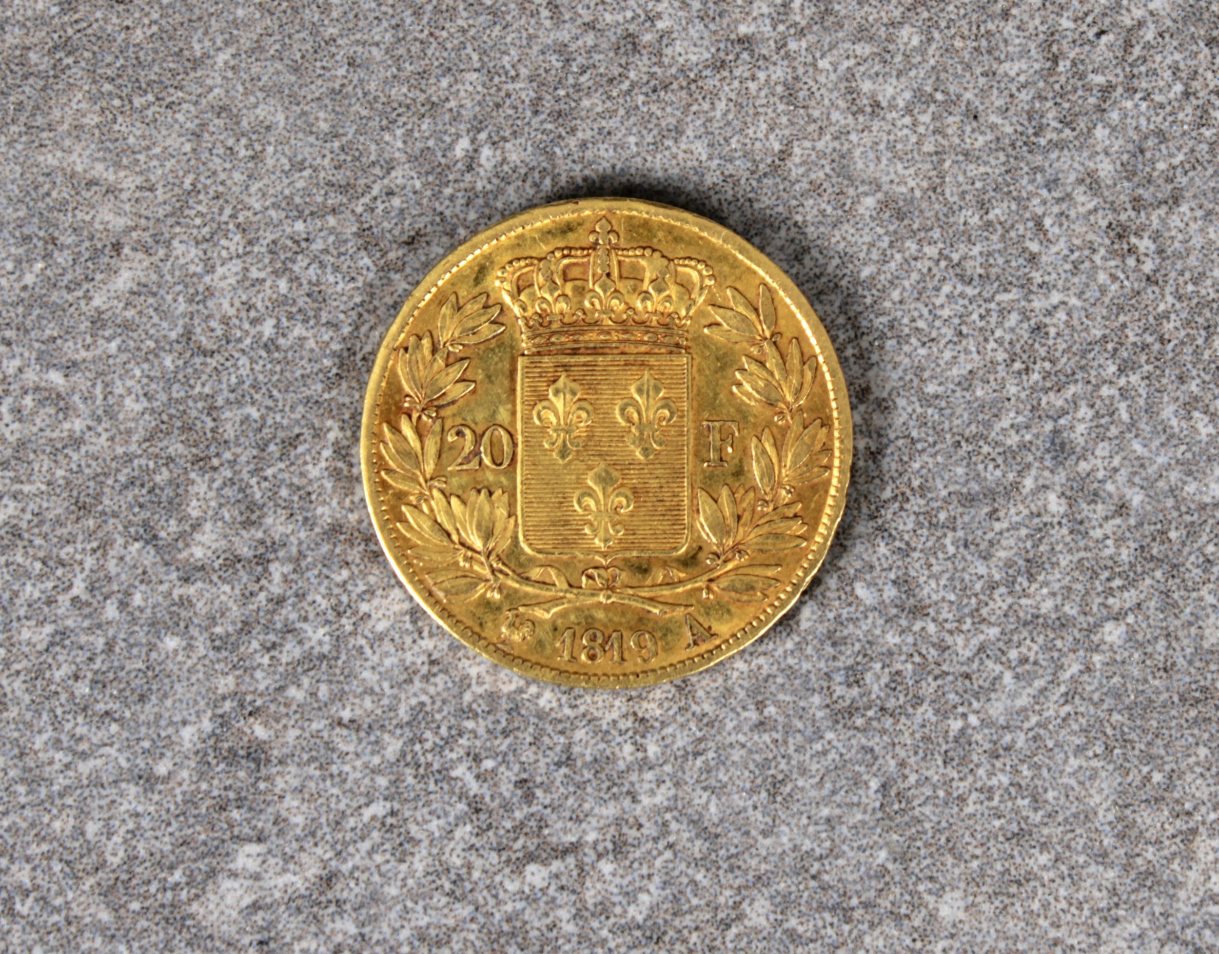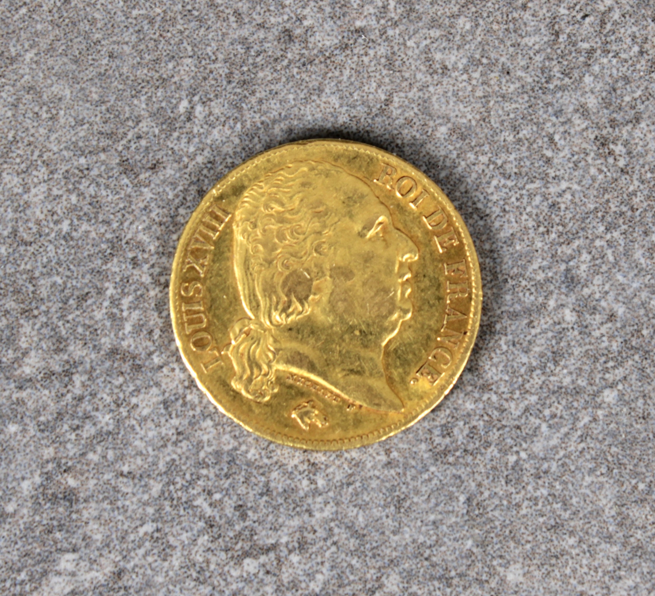 A 20 Francs - Louis XVIII nude bust gold (.900) coin obverse - naked head of Louis XVIII turned to the right, the hair held by a headband tied in the neck, LOUIS XVIII ROI DE FRANCE / MICHAUT F, horses head, reverse - the shield of France crowned between two branches of olive tree, the year is indicated below and the inscription 20 F on both sides of the blazon, edge with DOMINE SALVUM FAC REGEM, 21mm diameter.