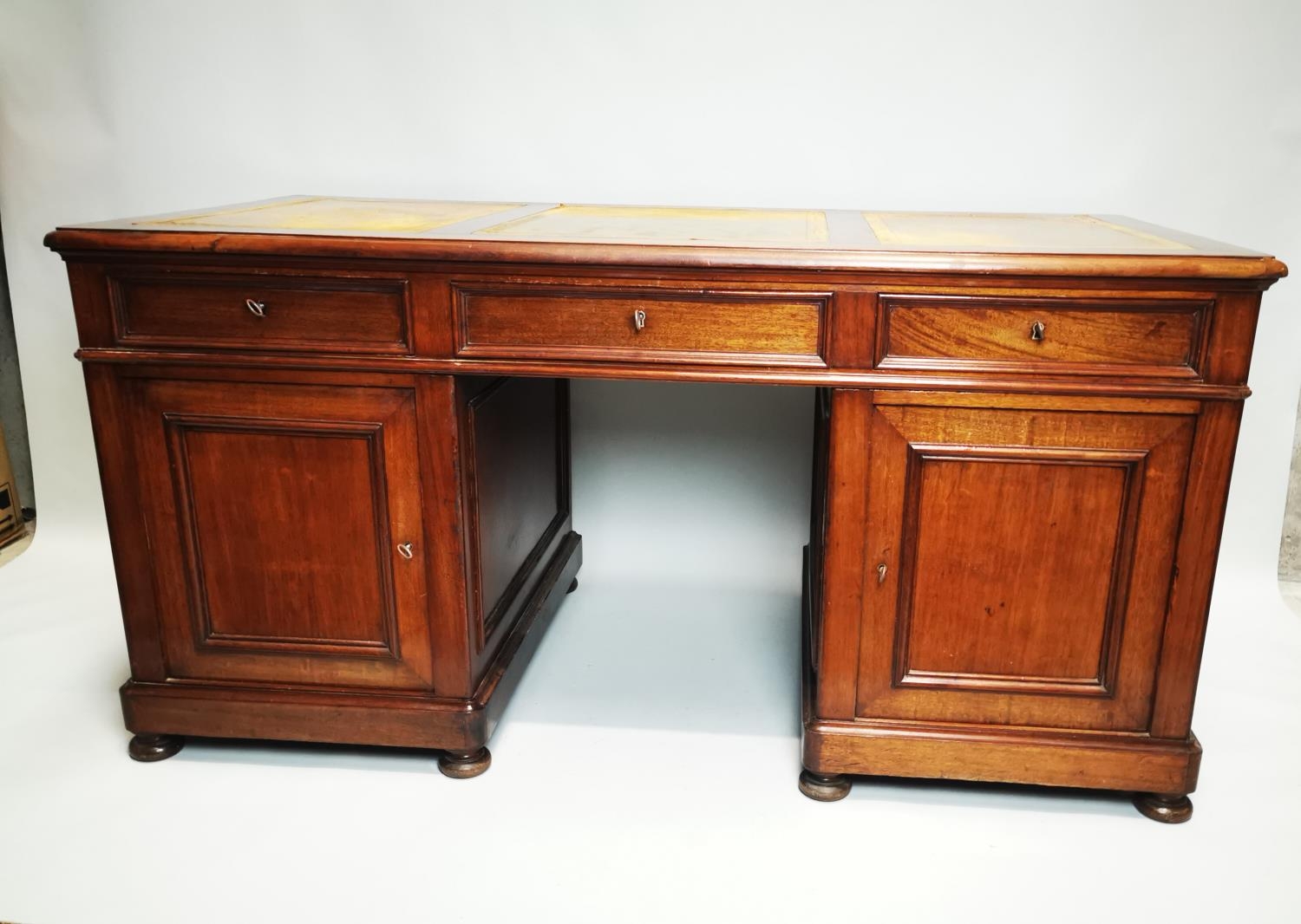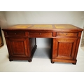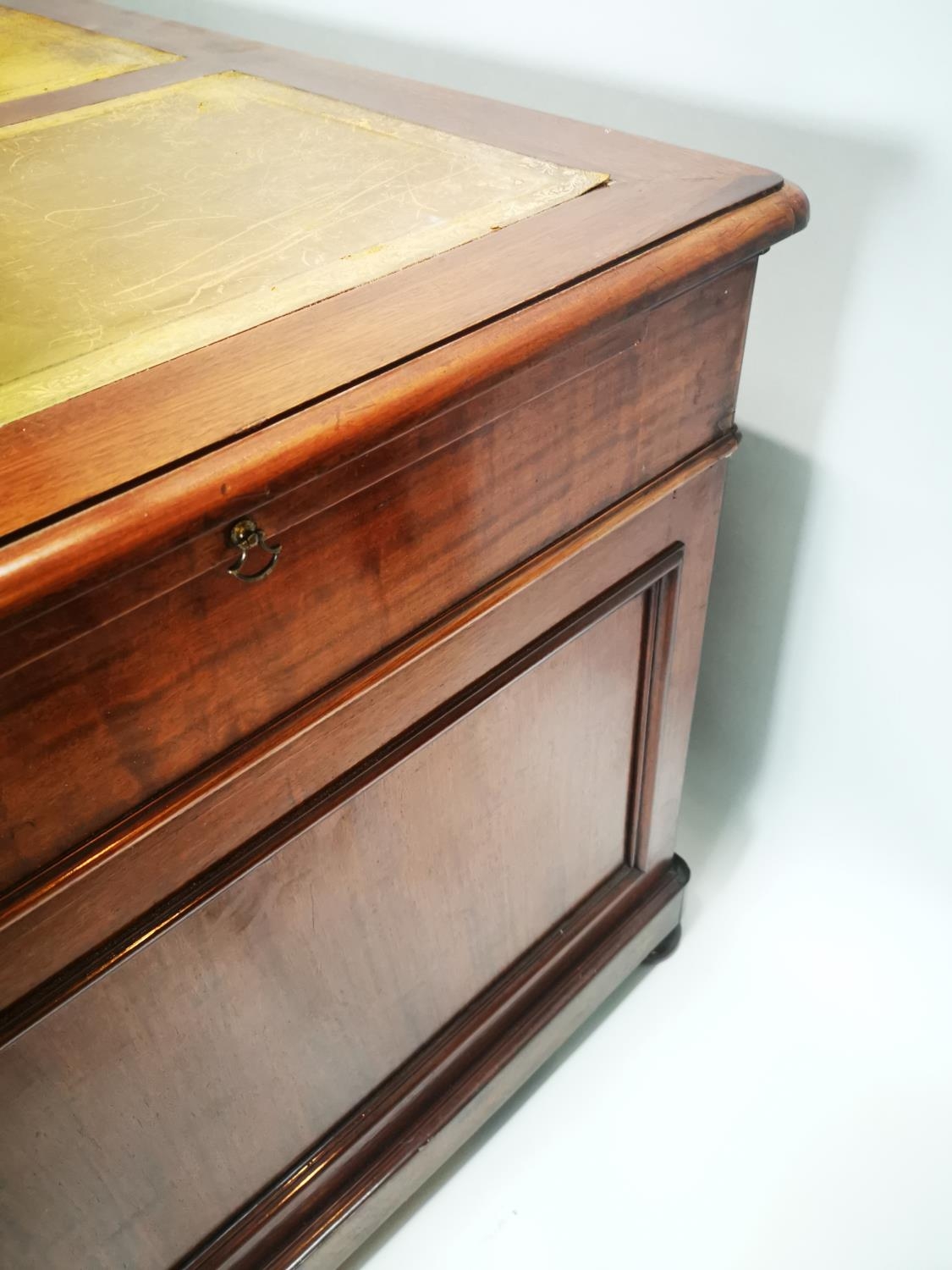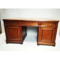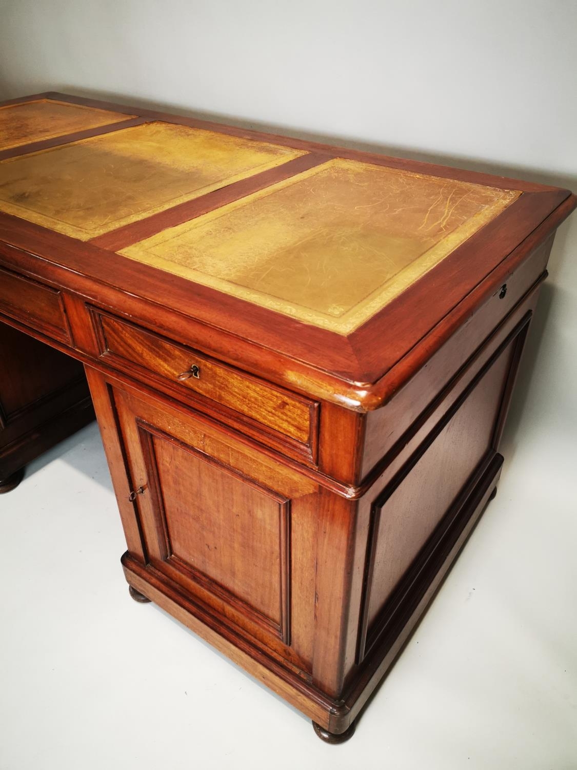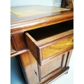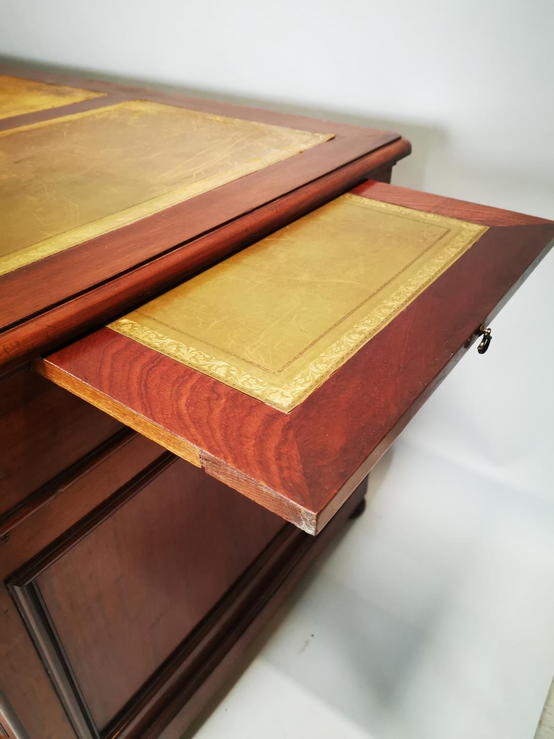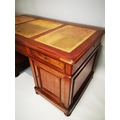 19th. C. mahogany pedestal desk with inset tooled leather top and fitted interior. { 80cm H X 159cm W X 78cm D }.