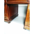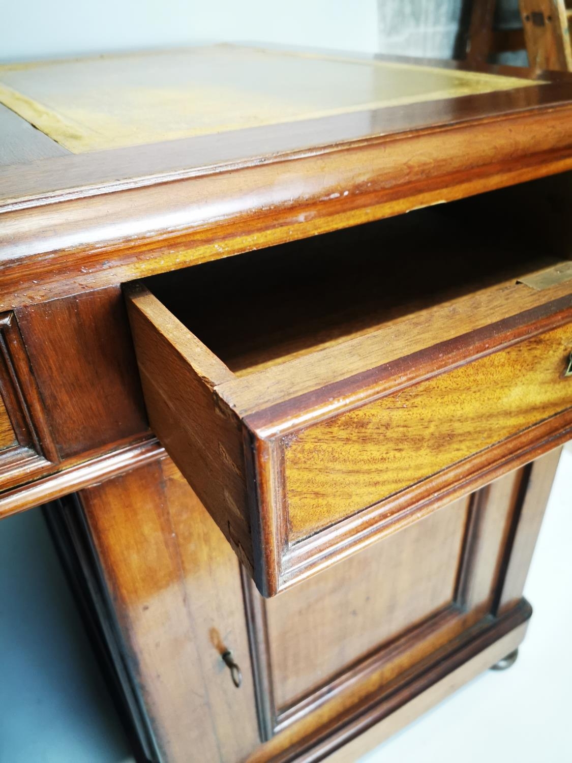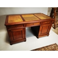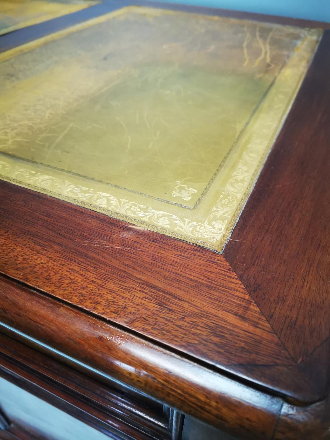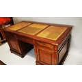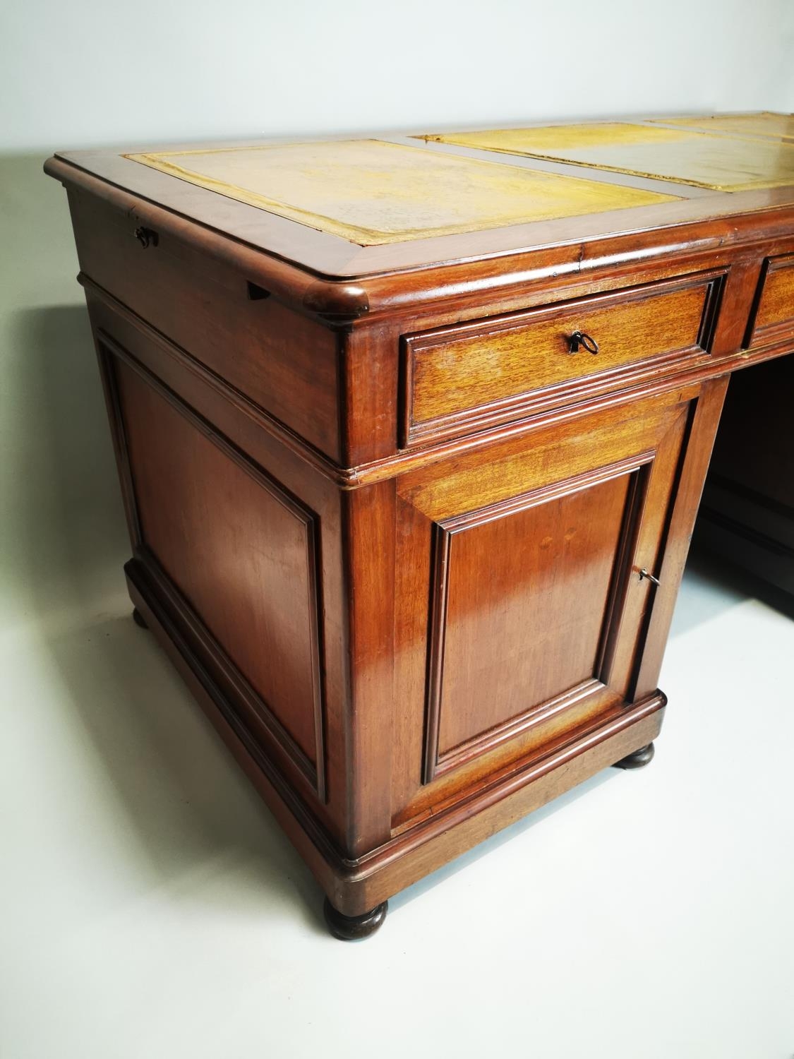 19th. C. mahogany pedestal desk with inset tooled leather top and fitted interior. { 80cm H X 159cm W X 78cm D }.