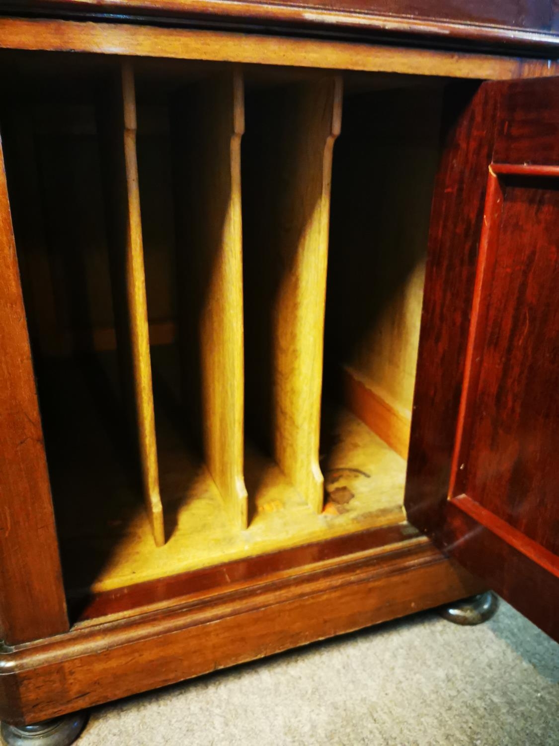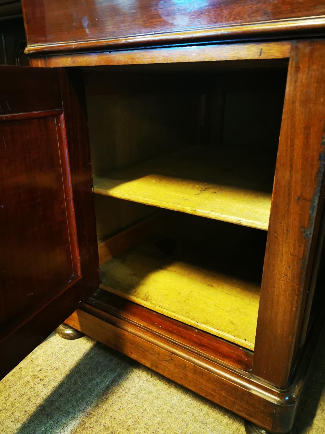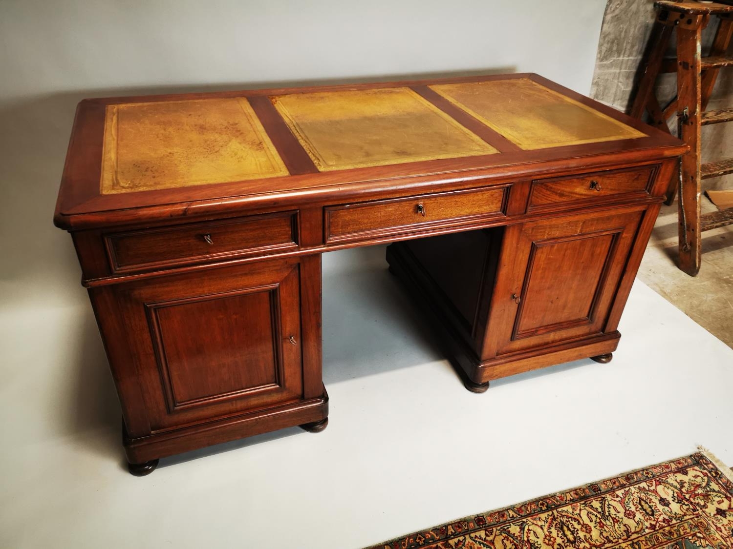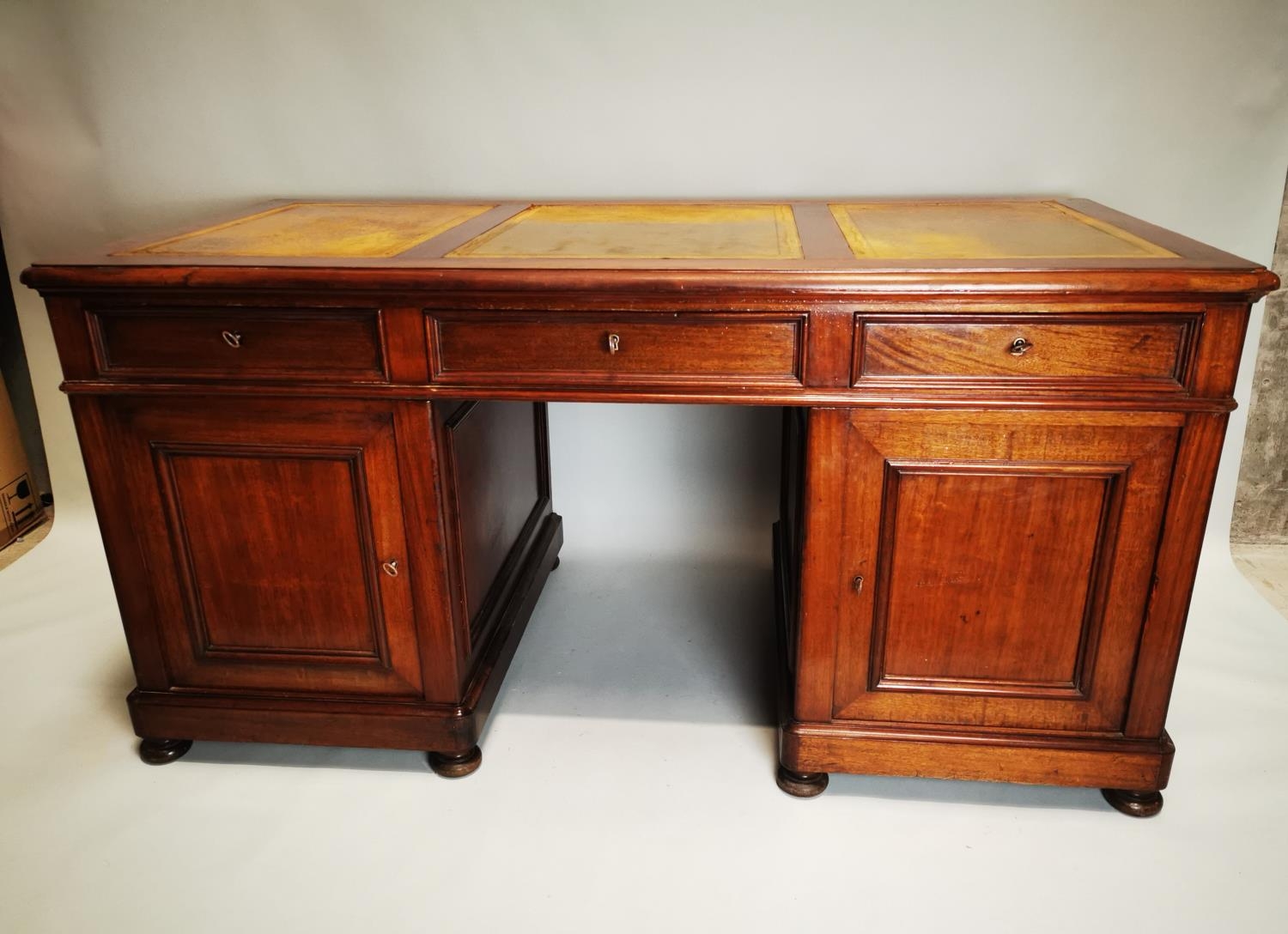 19th. C. mahogany pedestal desk with inset tooled leather top and fitted interior. { 80cm H X 159cm W X 78cm D }.