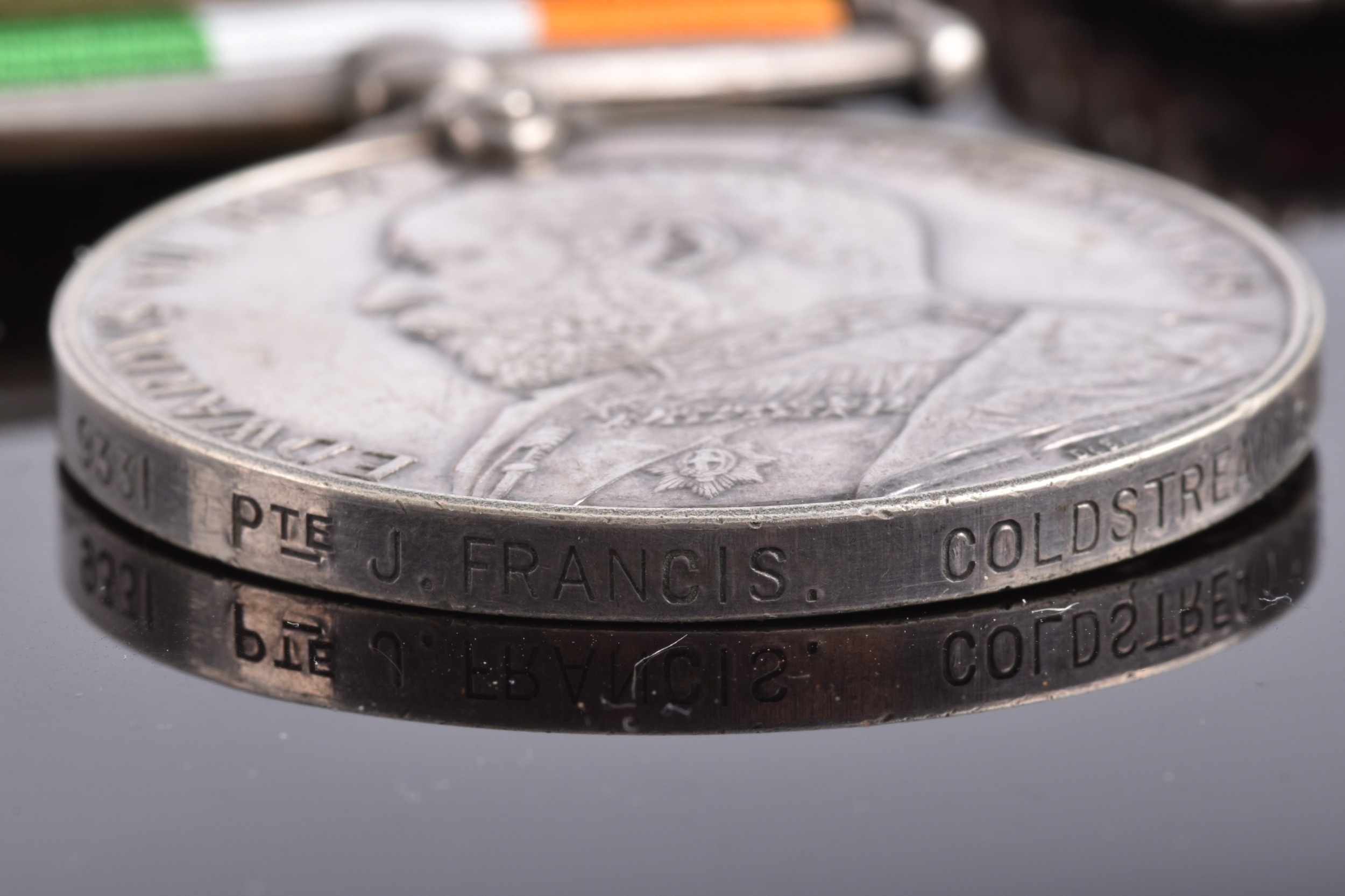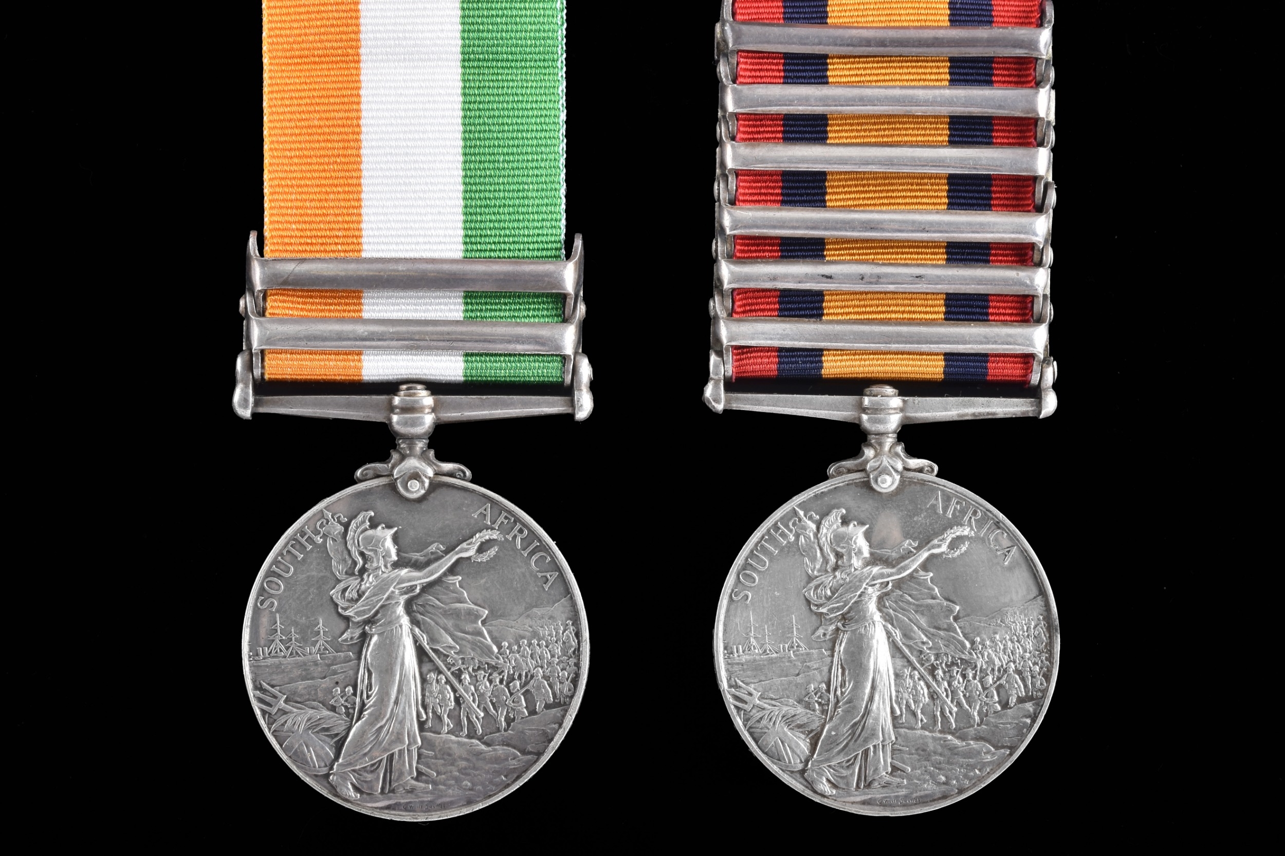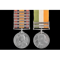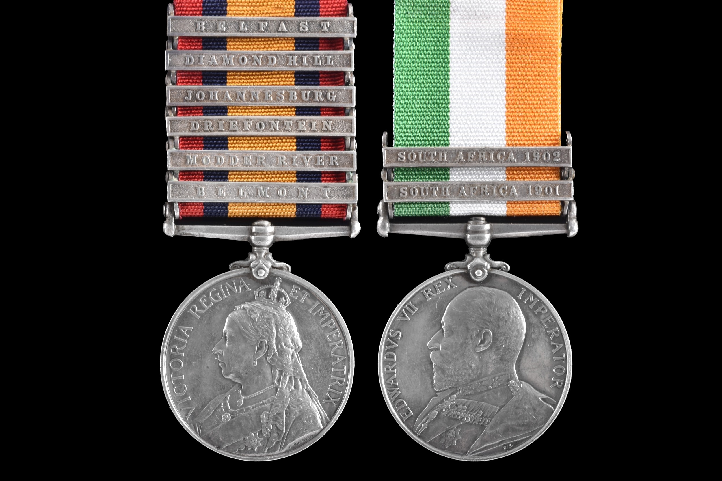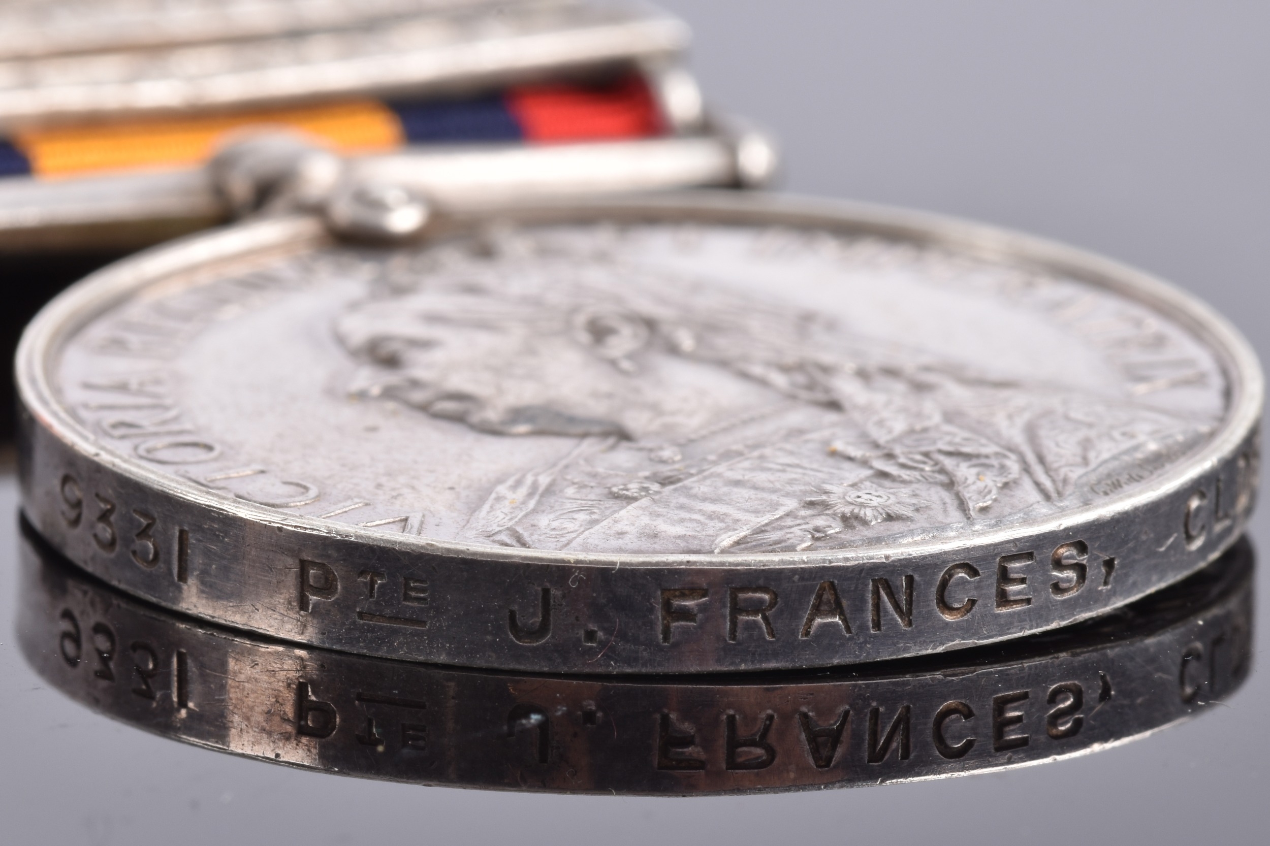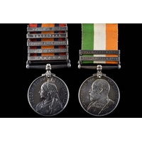 A Boer War medal pair awarded to: 9331 Private John Frances, Coldstream Guards. Comprising: a QSA Queen’s South Africa medal with 6 clasps Belmont, Modder River, Driefontein, Johannesburg, Diamond Hill, Belfast (9331 Pte. J. Frances, Cldstm Gds:); and a KSA King's South Africa medal with 2 clasps South Africa 1901 and South Africa 1902 (9331 Pte. J. Francis, Coldstream Guards).