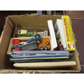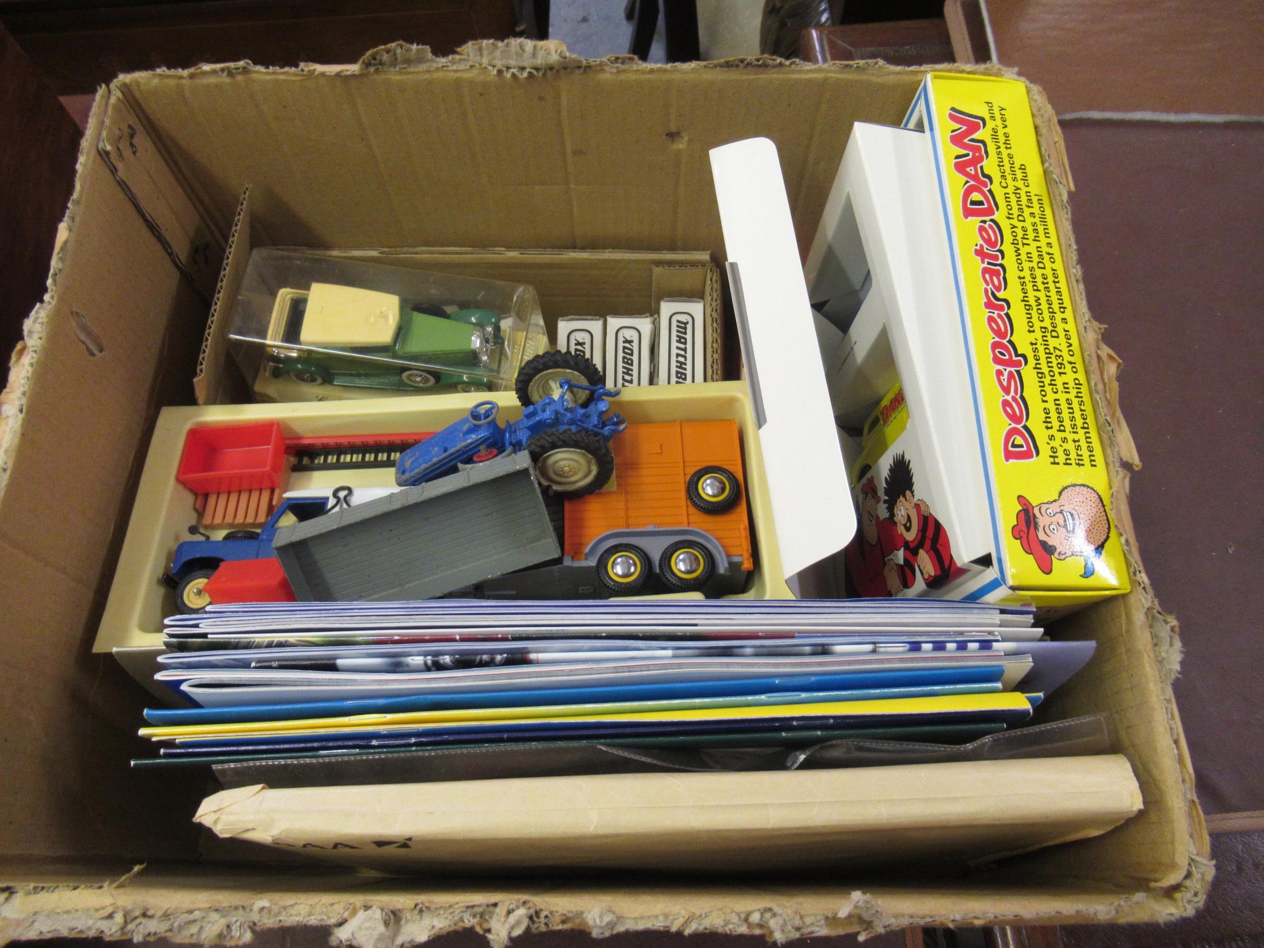 Box containing a quantity of various diecast metal vehicles, some in original boxes, including Corgi and a quantity of various collector's catalogues