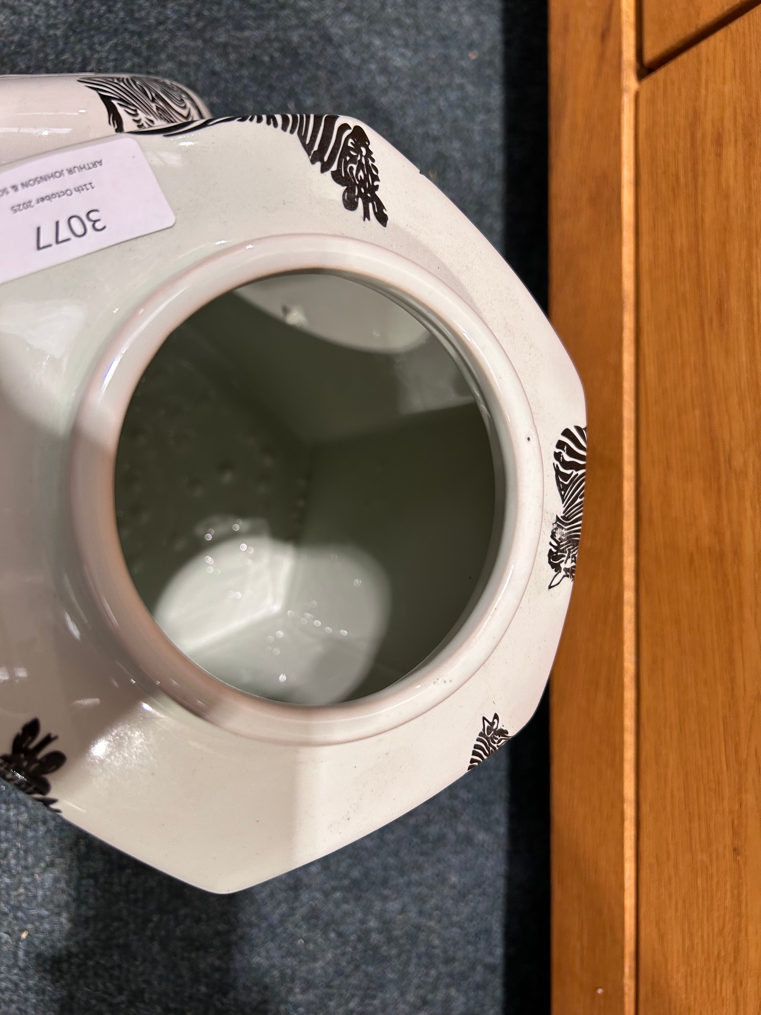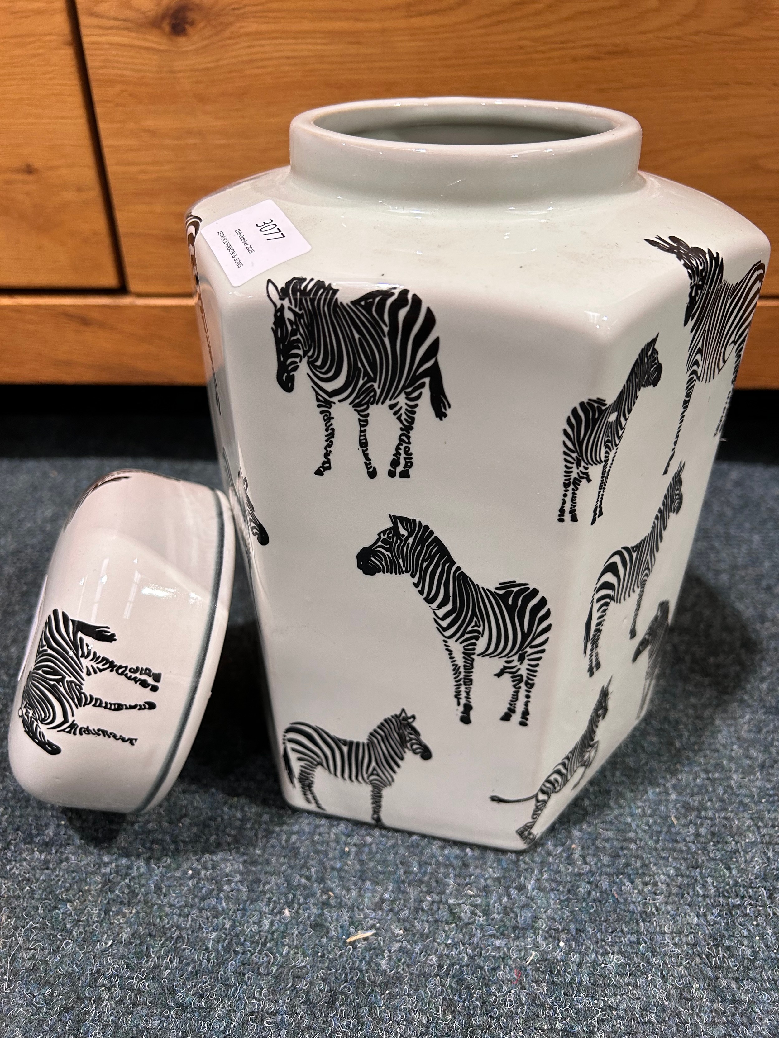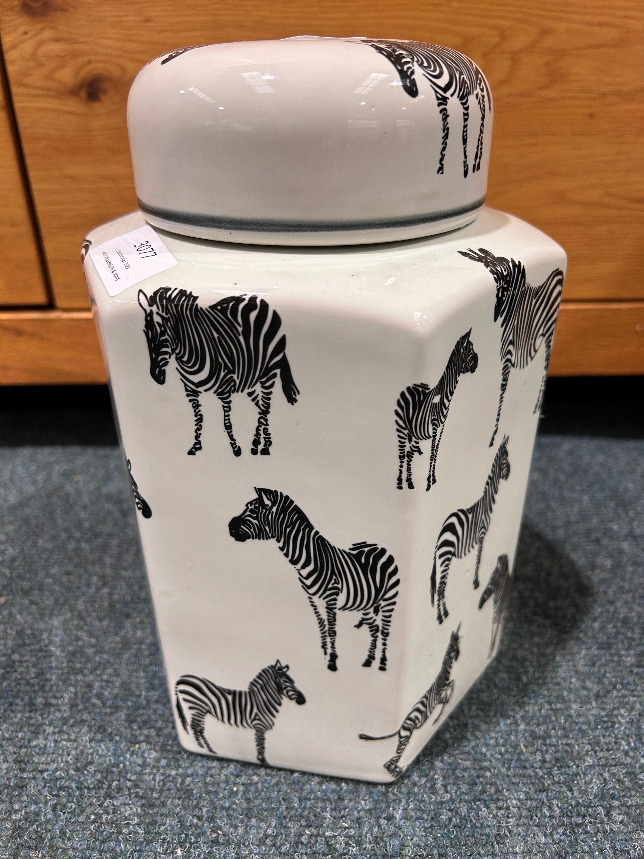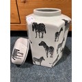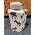 A decorative zebra ginger jar