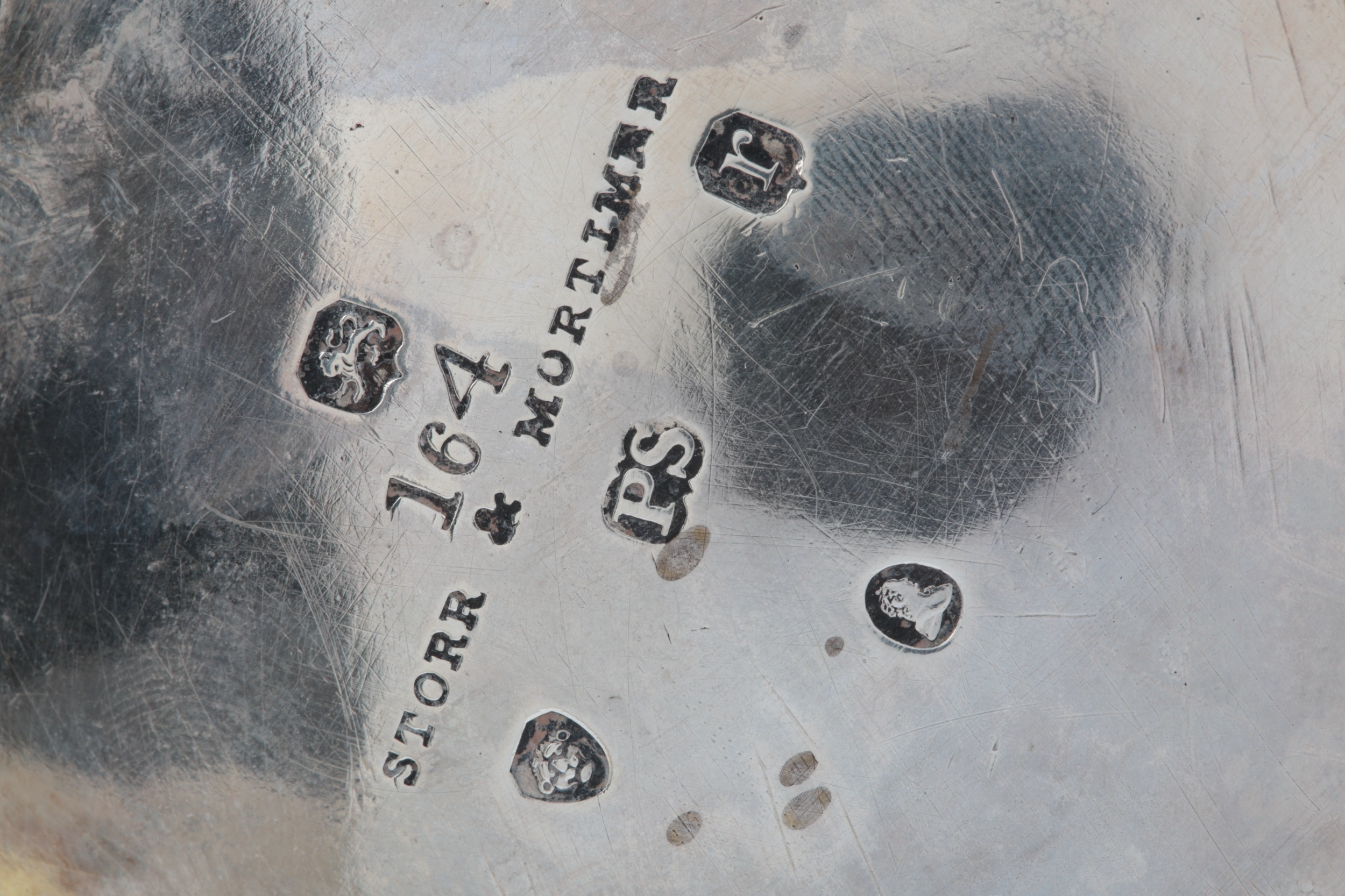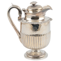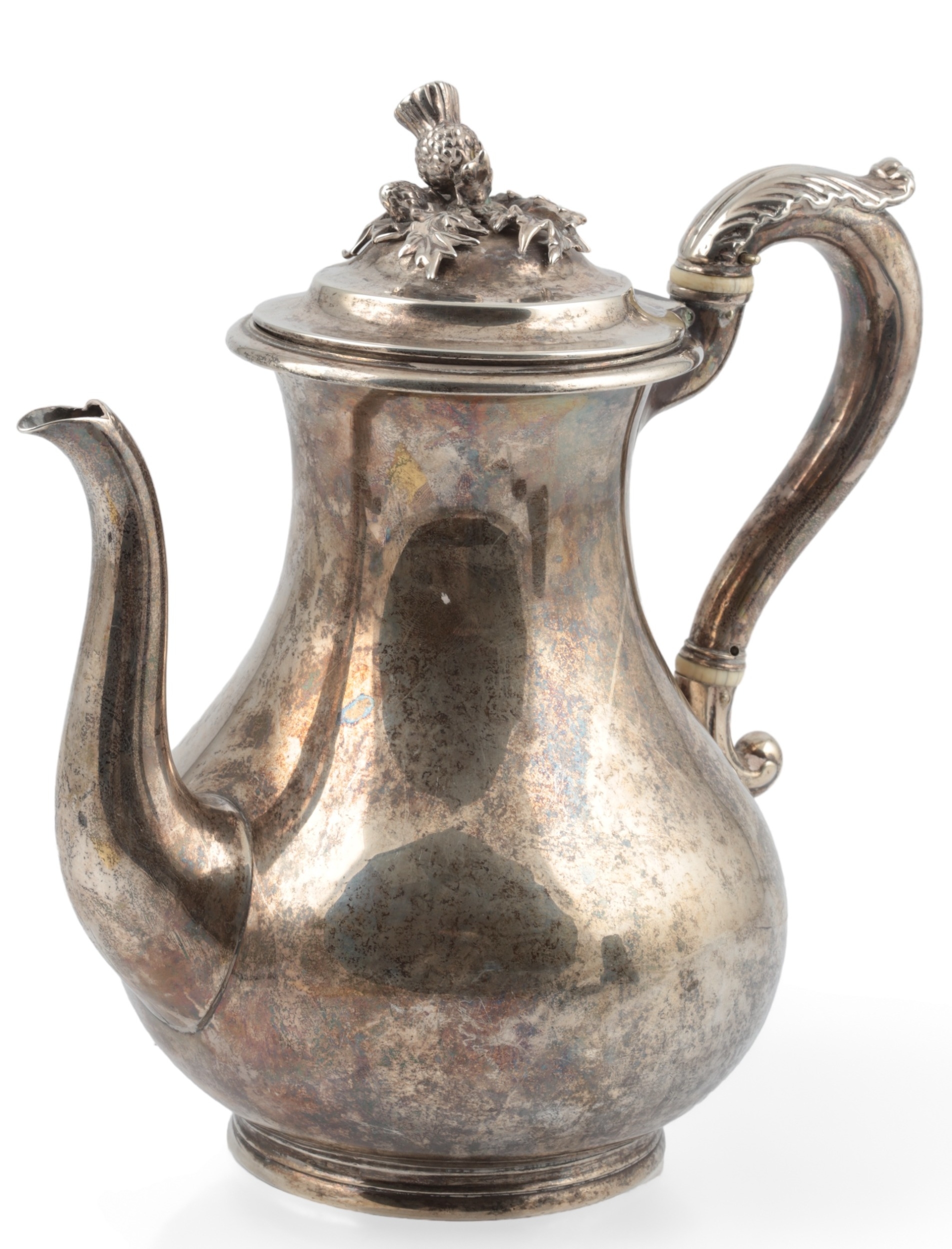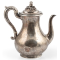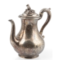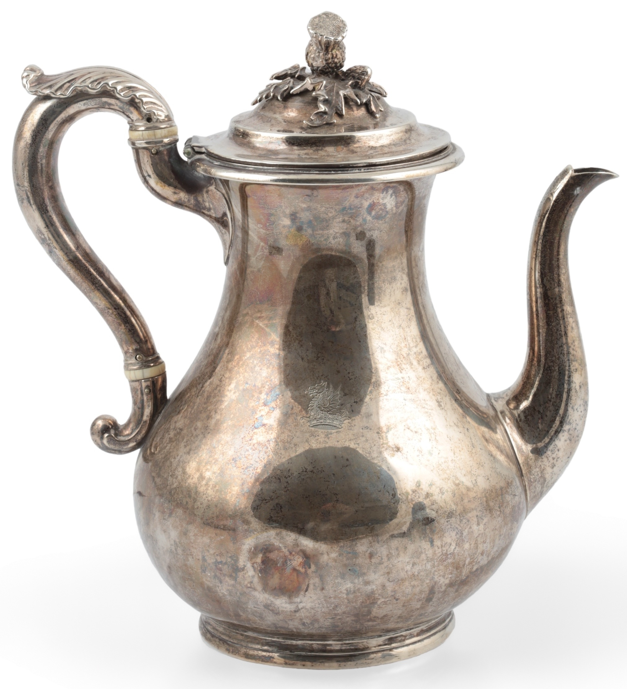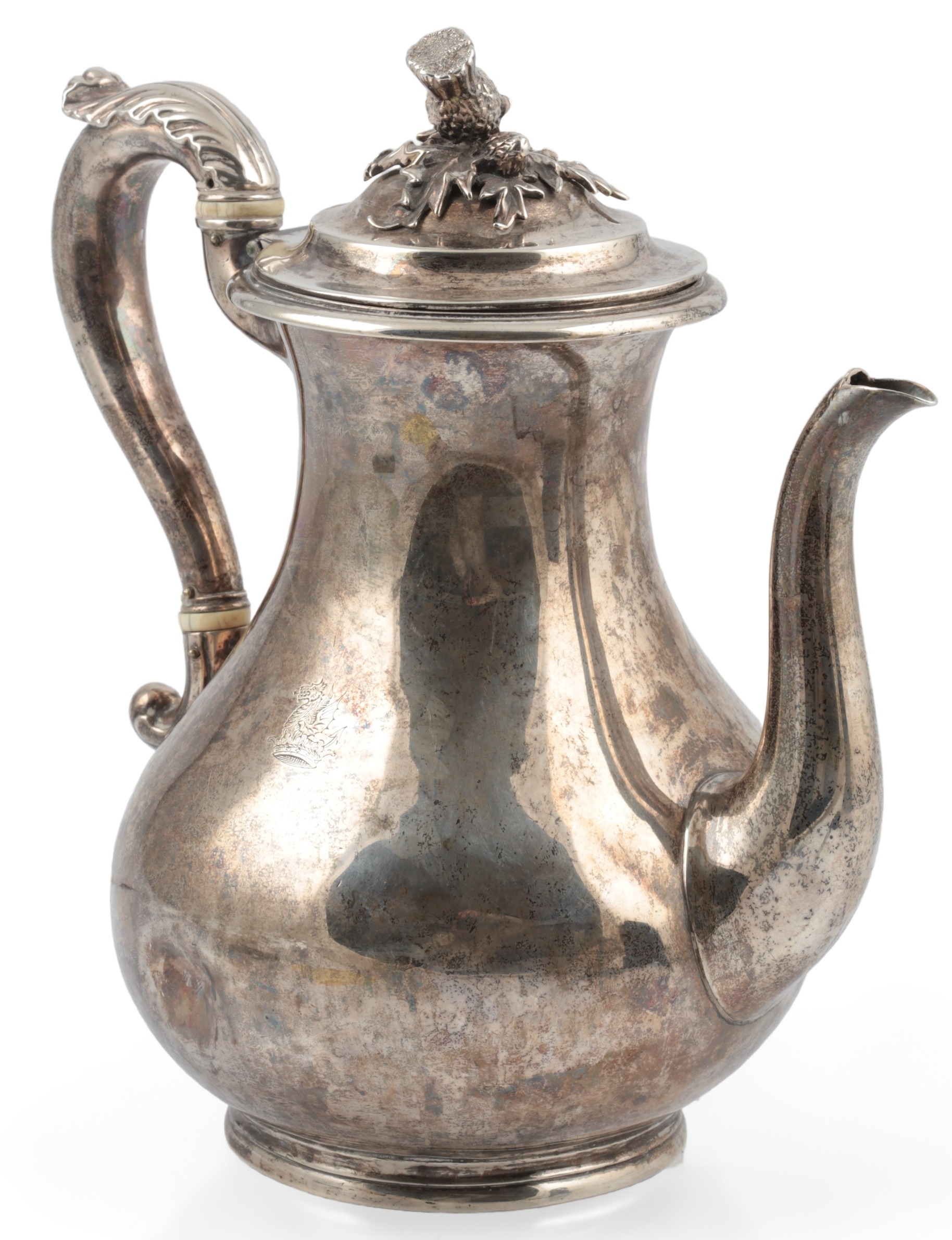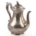 PAUL STORR: A William IV silver coffee pot, of baluster form, with engraved crest, acanthus leaf capped handle and thistle finial, London, 1832, height 24cm, gross weight 25.9oz.