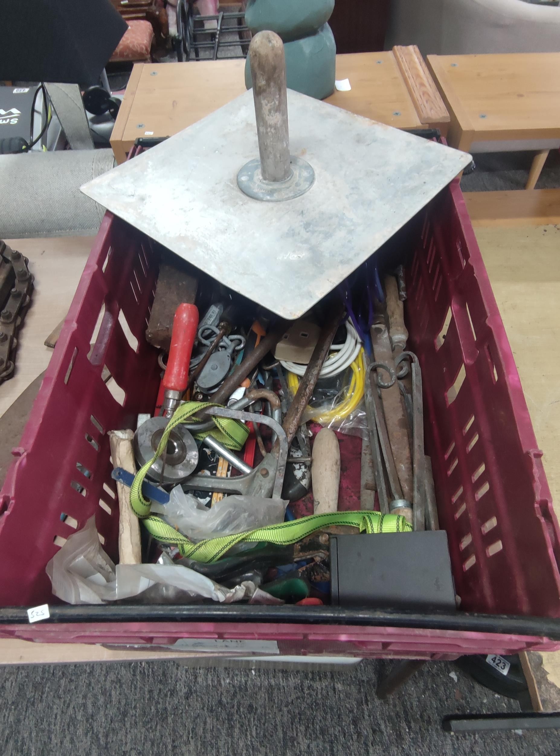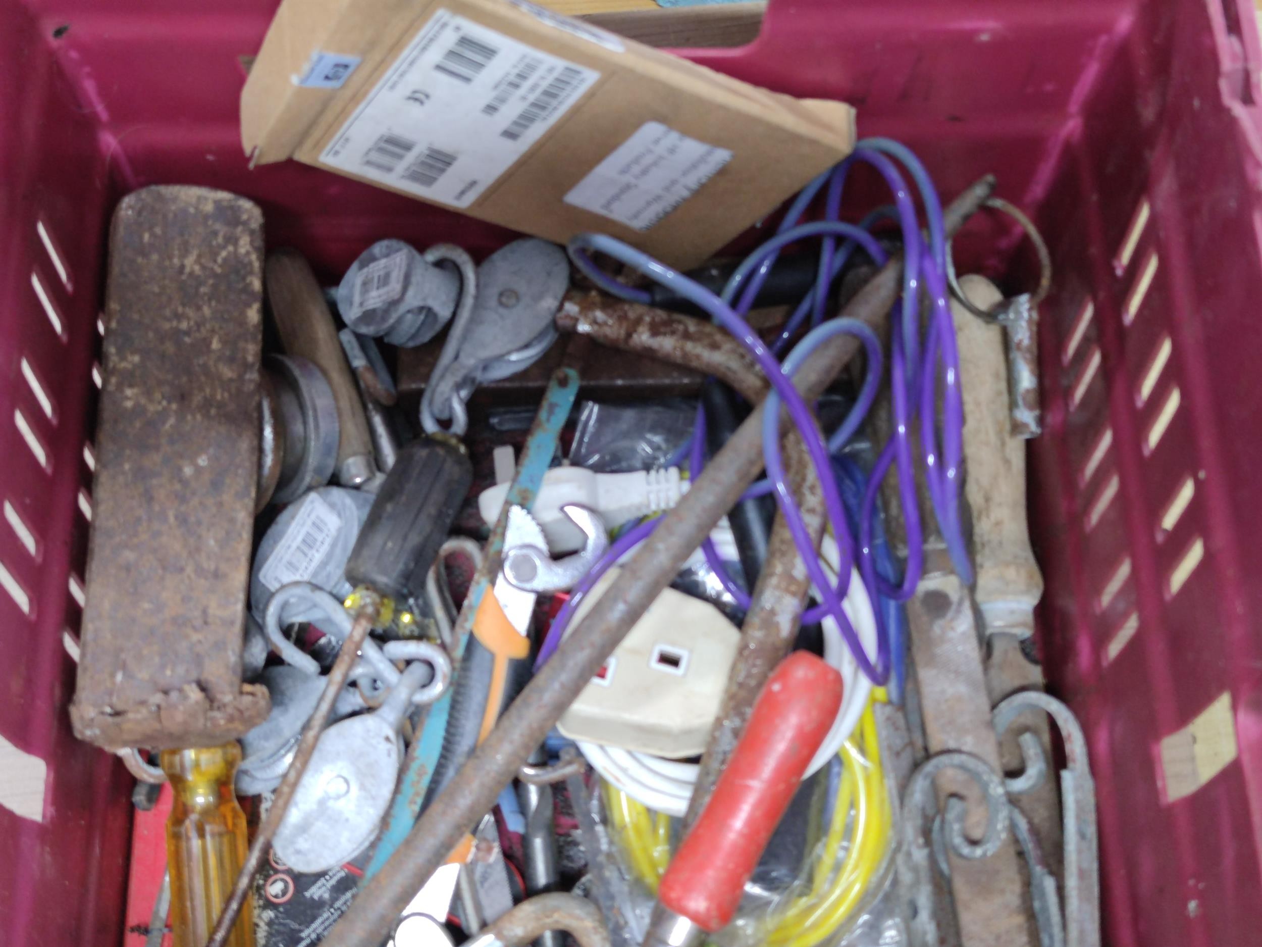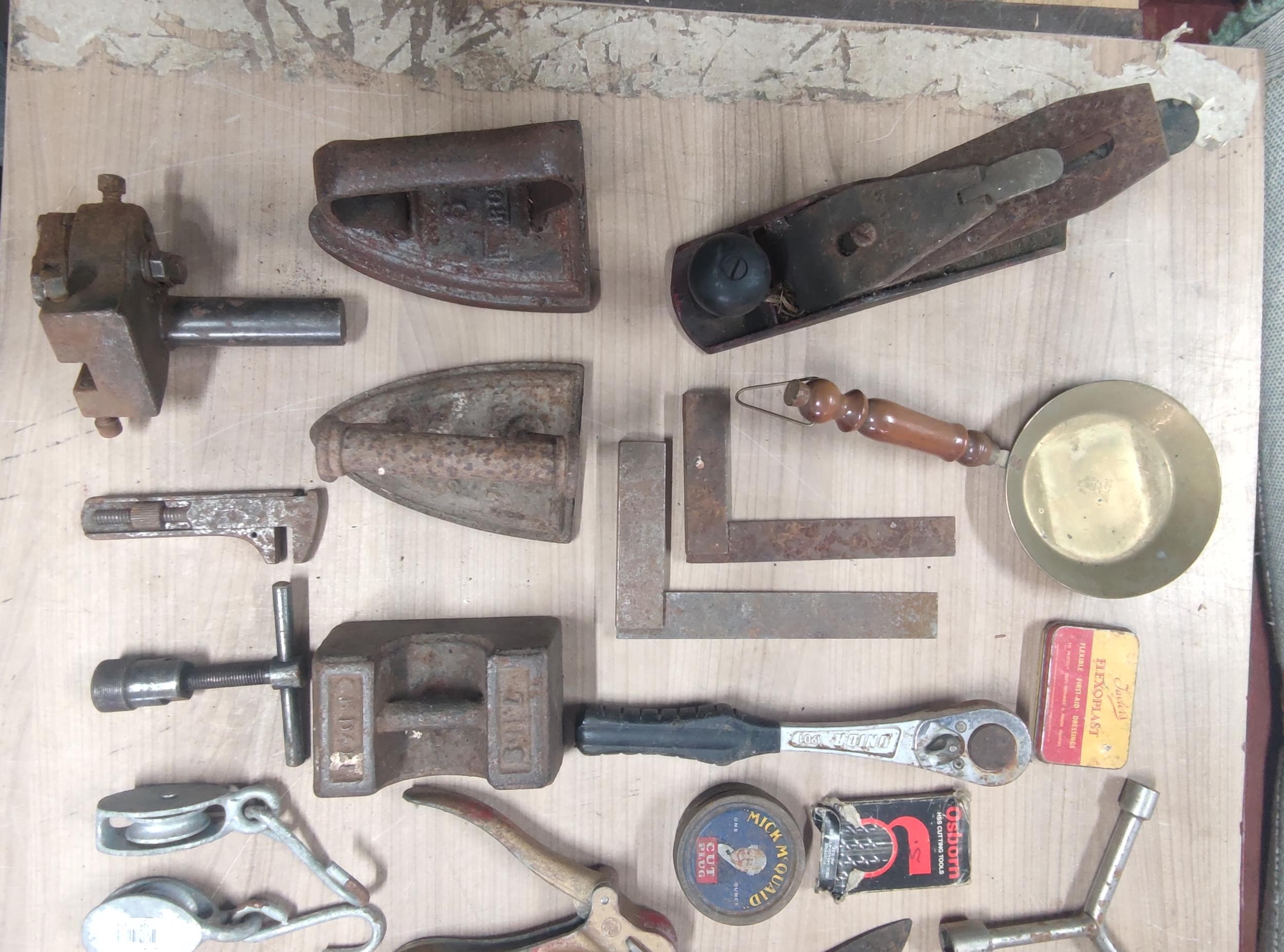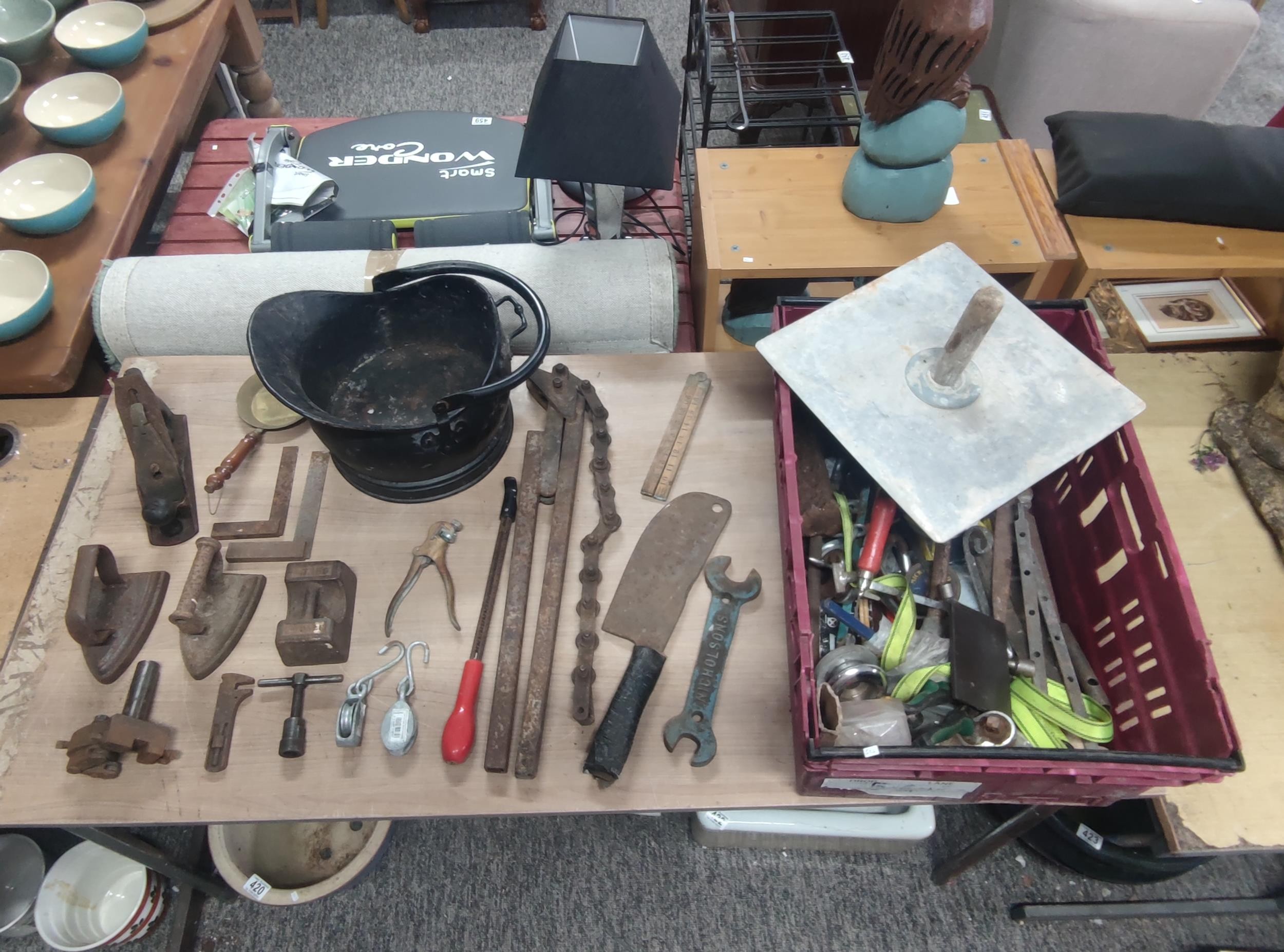 Large crate of shed odds to include a good quality coal scuttle, mortar board, meat cleaver, vintage cast iron irons, spanners etc