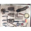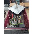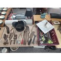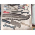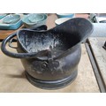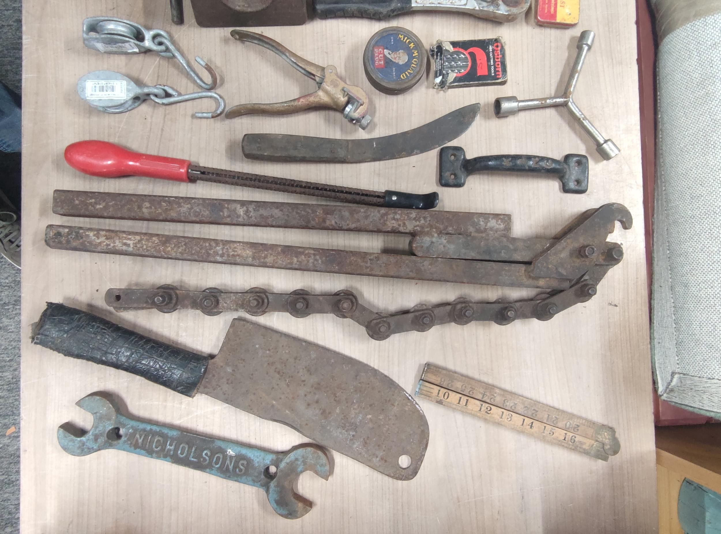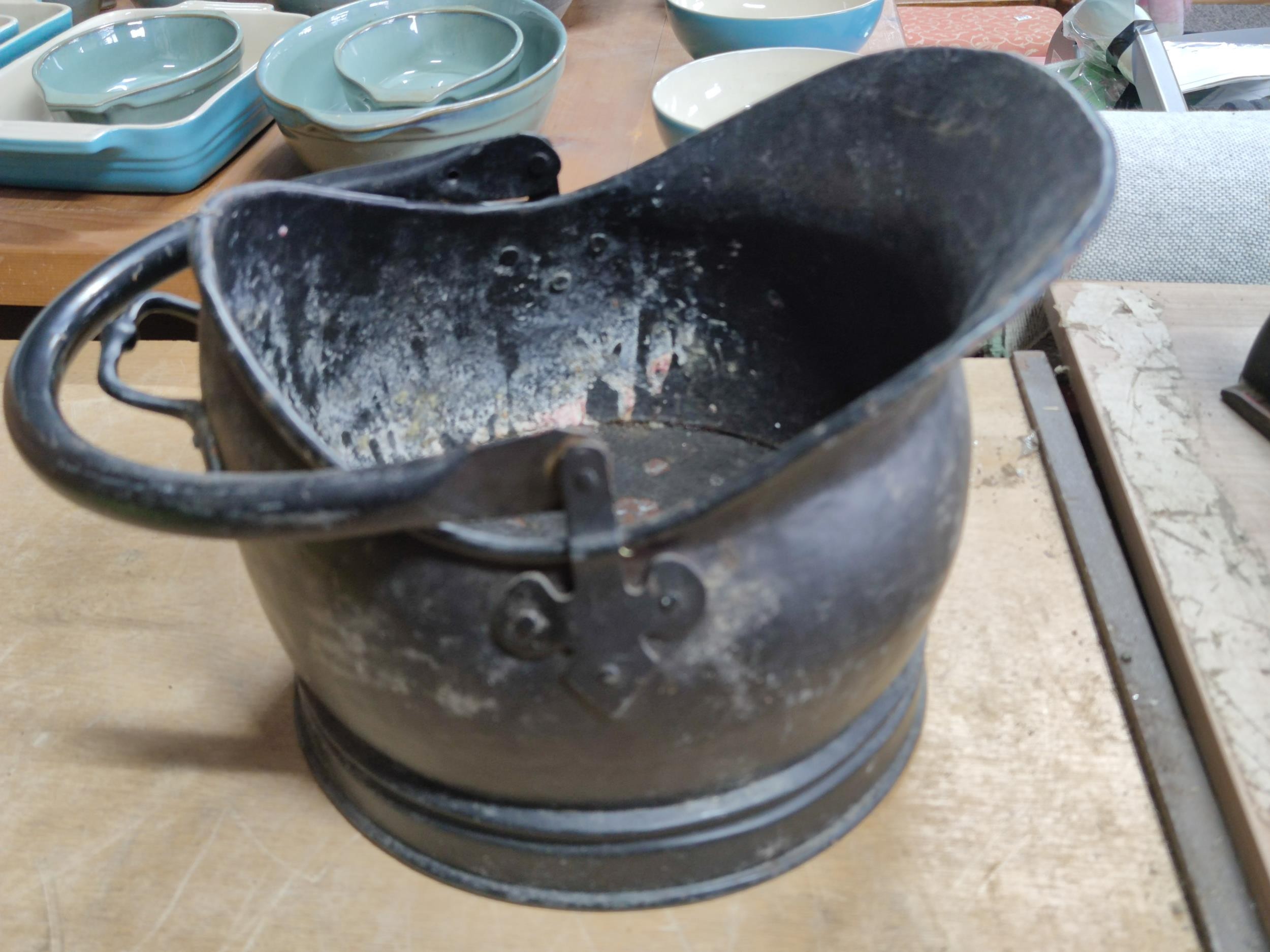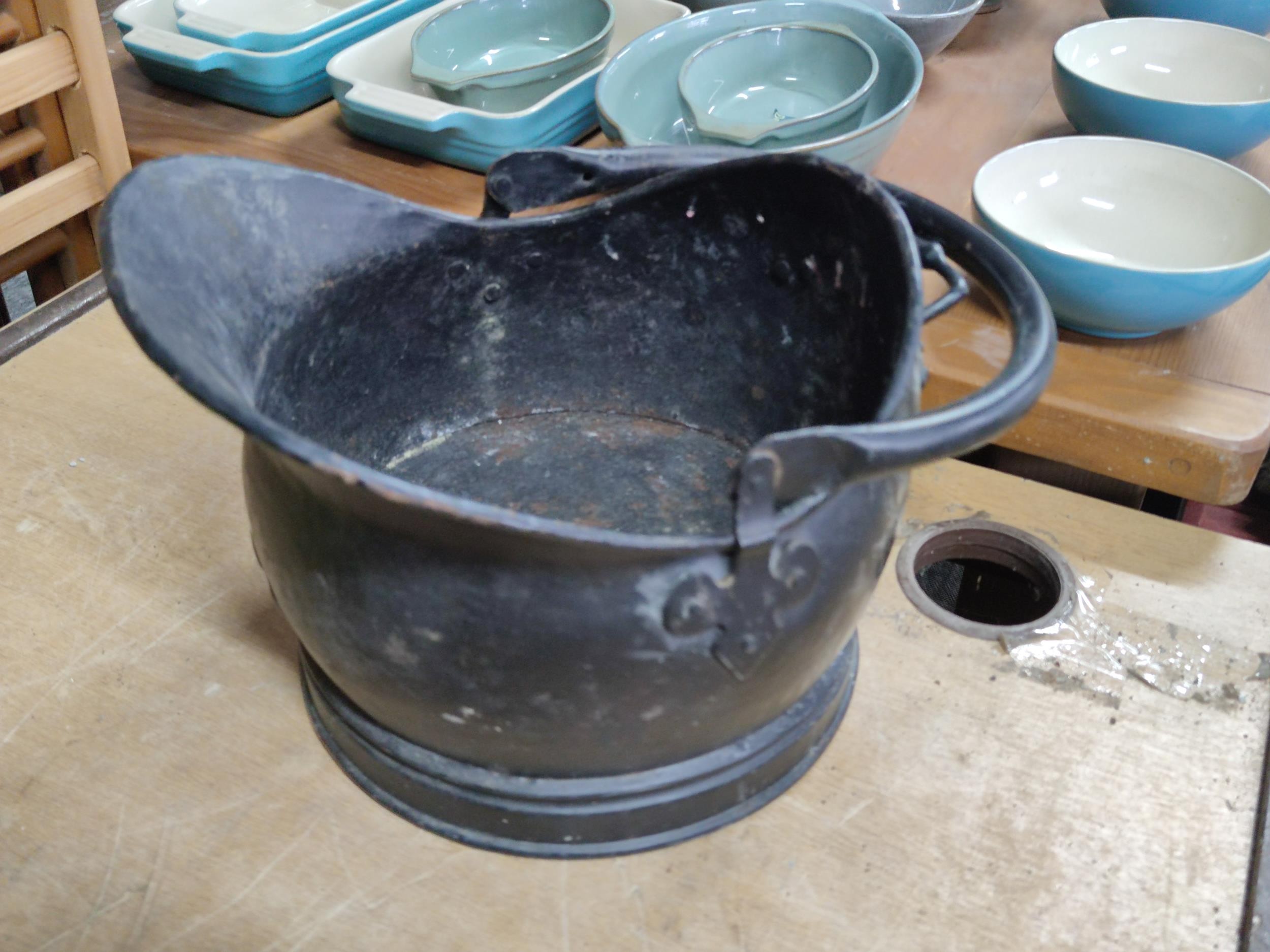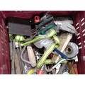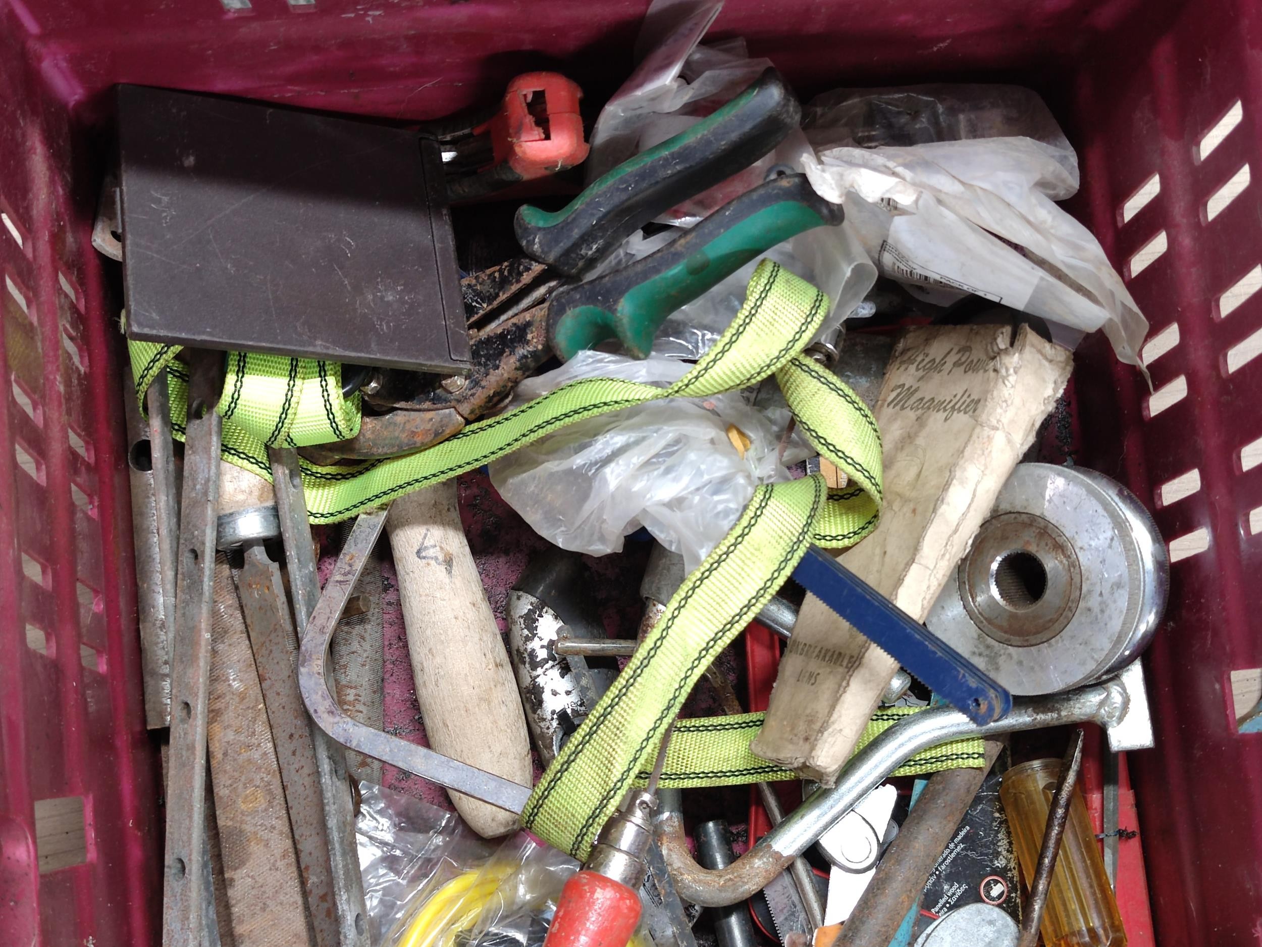 Large crate of shed odds to include a good quality coal scuttle, mortar board, meat cleaver, vintage cast iron irons, spanners etc