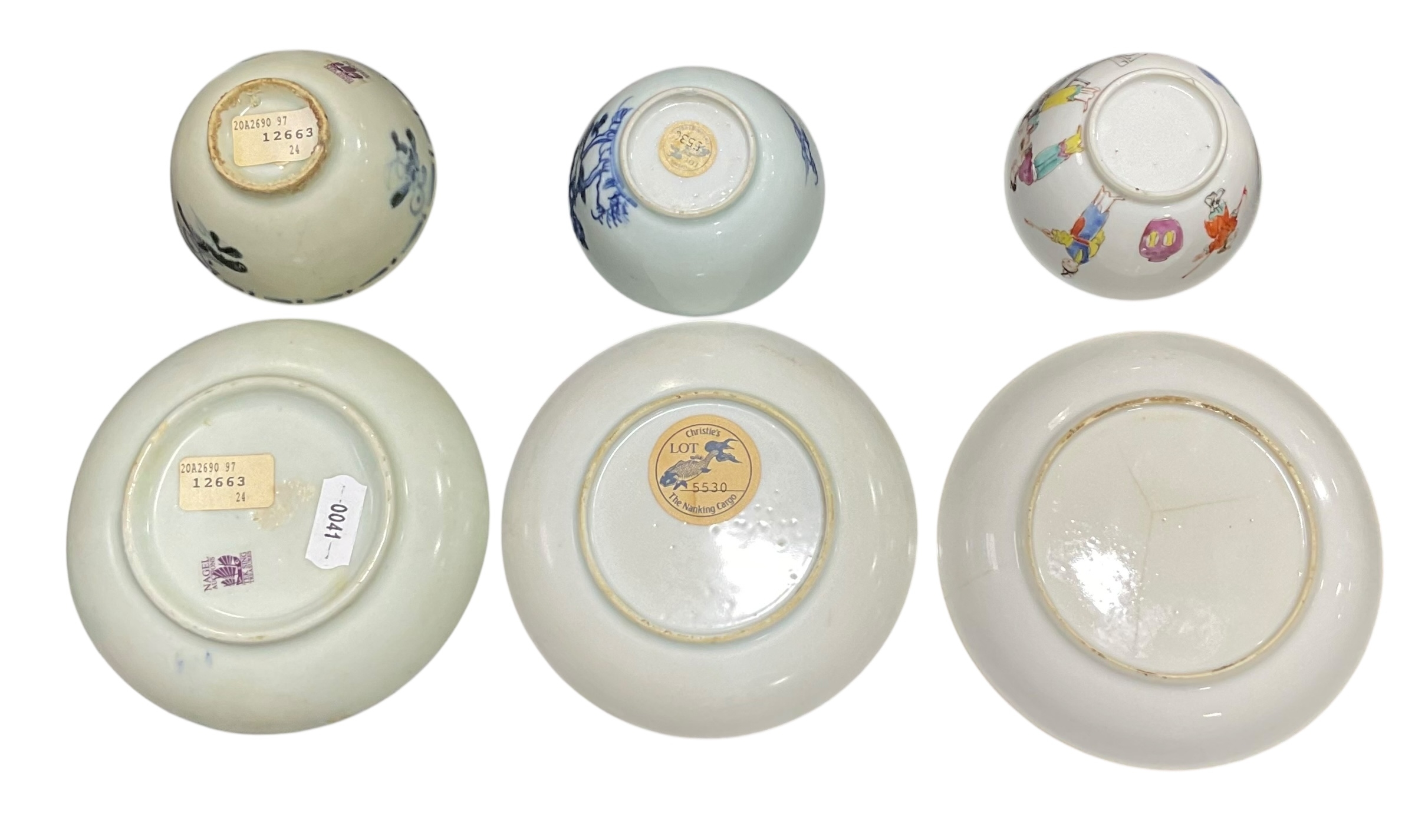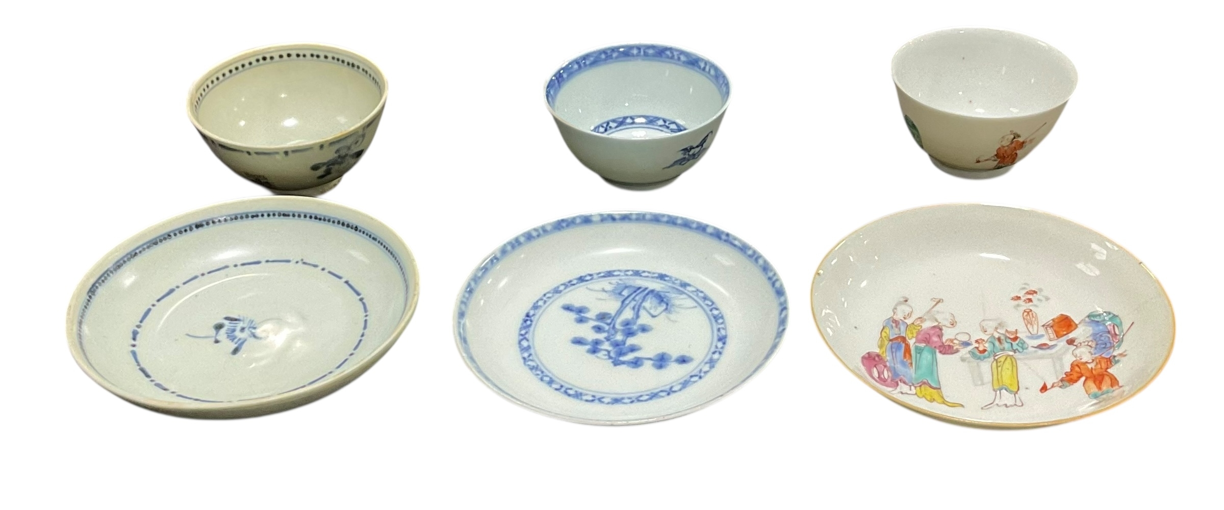 3 Chinese Tea Bowls & Saucers Incl. Tek Sing , Nanking & a Polychrome Example with Oriental Figures.