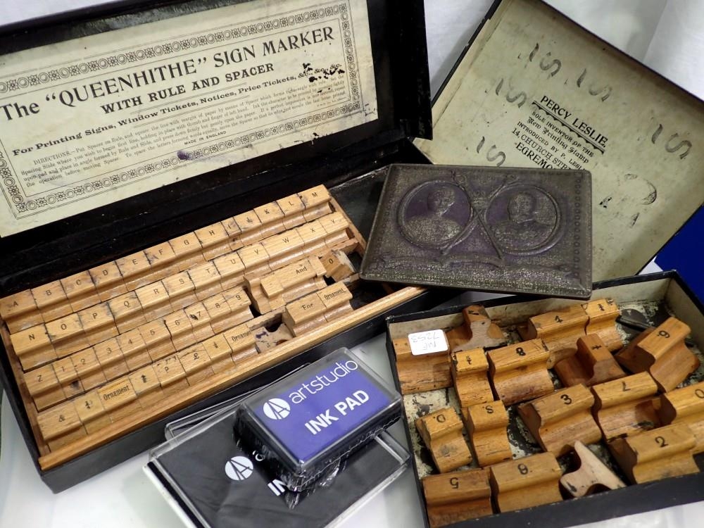 The 'Queen Hithe' sign marker printing letter stamps and Percy Leslie numbers with ink pads. UK P&P Group 1 (£16+VAT for the first lot and £2+VAT for subsequent lots)