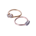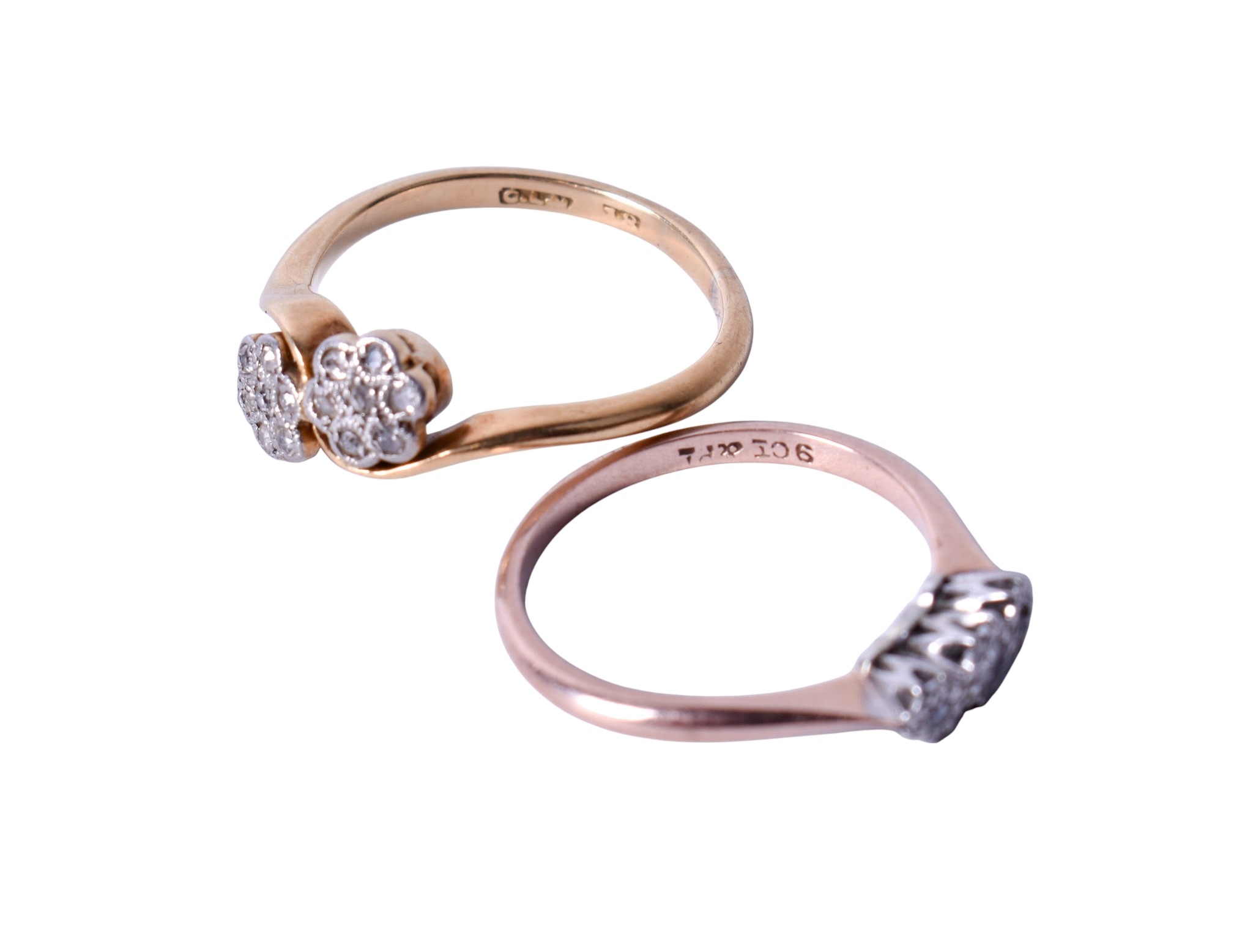 Two gold and diamond rings. The first with two flower form clusters, marked 18ct, size O1/2, this gross weight 3.5g; the second with three small illusion set diamonds, marked 9ct & PLAT, size N, this gross weight 2g.