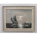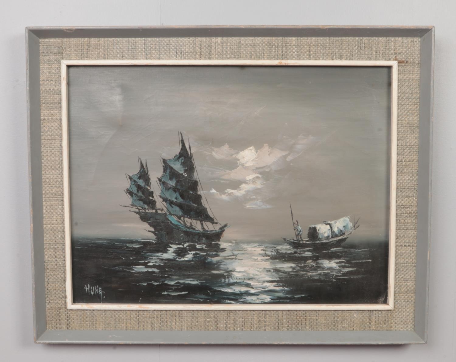 A framed oil on canvas, seascape with boats. Signed Hune.