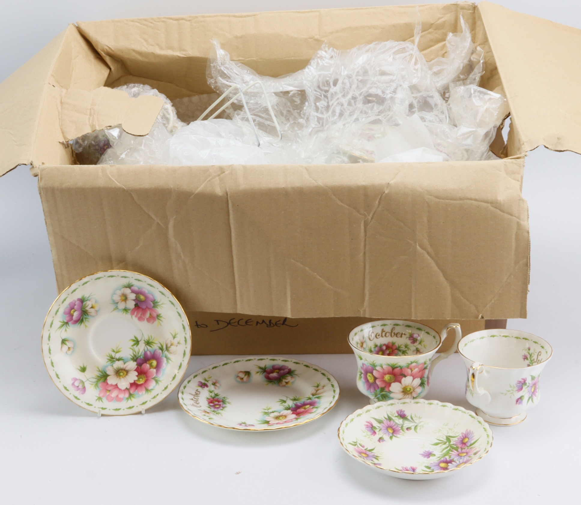 Royal Albert Flower of the Month Series trio set, comprising twelve month of the year cups, twelve saucers & twelve side plates