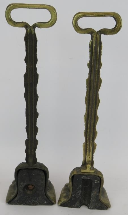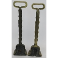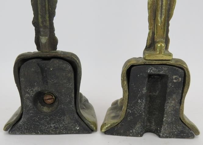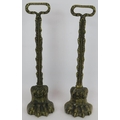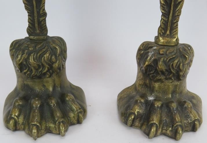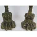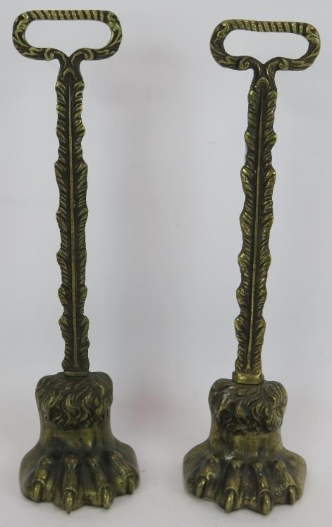 A pair of cast brass lion's paw door porter door stops with weighted bases. Height 38cm. (pr).