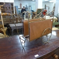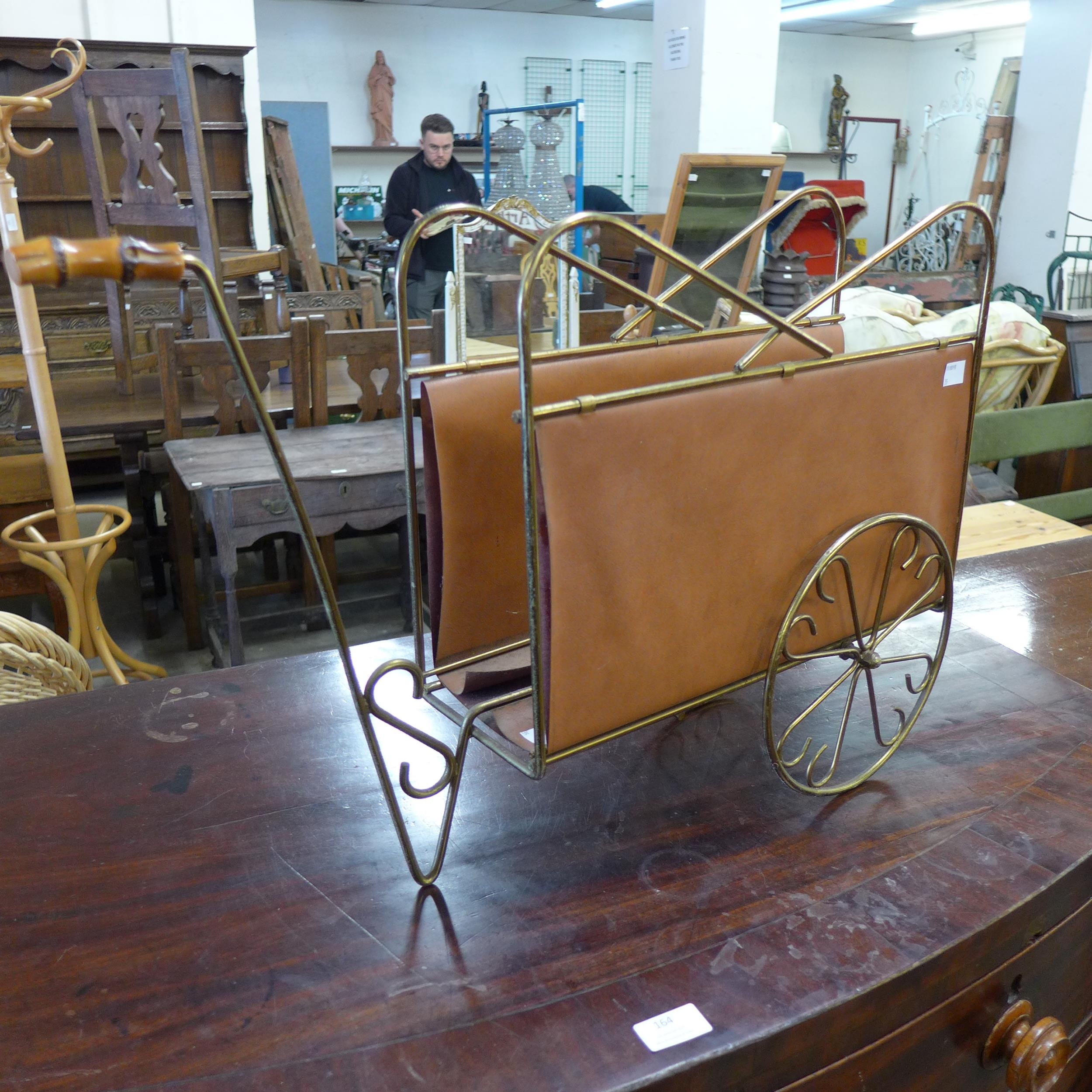 A brass and tan leather cart shaped magazine rack