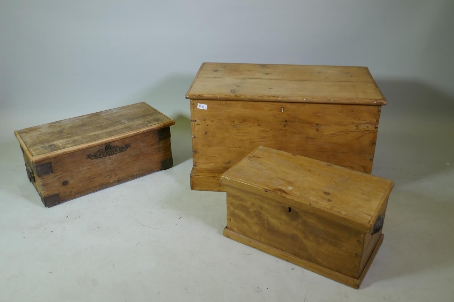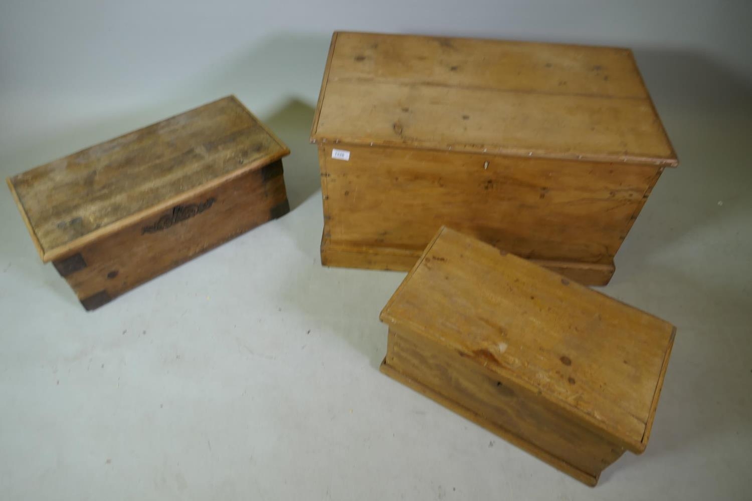 Stripped pine blanket box, 80 x 46 x 46cm, a stripped elm box and small pine box