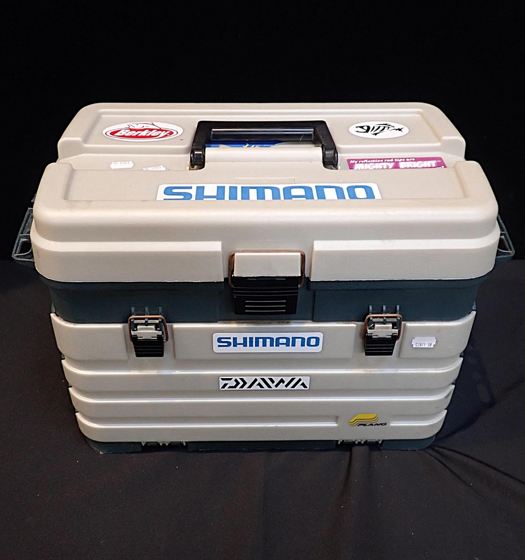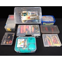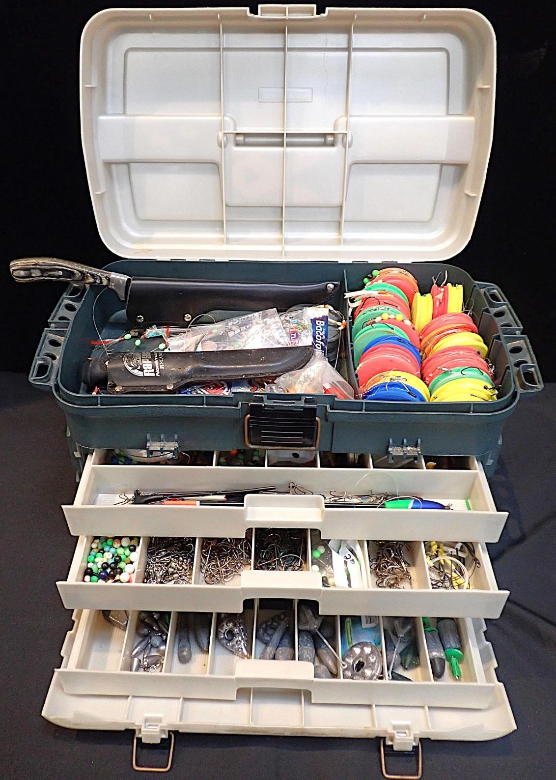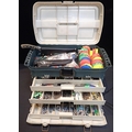 A FISHING TACKLE BOXcontaining various fishing tackles, comprising: fishing knives, lures, hooks, traces.