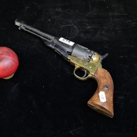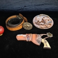 Four Western themed items including a tan leather belt, belt buckle and a John Wayne 'Straight Shooter' wall plaque in the form of a pistol housed in a holster.