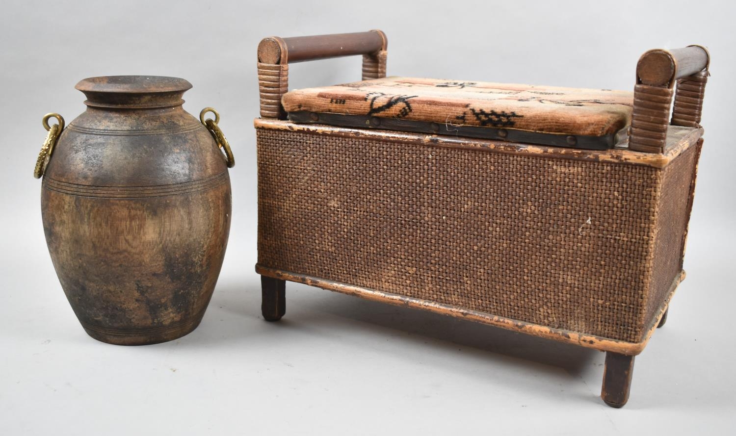 A Vintage Rectangular Loom Type Stool Together with an Amphora Type Vase, 24cm high