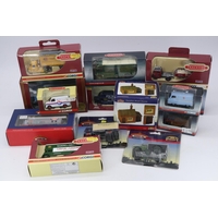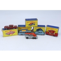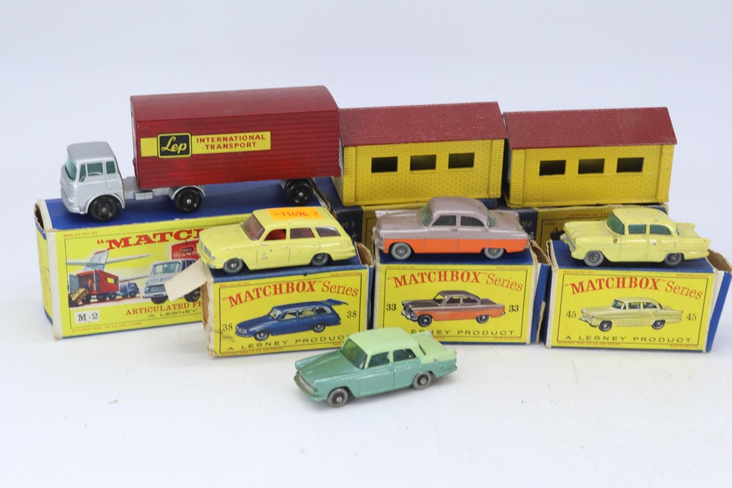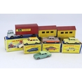 Matchbox Lesney two boxed garages, Vauxhall Victor, Zodiac, Major pack M2 and a yellow Vauxhall Victor all showing signs of playware