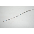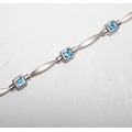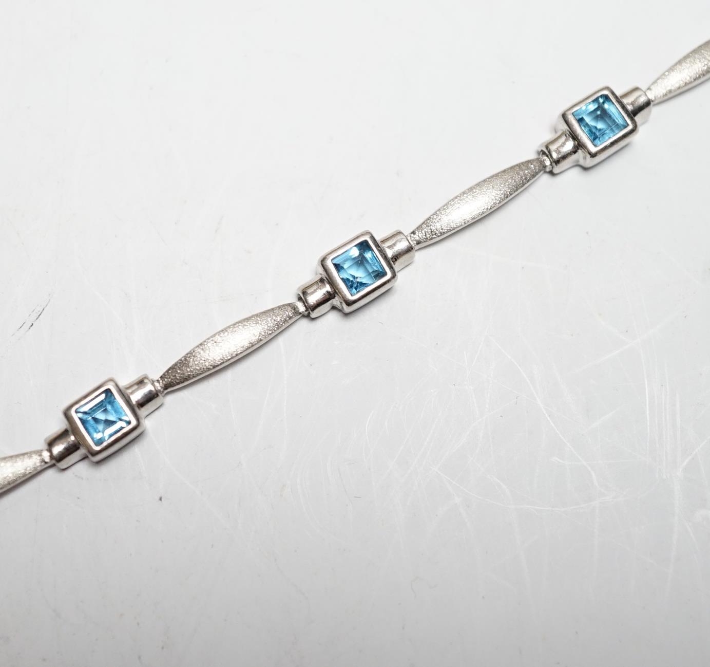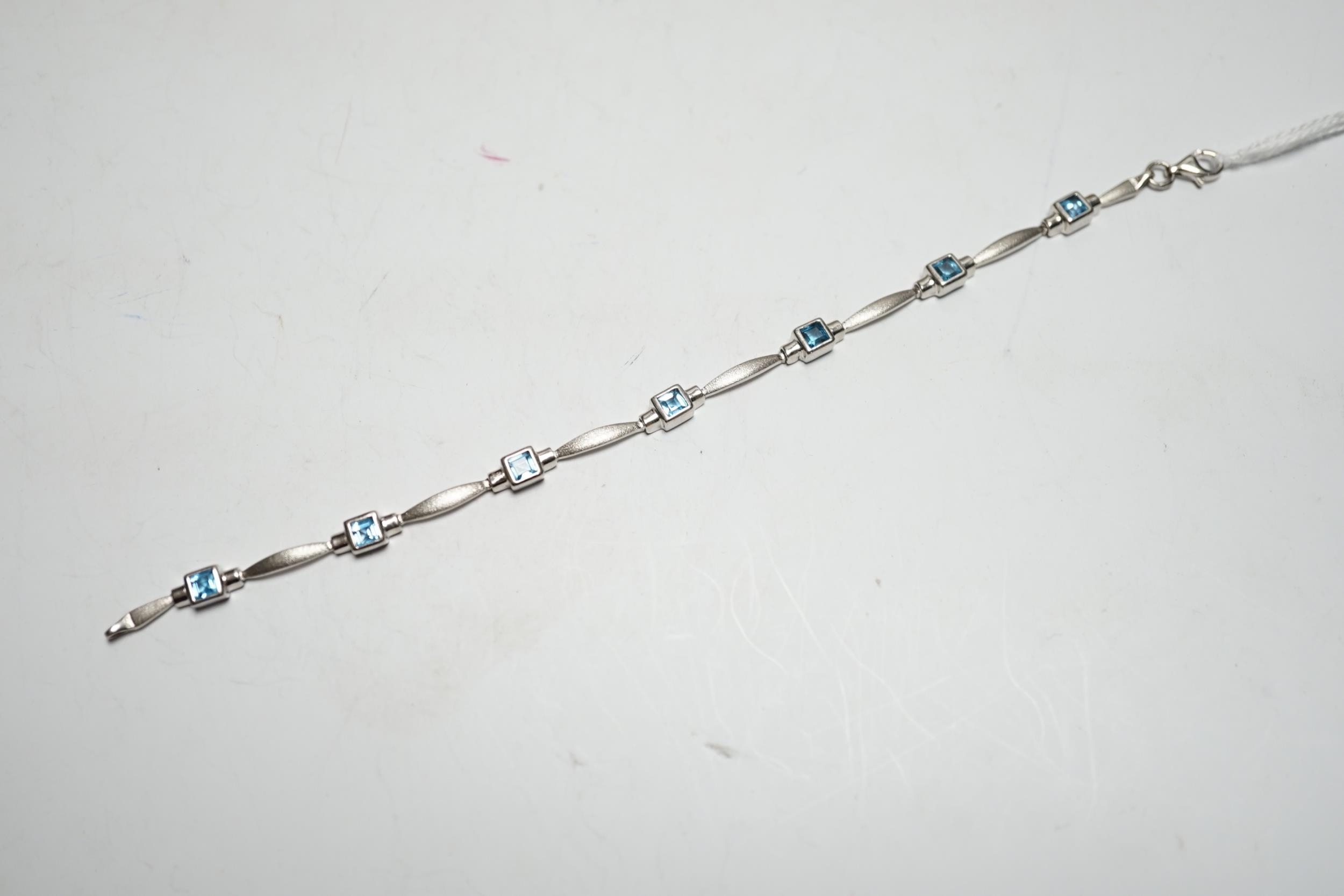 A modern brushed 9ct white gold and seven stone square cut blue topaz? set bracelet, 18cm, gross weight 8.5 grams.
