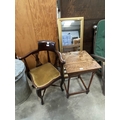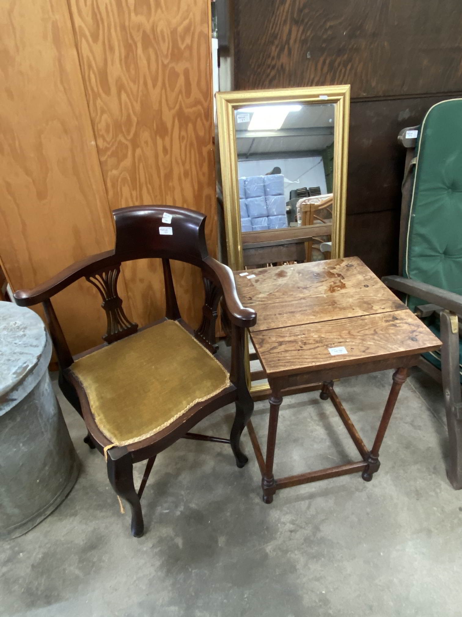 Antique mahogany corner chair 81H 60W, gilt framed mirror 110 x 44cm & an oak occasional table 62H 43W 43D