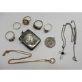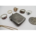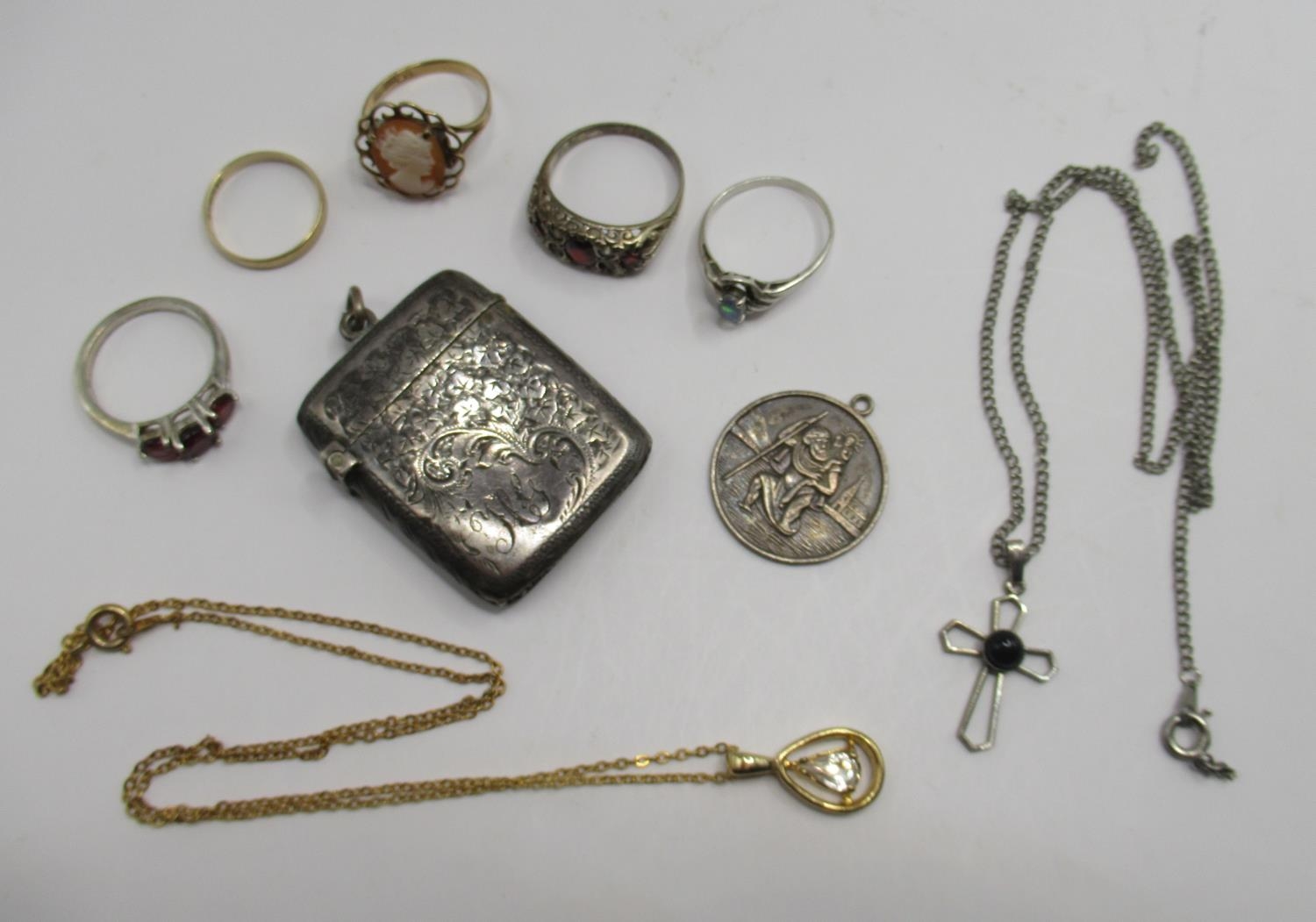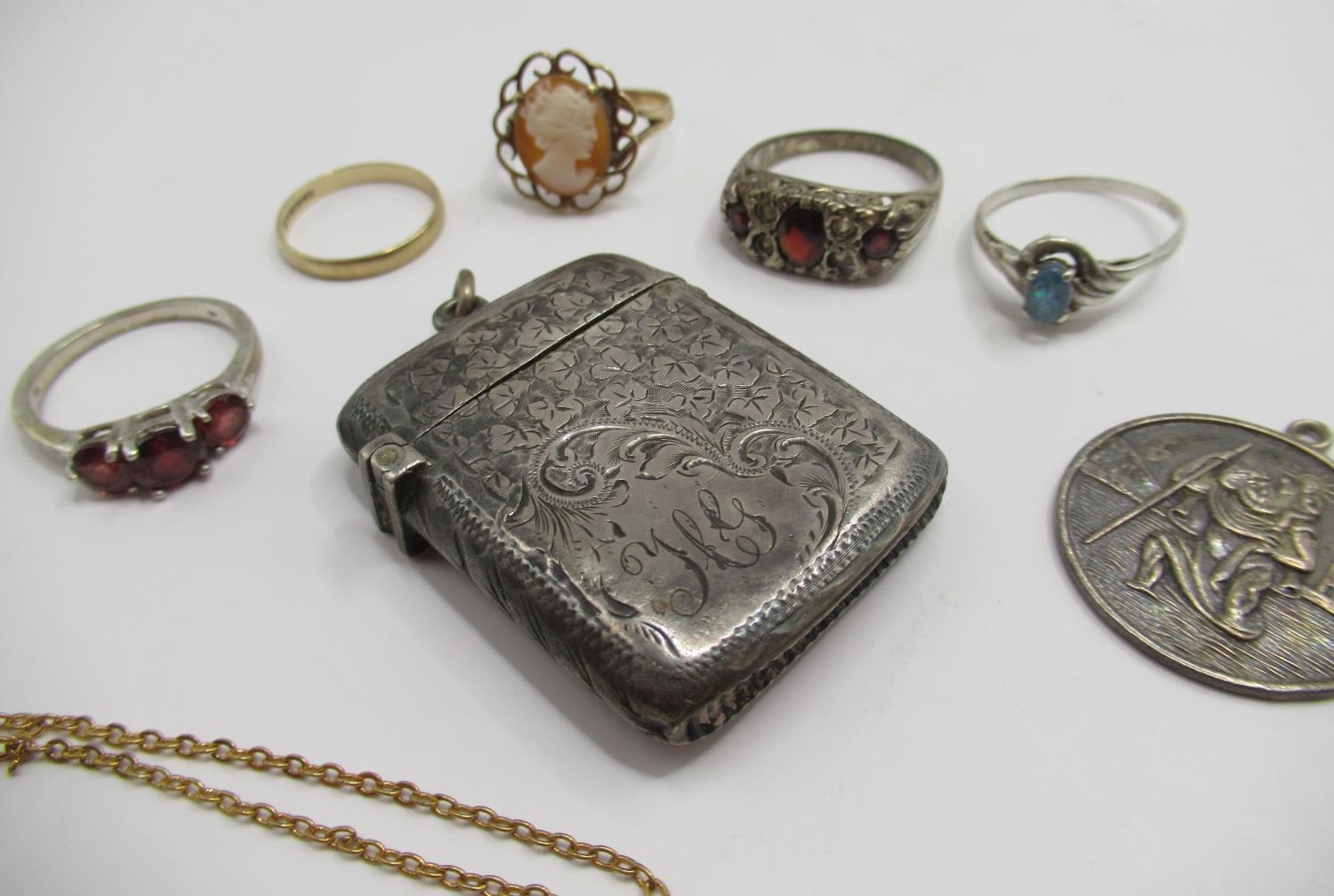 9ct gold band ring, size L1/2, a 9ct yellow gold cameo ring, size M, both stamped 375, 3.05g, a collection of silver rings, a silver St. Christopher pendant, a silver vesta with foliage detail, all hallmarked or stamped silver, 1.01ozt, and two metal necklaces