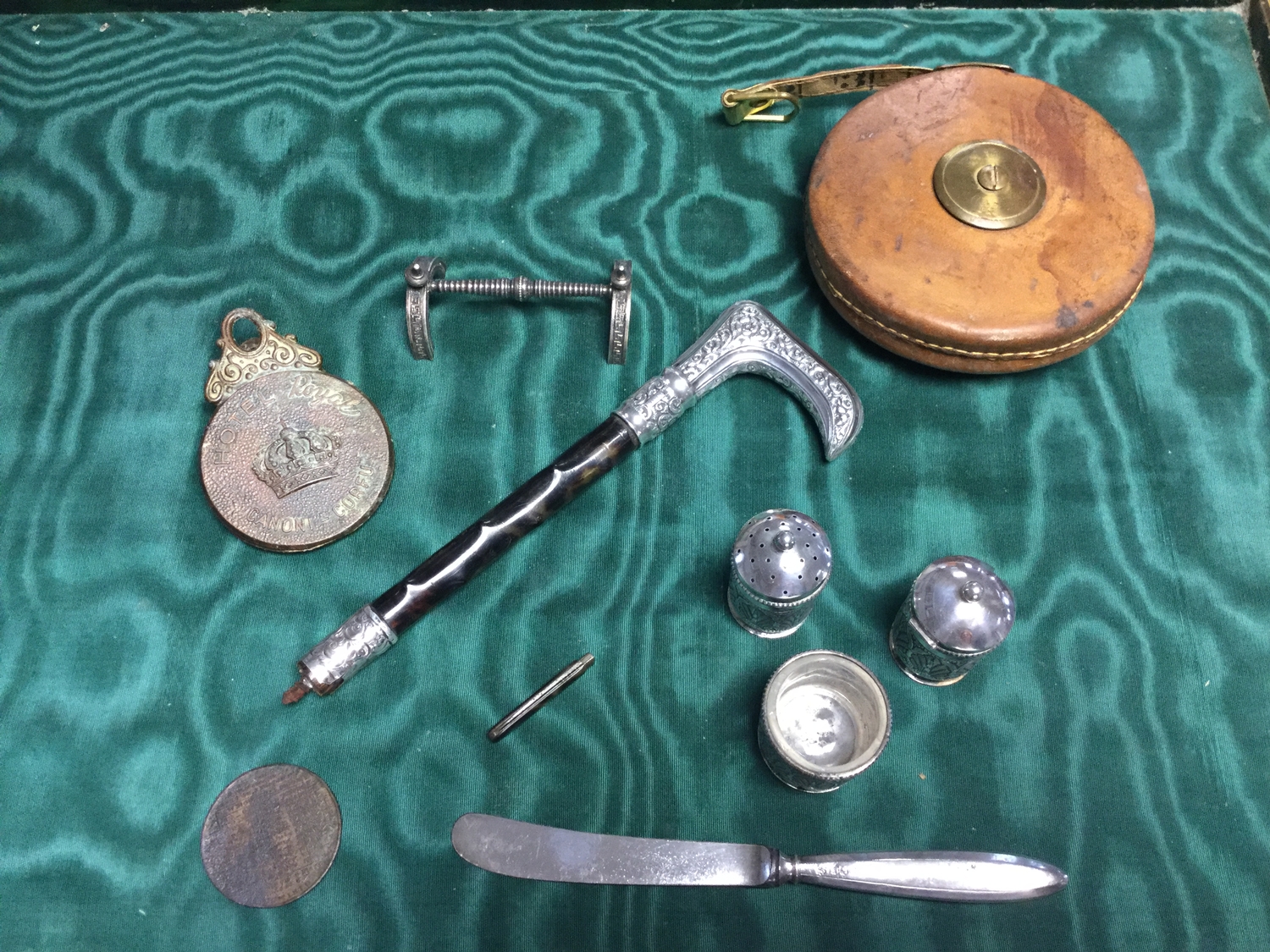 together with a cruet, pocket knife, desk paperclip, pocket calendar etc -