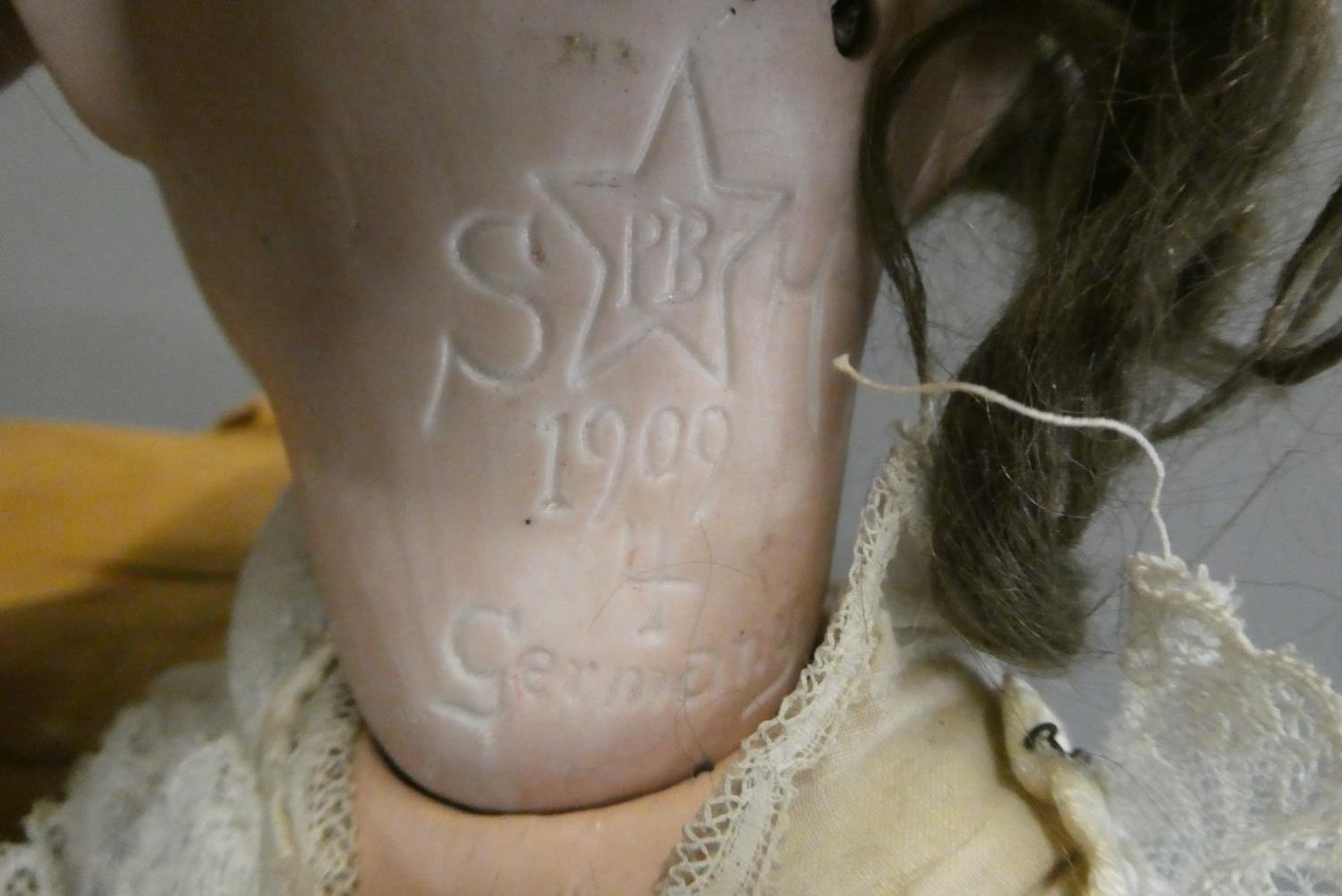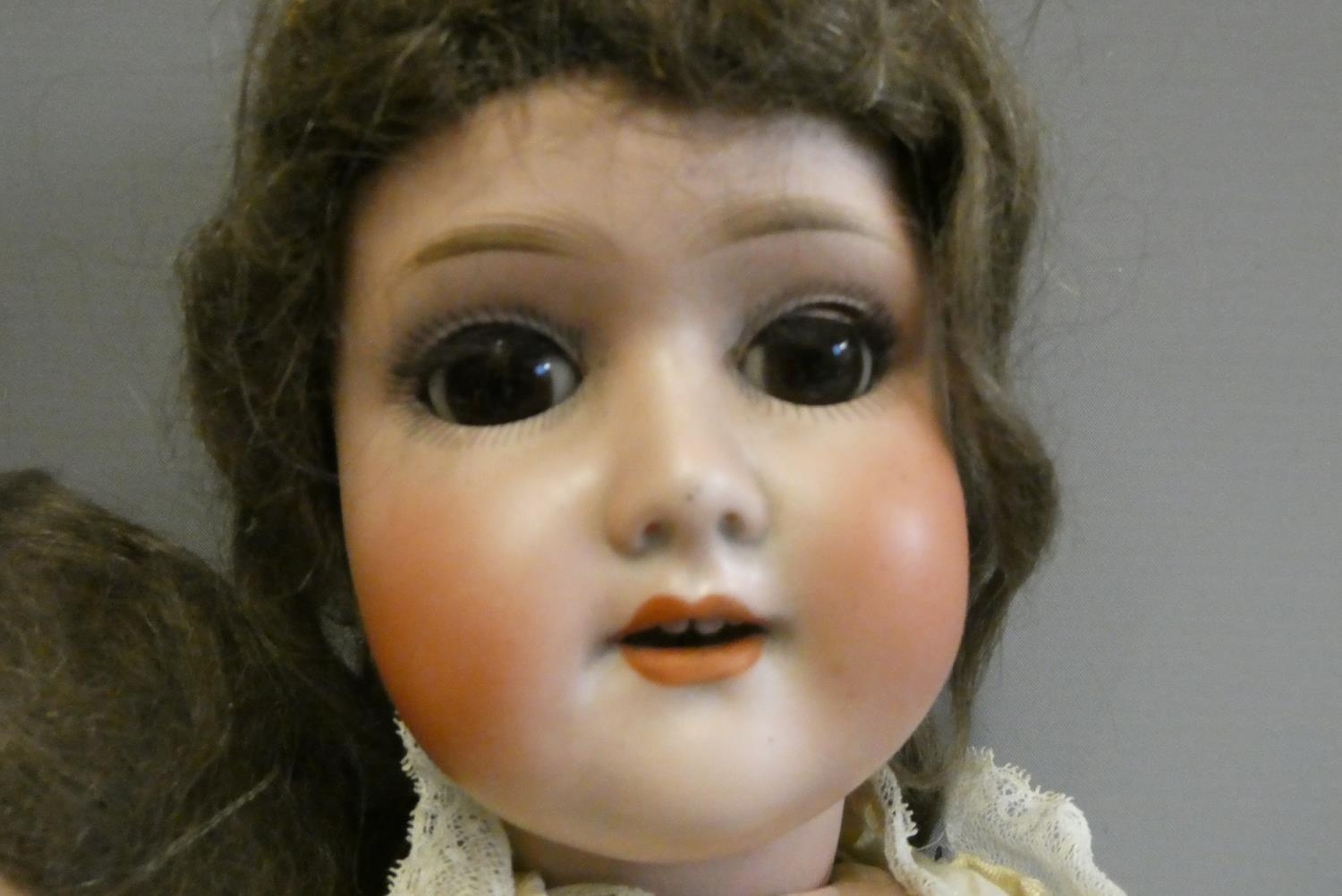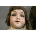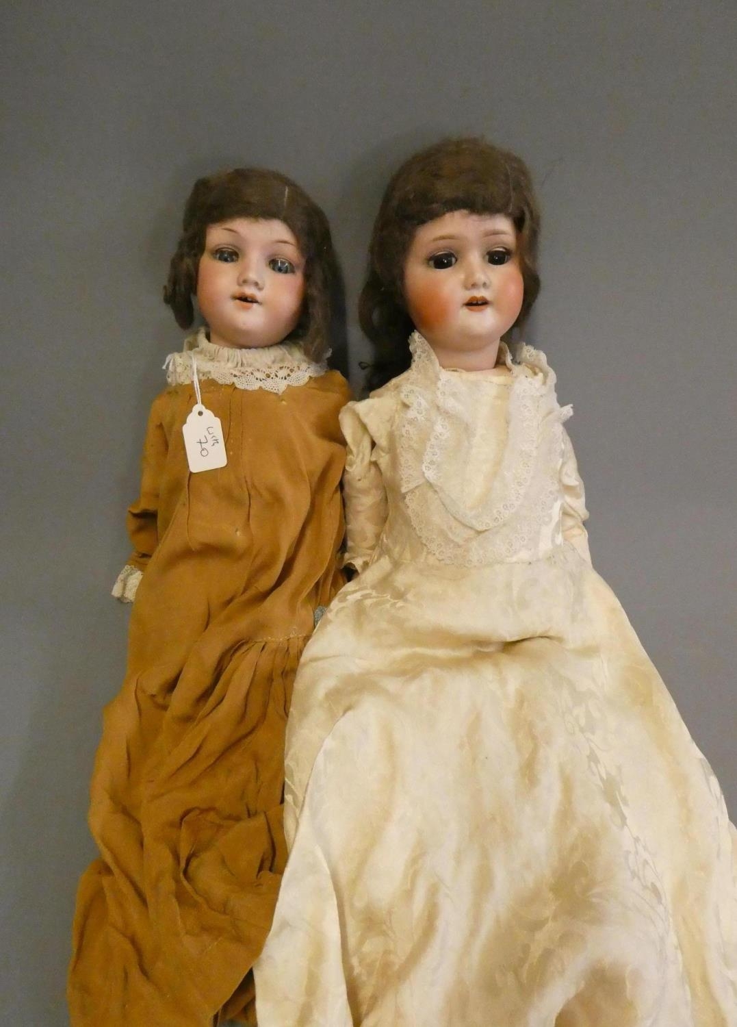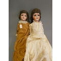 Two German bisque socket head dolls, comprising a 21" Schoenau & Hoffmeister 1909 4 with brown glass sleeping eyes and white dress and a 17" Armand Marseille 390 2 1/2 with blue glass sleeping eyes and brown dress, both with open mouths and wood and composition jointed bodies