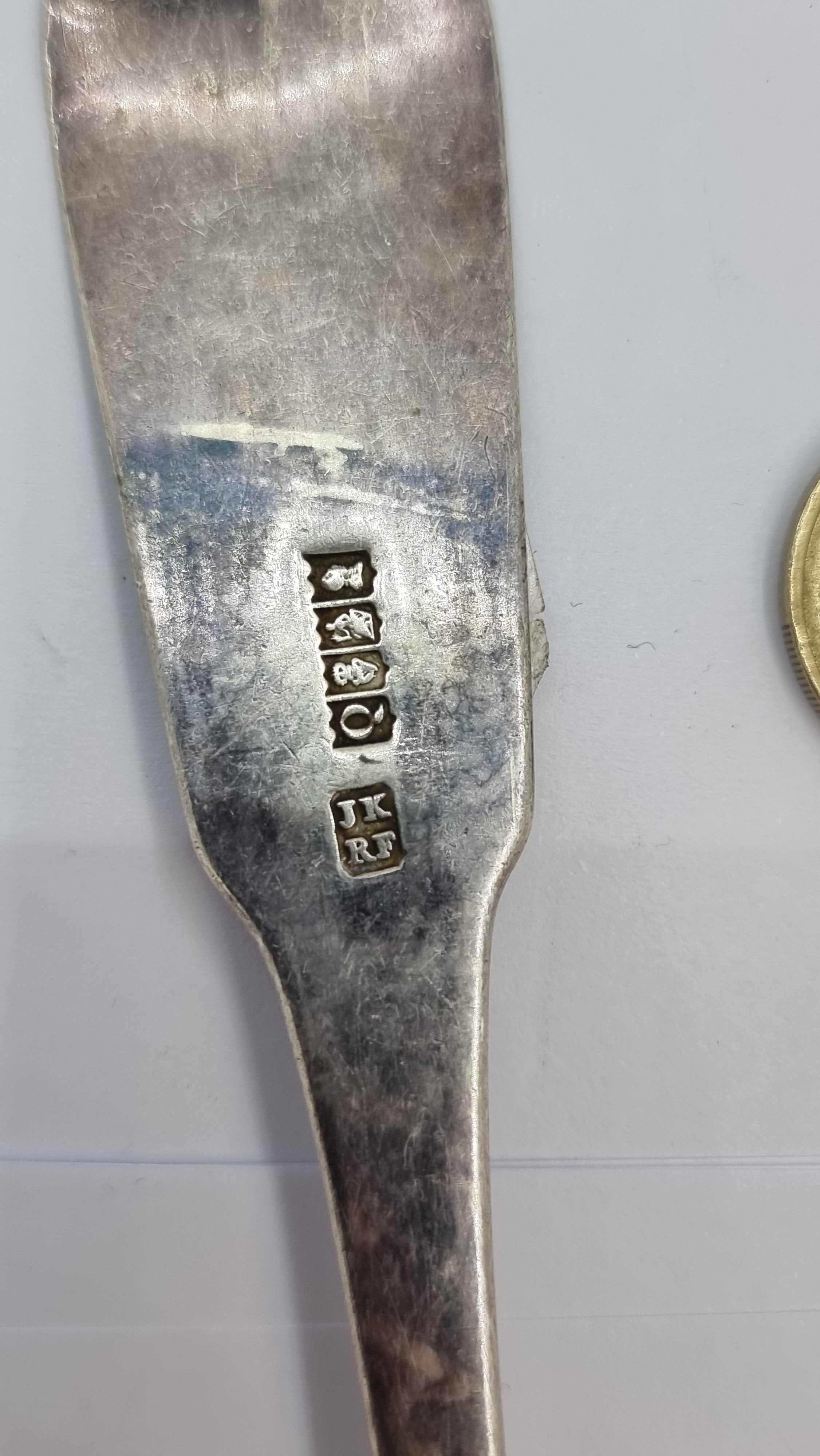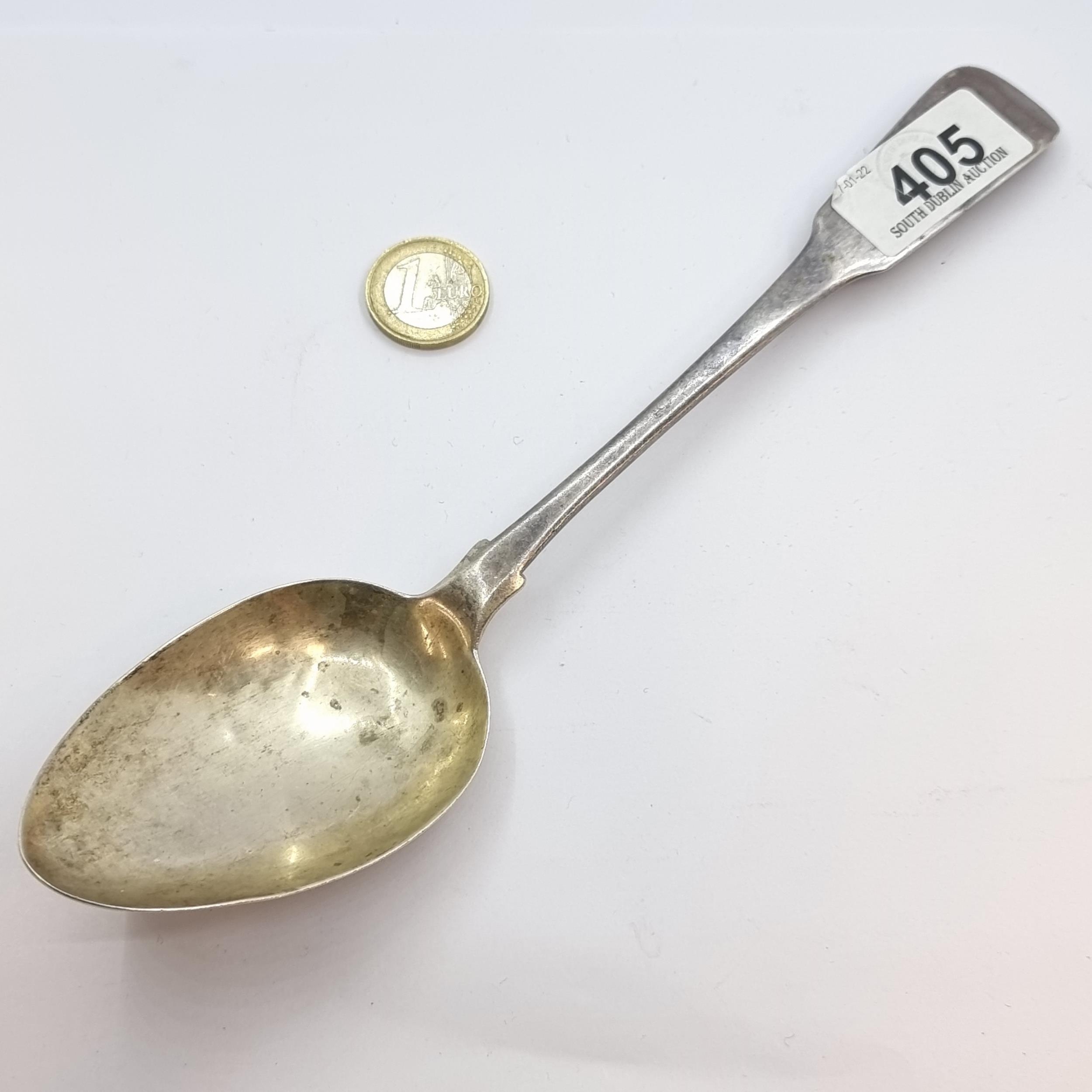 A nice example of a large George III Irish silver serving spoon, in fiddle pattern design. Hallmarked Dublin 1812, maker James Keating & Richard Flood. A nice, clean example. Weight 62g.