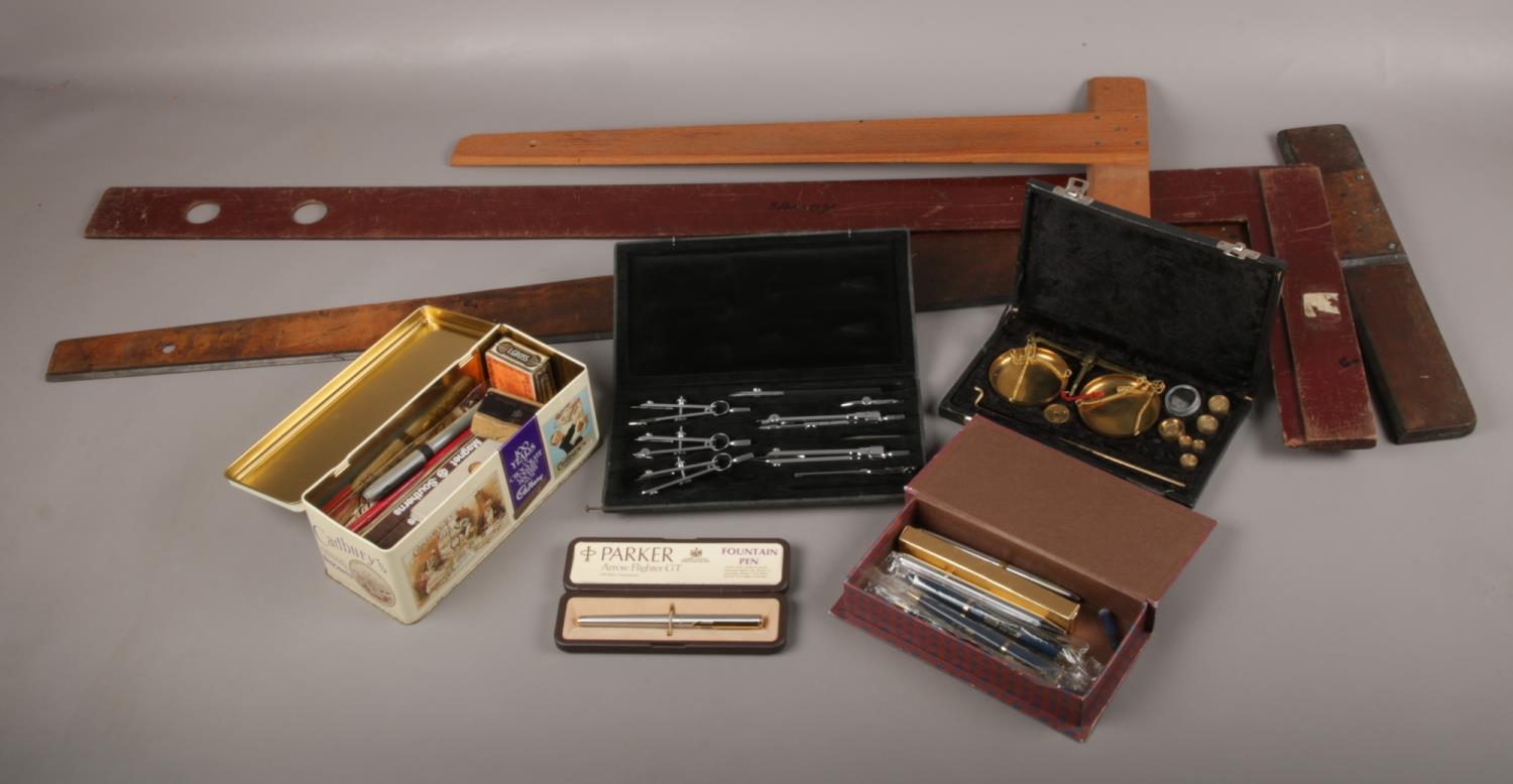 A collection of drawing equipment, to include draughtsman's squares, pen nibs, cased scales etc.