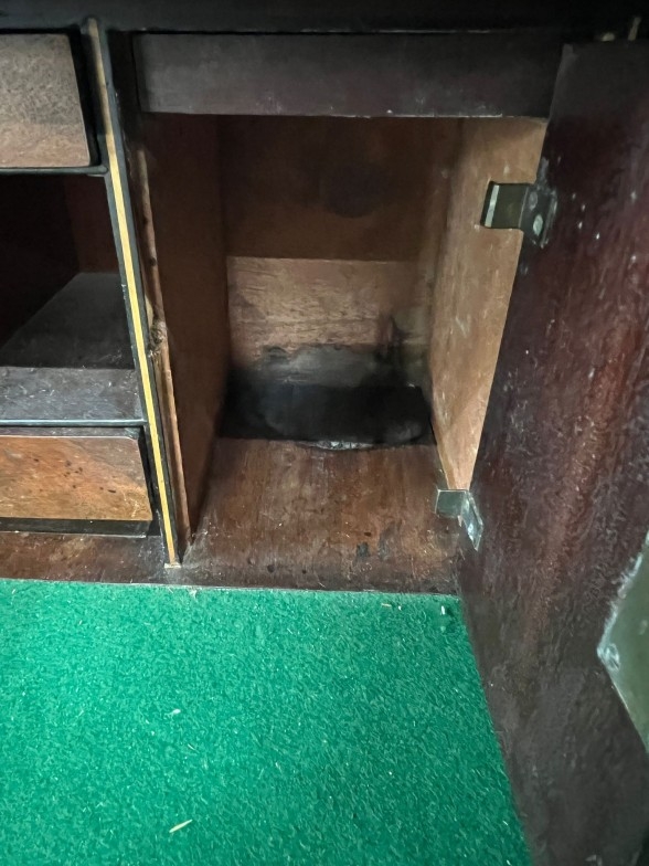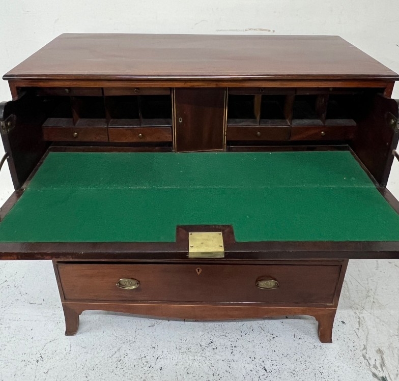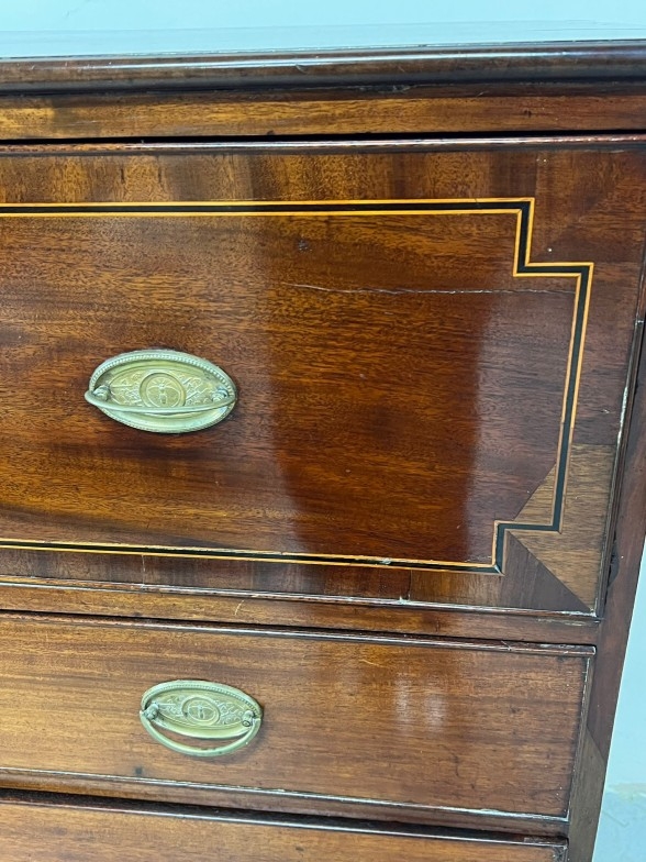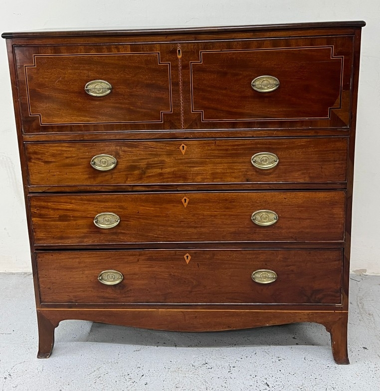 Secretaire chest of drawers, the large top drawer drops down to a fitted interior and string inlay H114cm W110cm D49cm