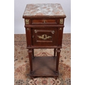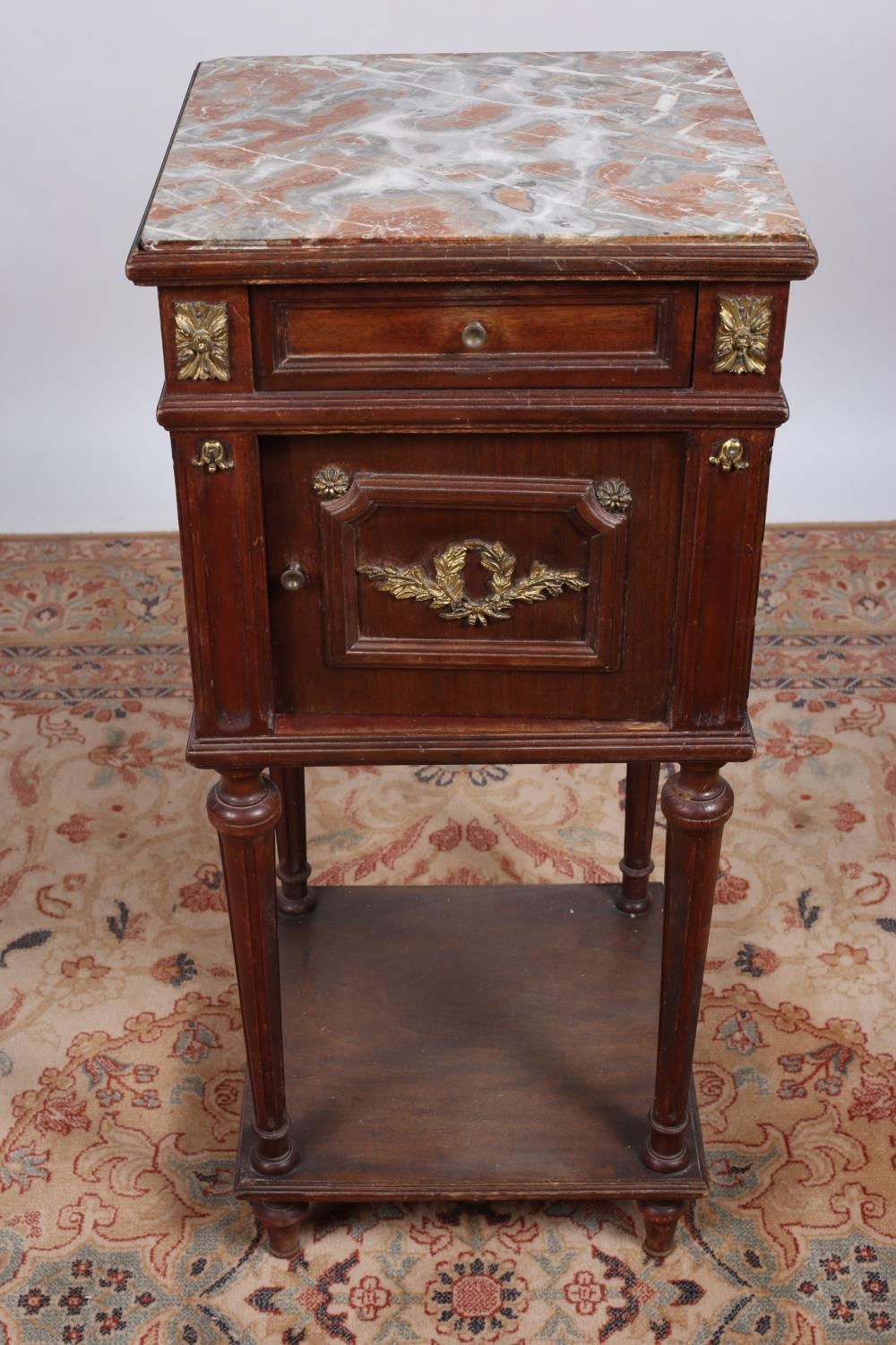 A 19TH CENTURY CONTINENTAL KINGWOOD AND GILT BRASS MOUNTED PEDESTAL with veined marble inset and frieze drawer with cupboard on reeded tapering legs with open compartment on moulded legs 87cm (h) x 38cm (w) x 38cm (d)