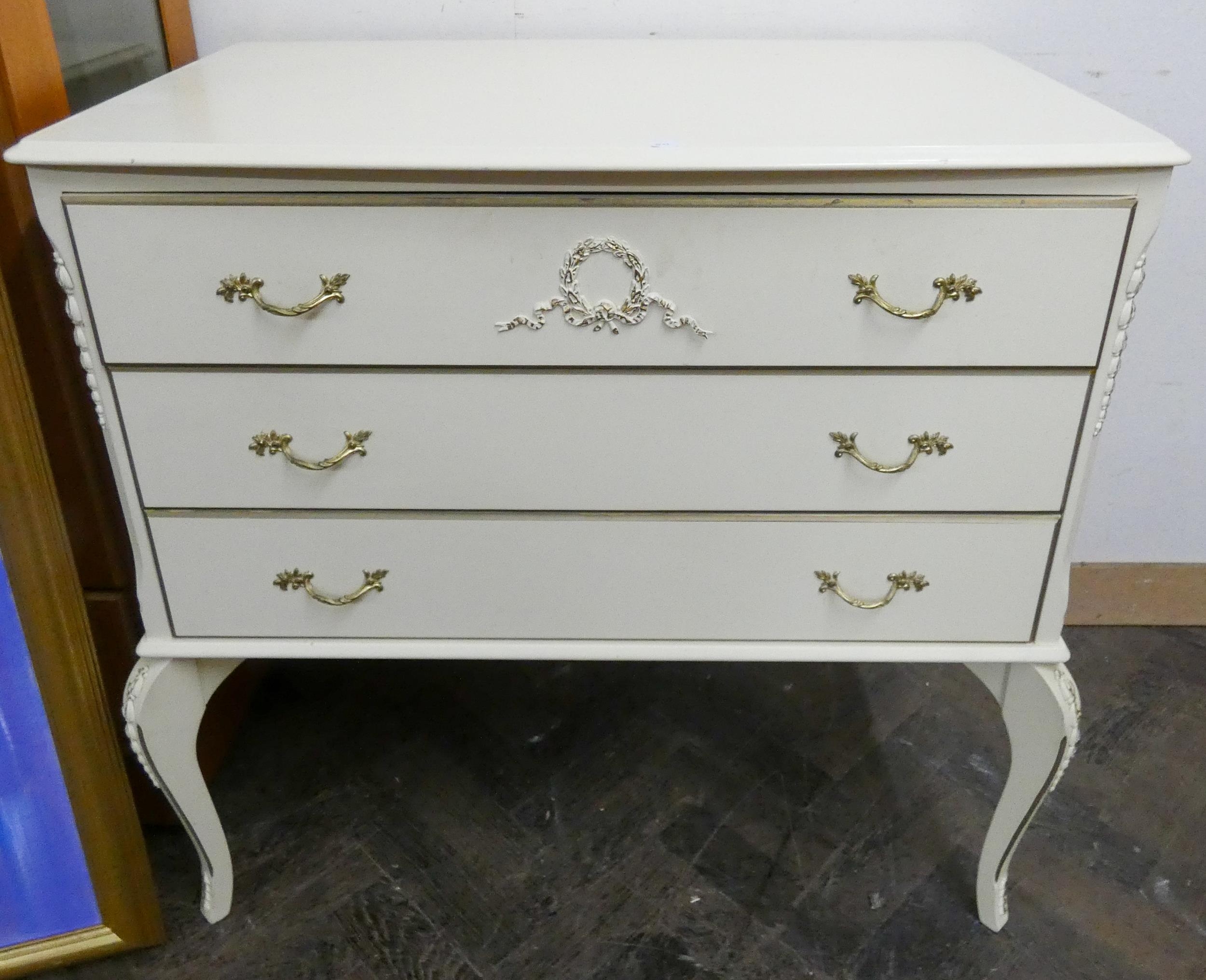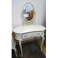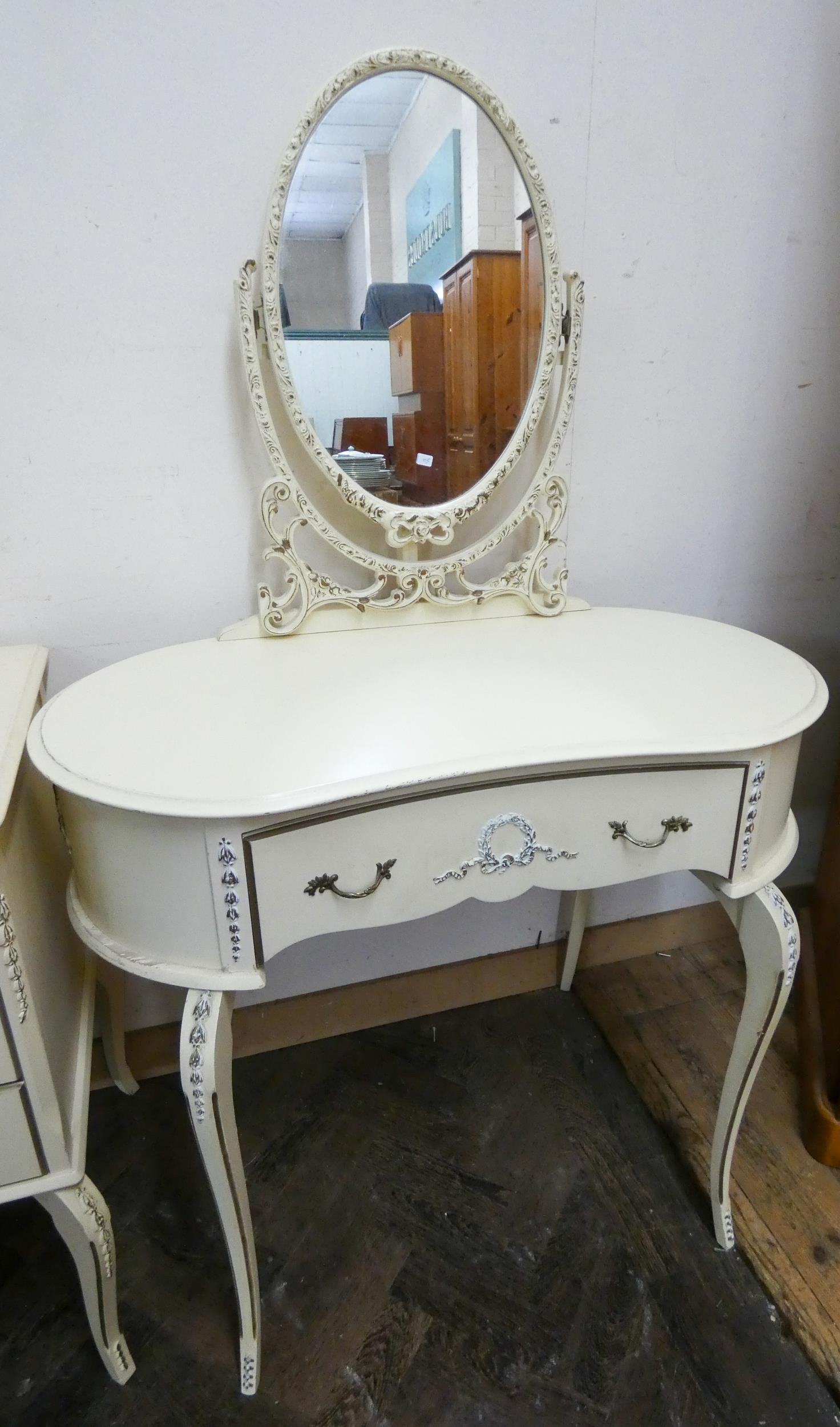 A kidney shaped French style cream and gilt dressing table with triple mirror and a matching side chest