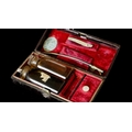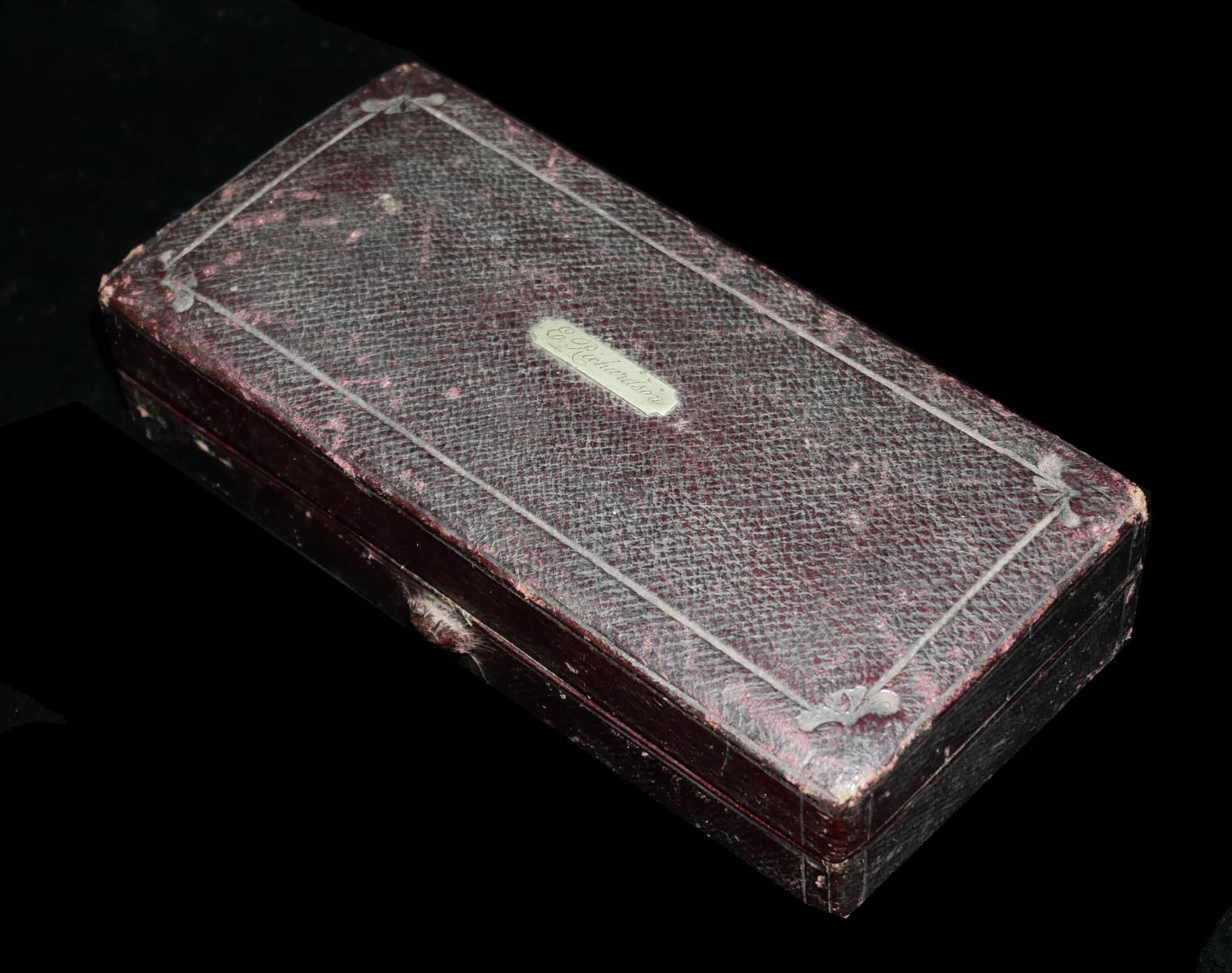 Comprising two glass bottles and a white metal accessory, in a fitted velvet lined leather clad box, marked ‘E Richardson’ to cartouche and bearing the label 'McLellan Bros 03 Turner St, Whitechapel, Surgical Instrument and Truss Makers to The London Hospital'.