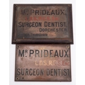 Two early 20th century dentists' brass name plates: Mr Prideaux Surgeon Dentist, each 15 x 23cm together with assorted photographic plates.